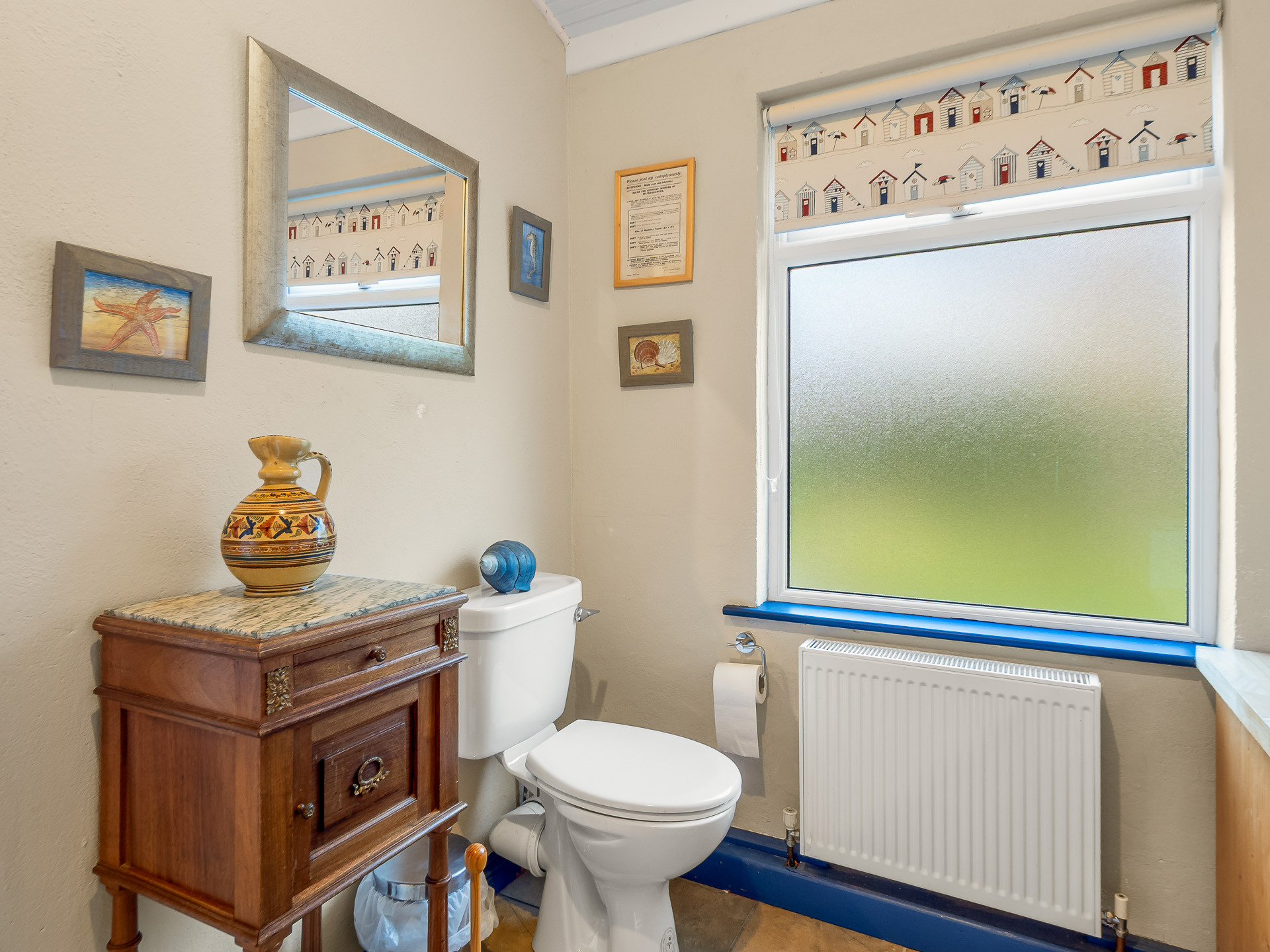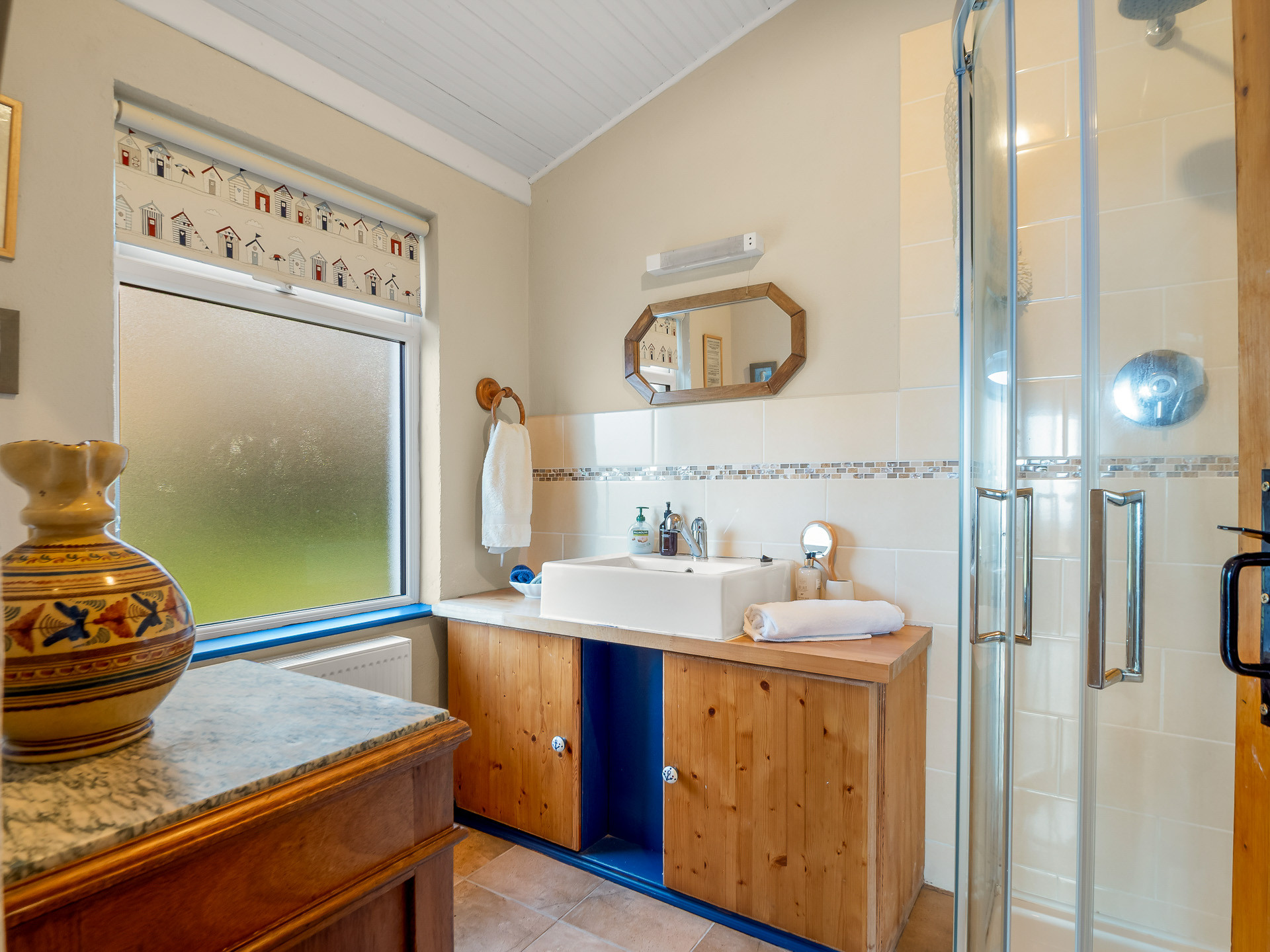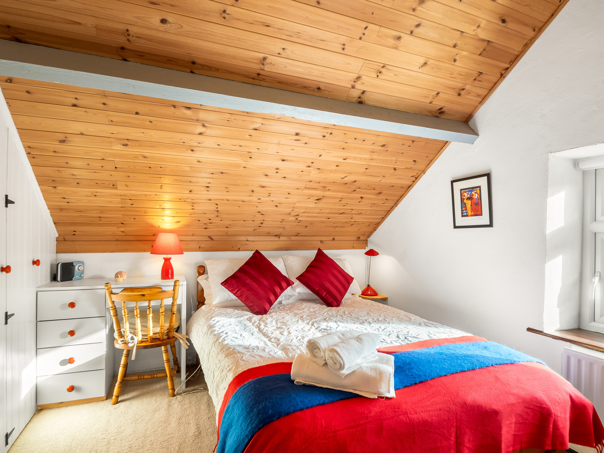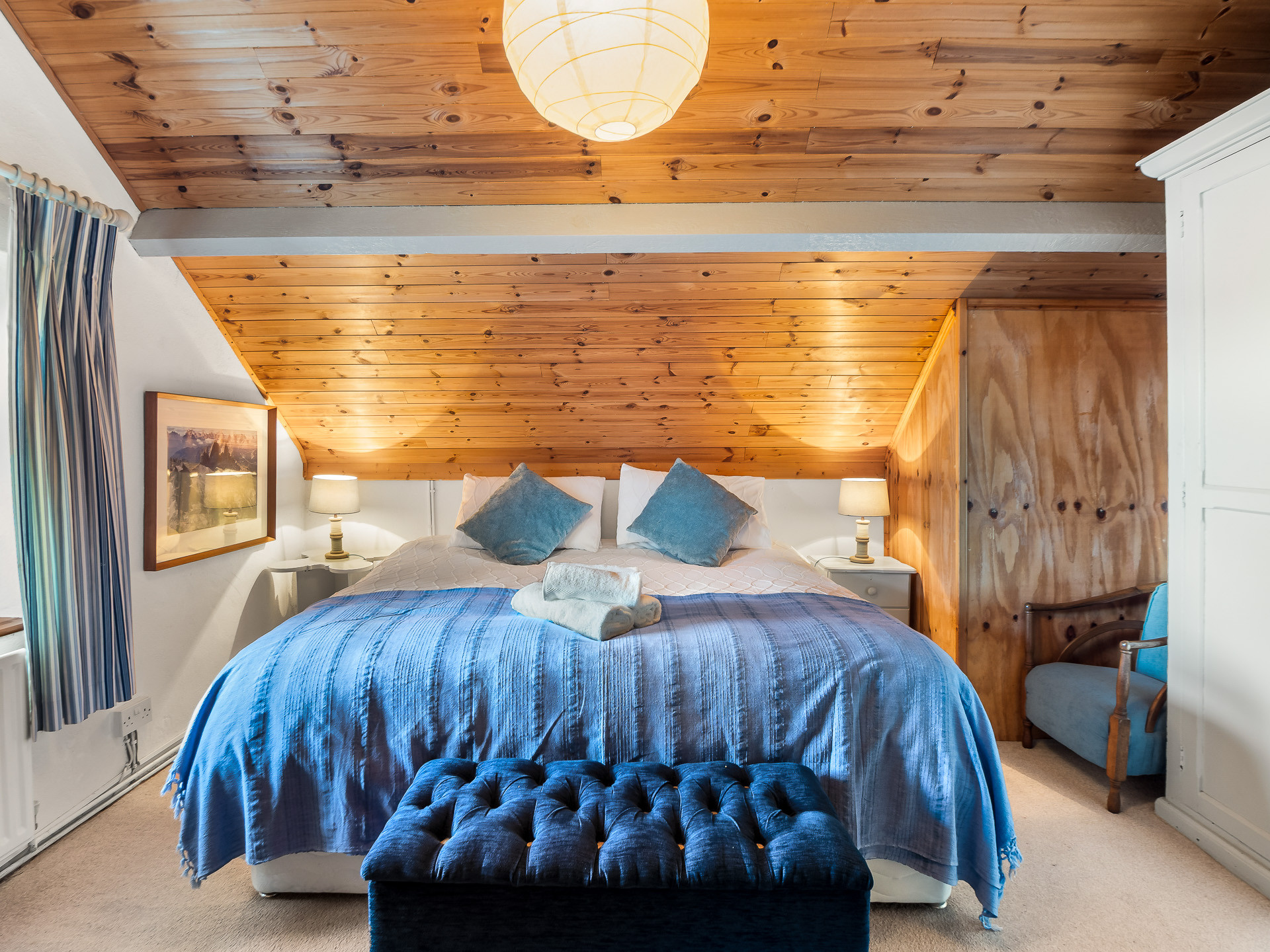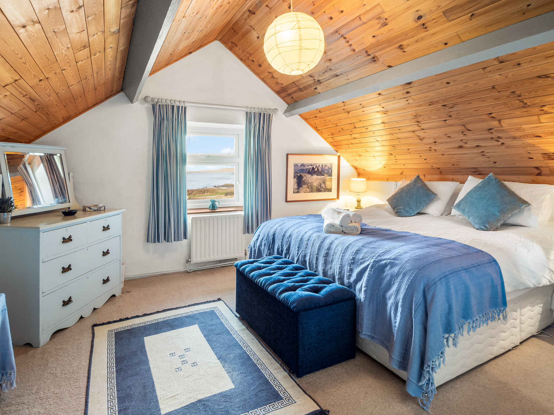 Upstairs, the home offers two beautifully appointed bedrooms, one with a super king bed and freestanding wardrobe, and the second with a double and single bed and a built-in wardrobe — perfect for families or friends. Two bathrooms complete the layout: one with a shower, and another with a toilet and basin.