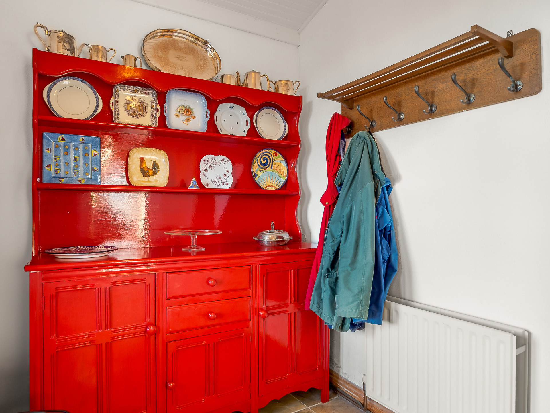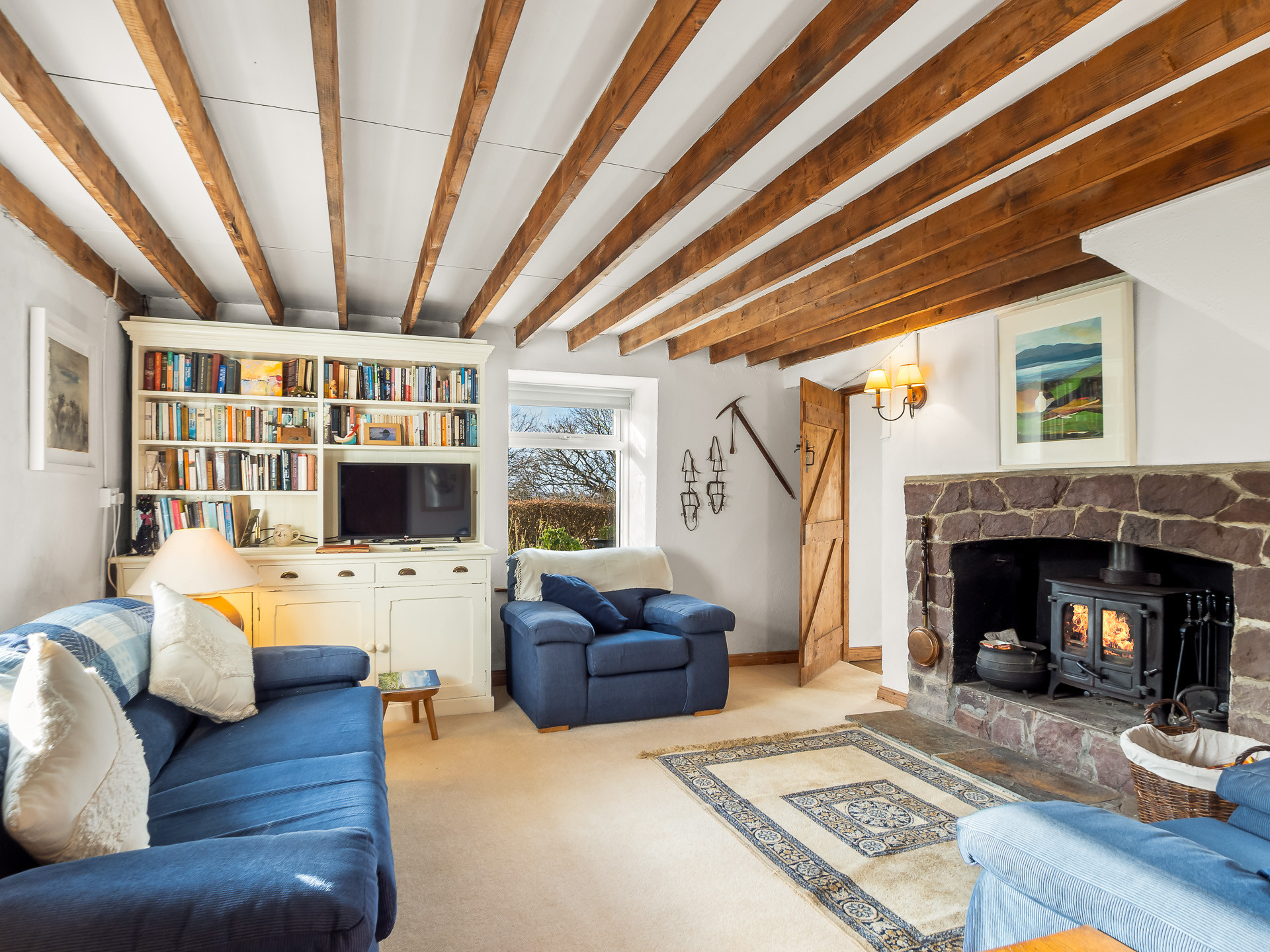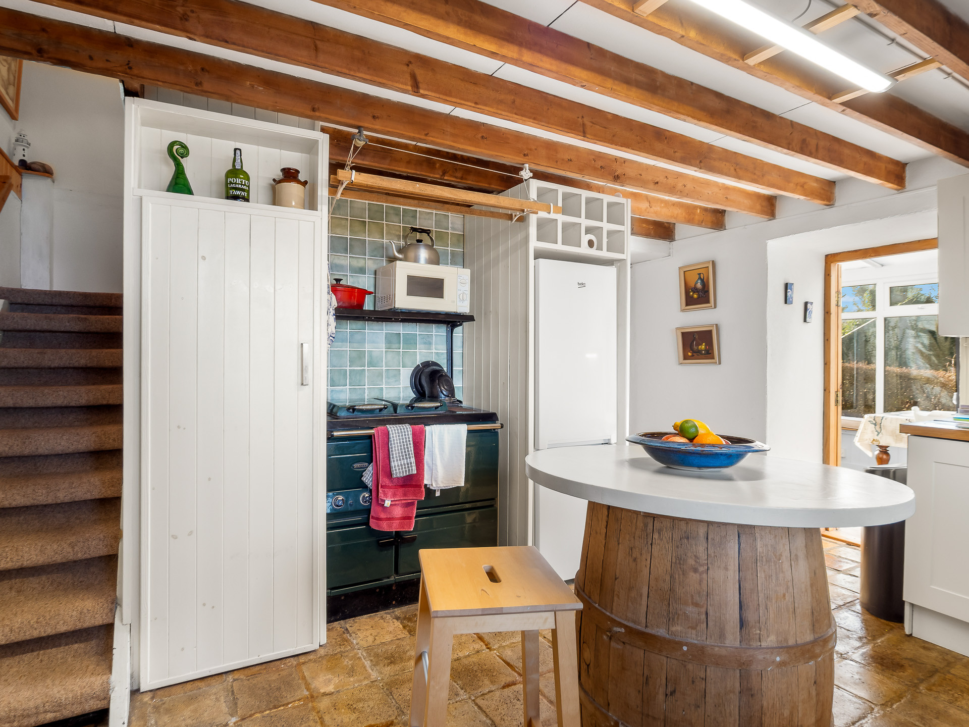 The well-equipped kitchen has everything you need for home-cooked meals, featuring an electric oven, gas hob, dishwasher and an oil-fired range that also provides heating. You’ll also find a washing machine and a traditional pulley clothes horse, a lovely nod to classic Irish country living.
