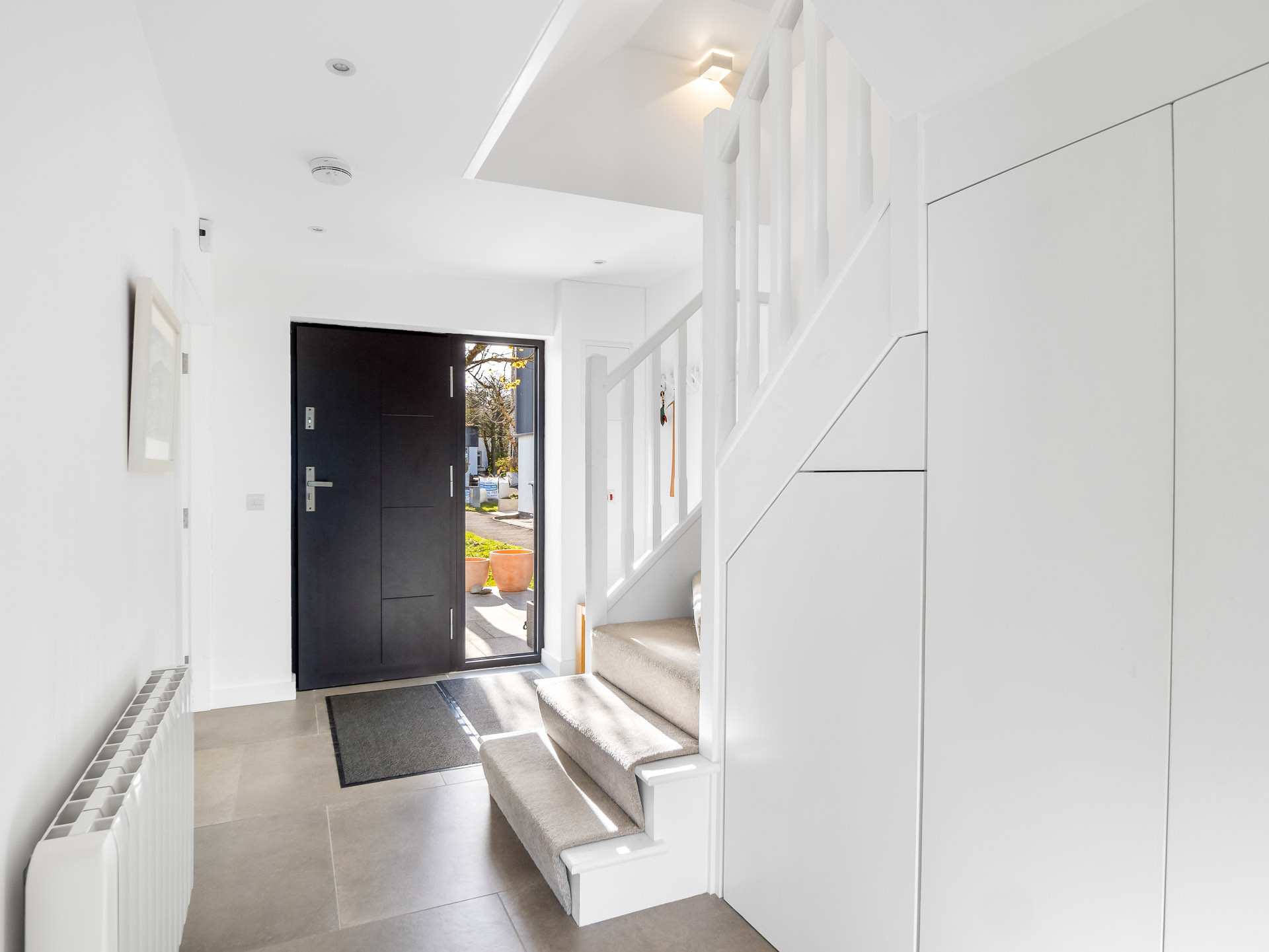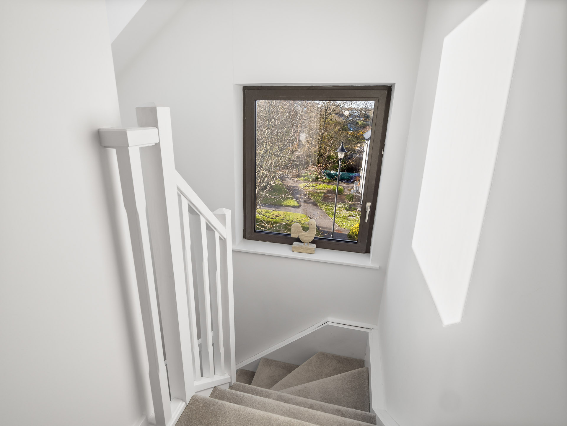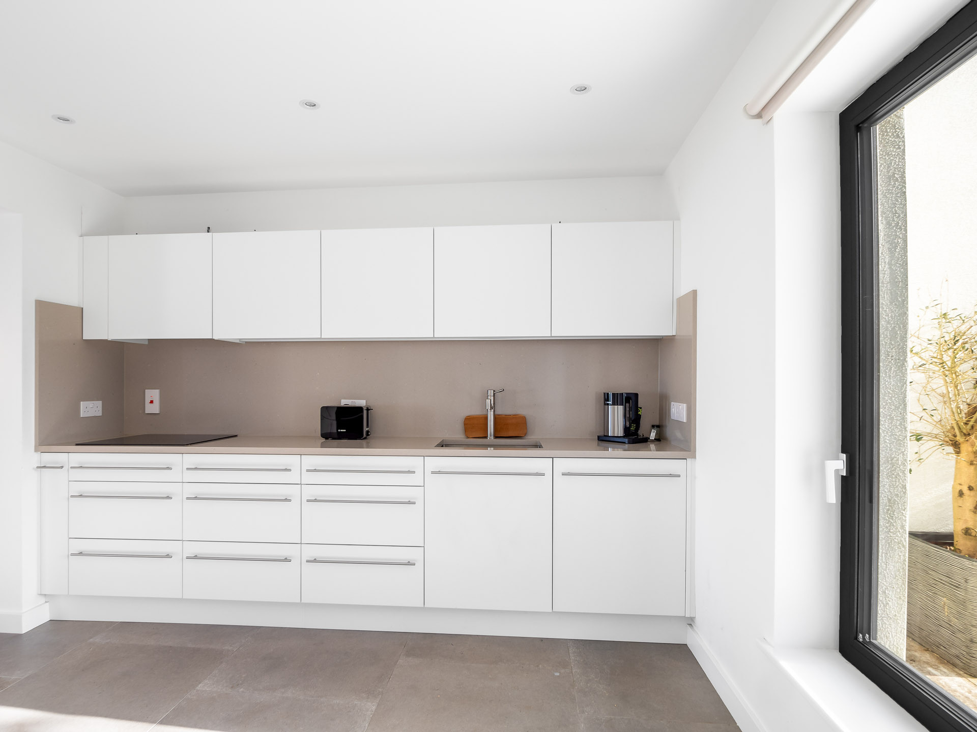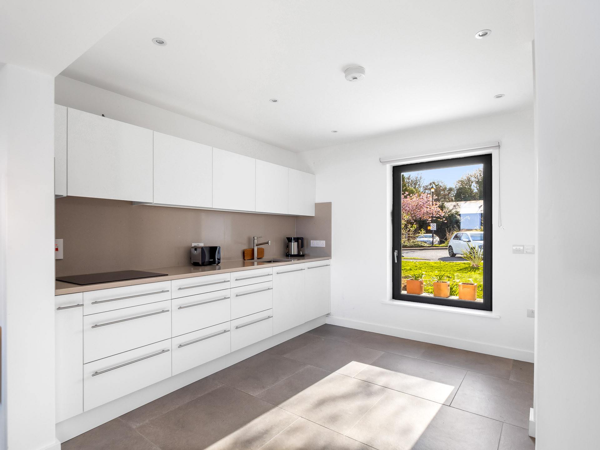 Semi-open plan, fully fitted kitchen equipped with all modern conveniences, plus a large window overlooking the front of the house.