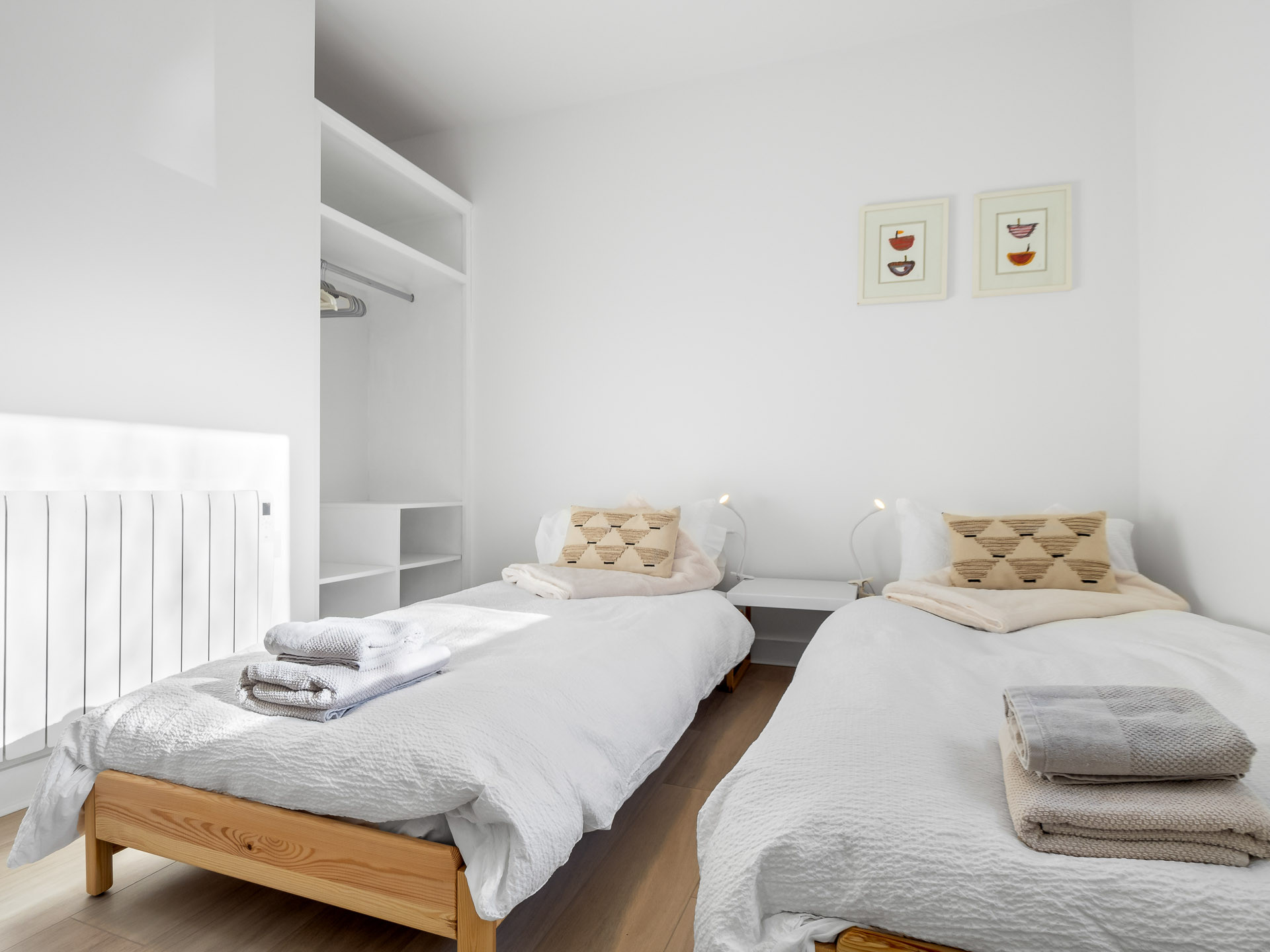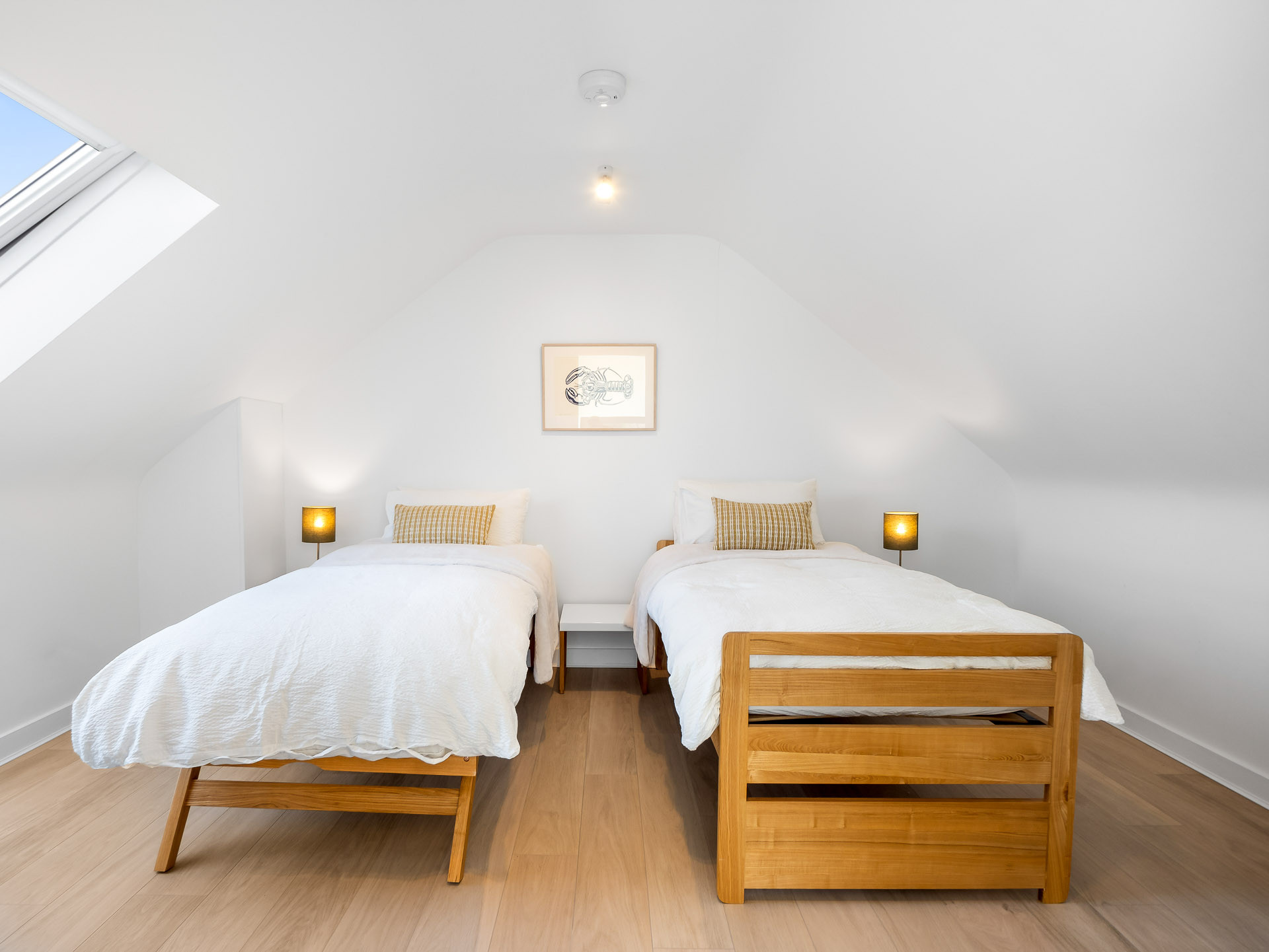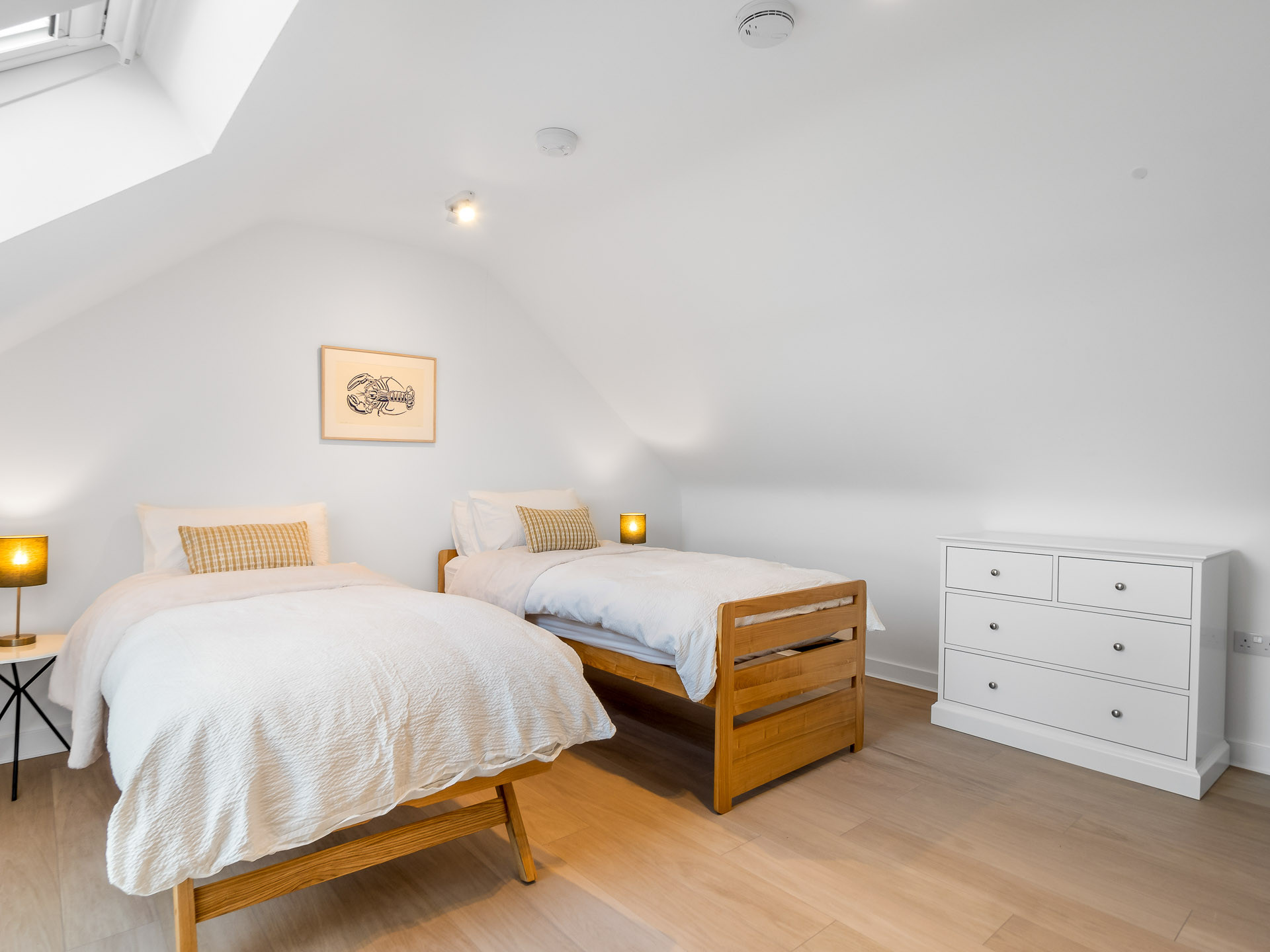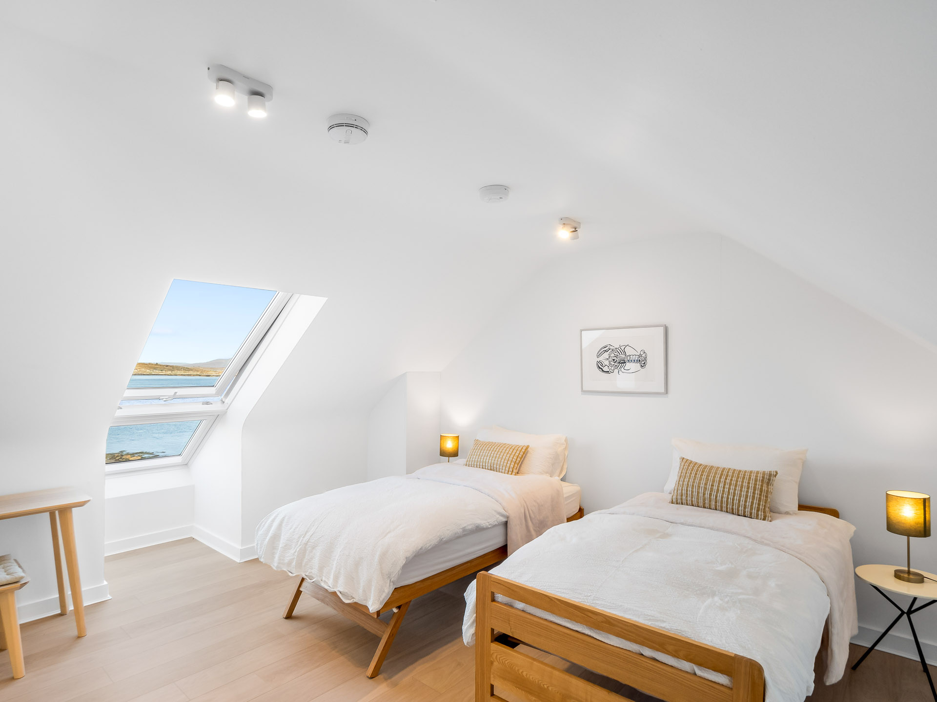 Spacious third bedroom featuring two Velux windows offering panoramic sea views, a trundle bed, a single bed, wooden flooring, and an electric heater.