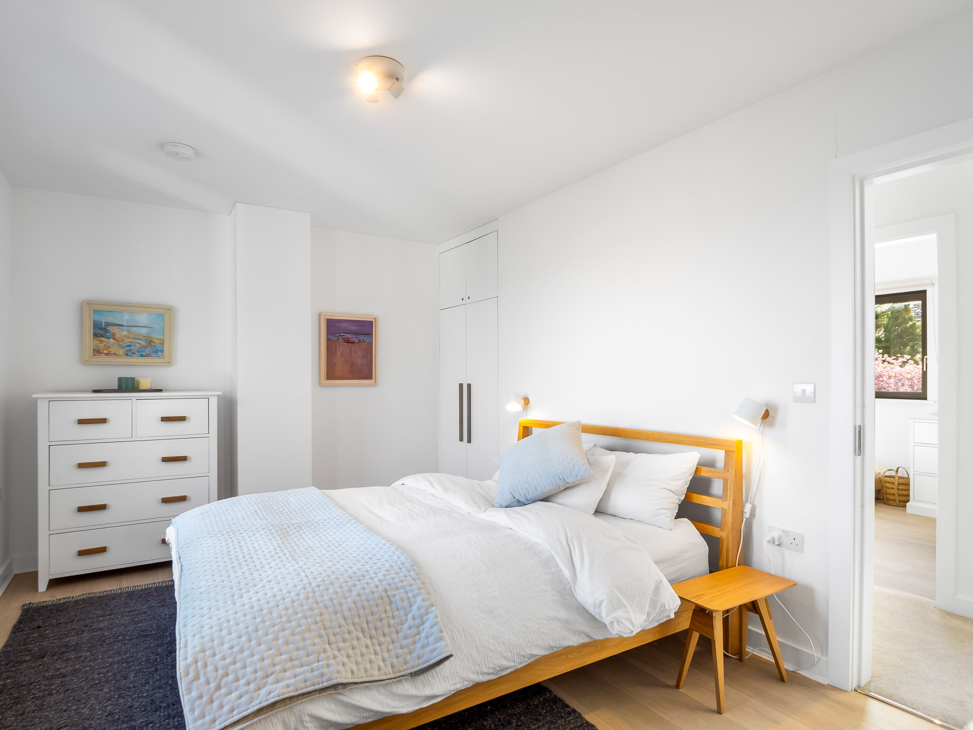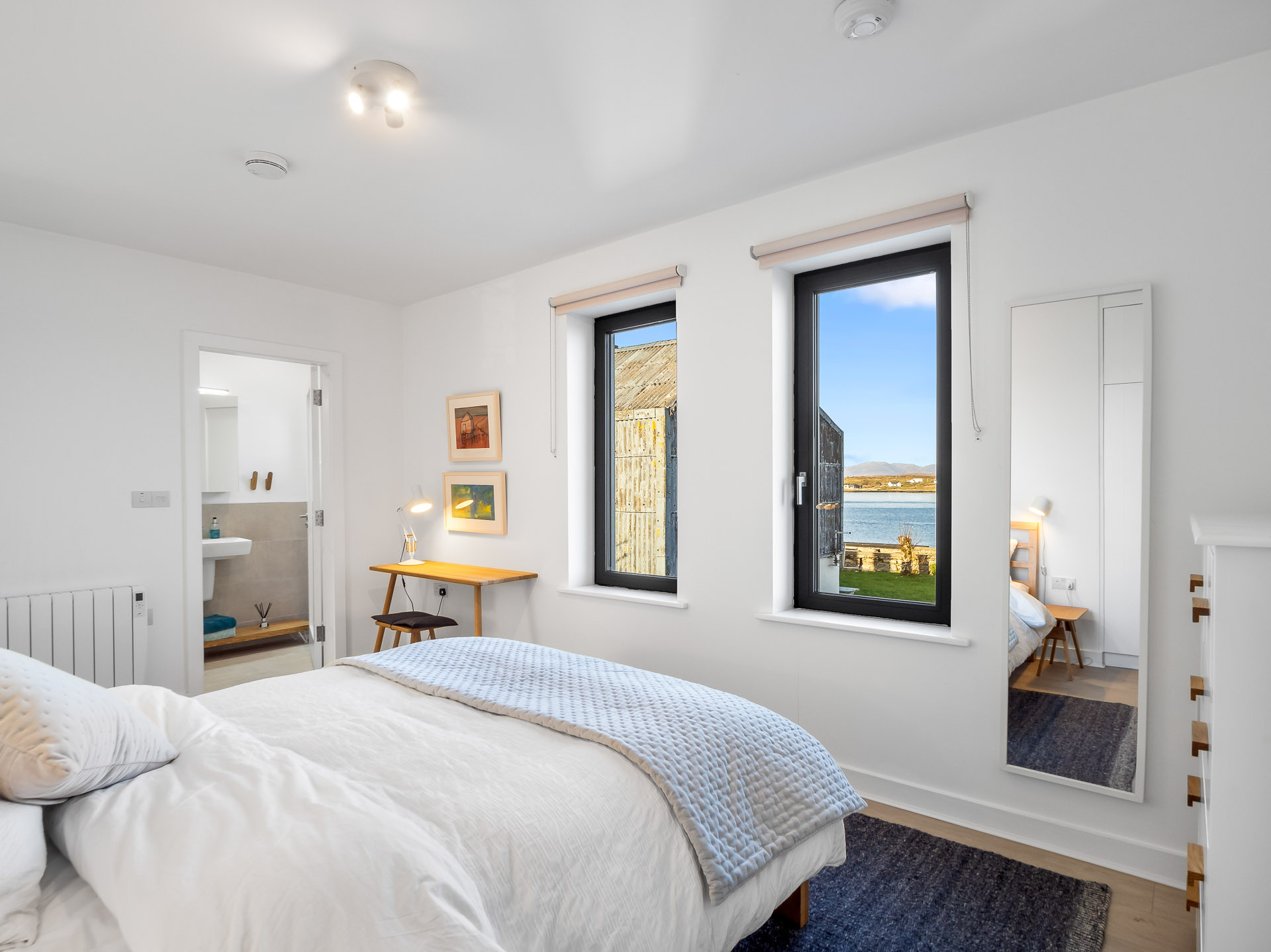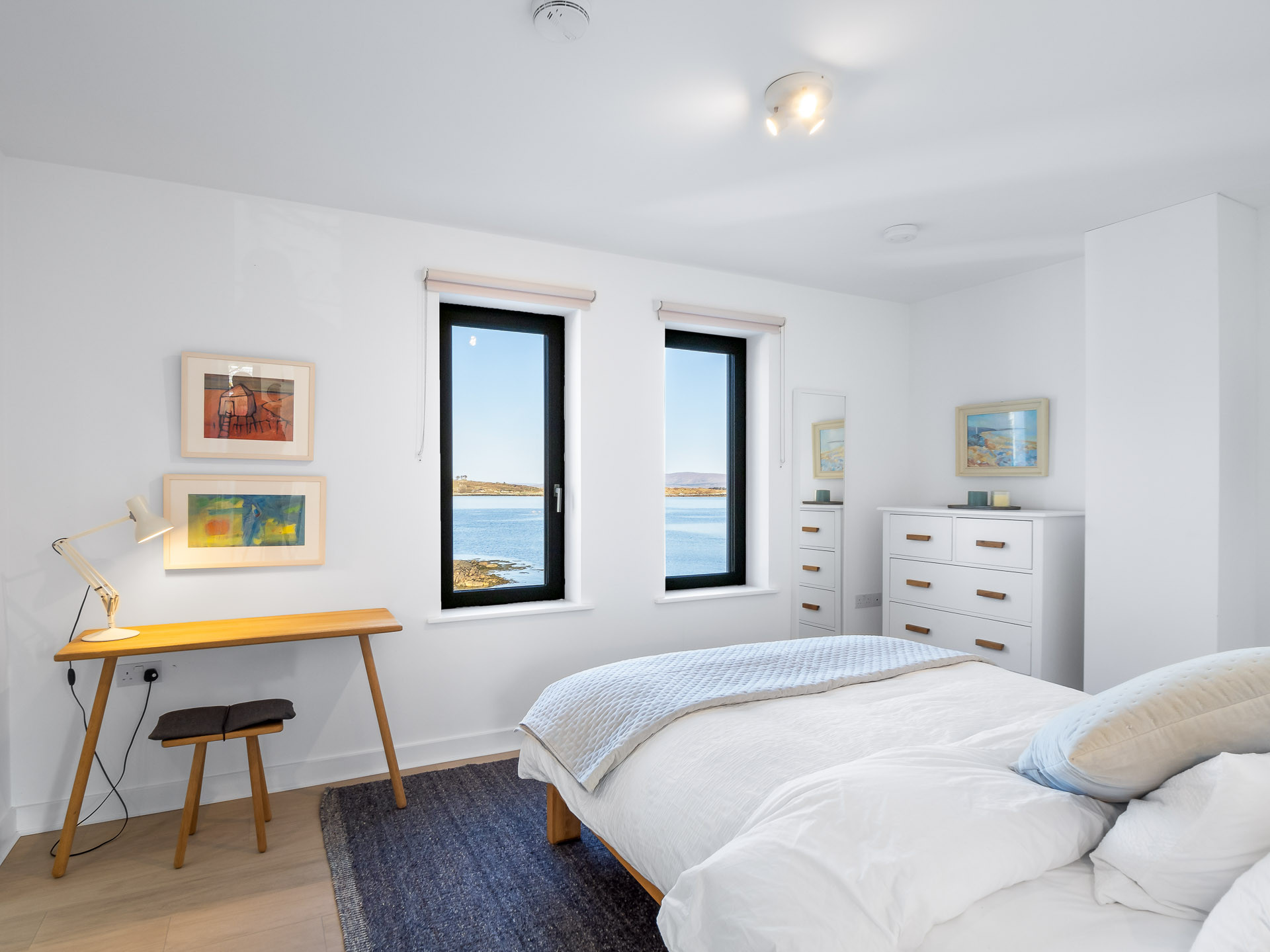 Master bedroom with awe-inspiring sea views, a double bed, desk, chest of drawers, fitted wardrobe, and wooden flooring. En-suite shower room.