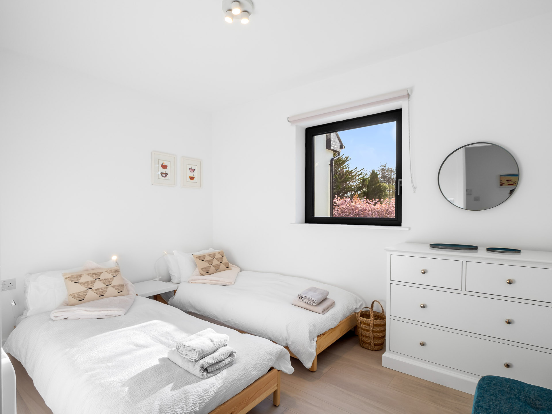 Twin bedroom with a window overlooking the front of the house, chest of drawers, open wardrobe, and wooden flooring.