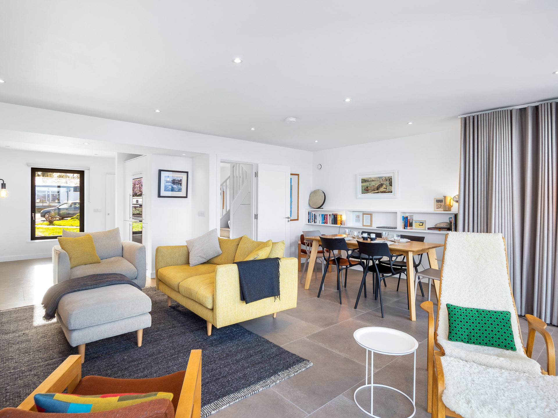 Spacious open-plan living area with large floor-to-ceiling windows and sliding doors, flooding the space with natural light.