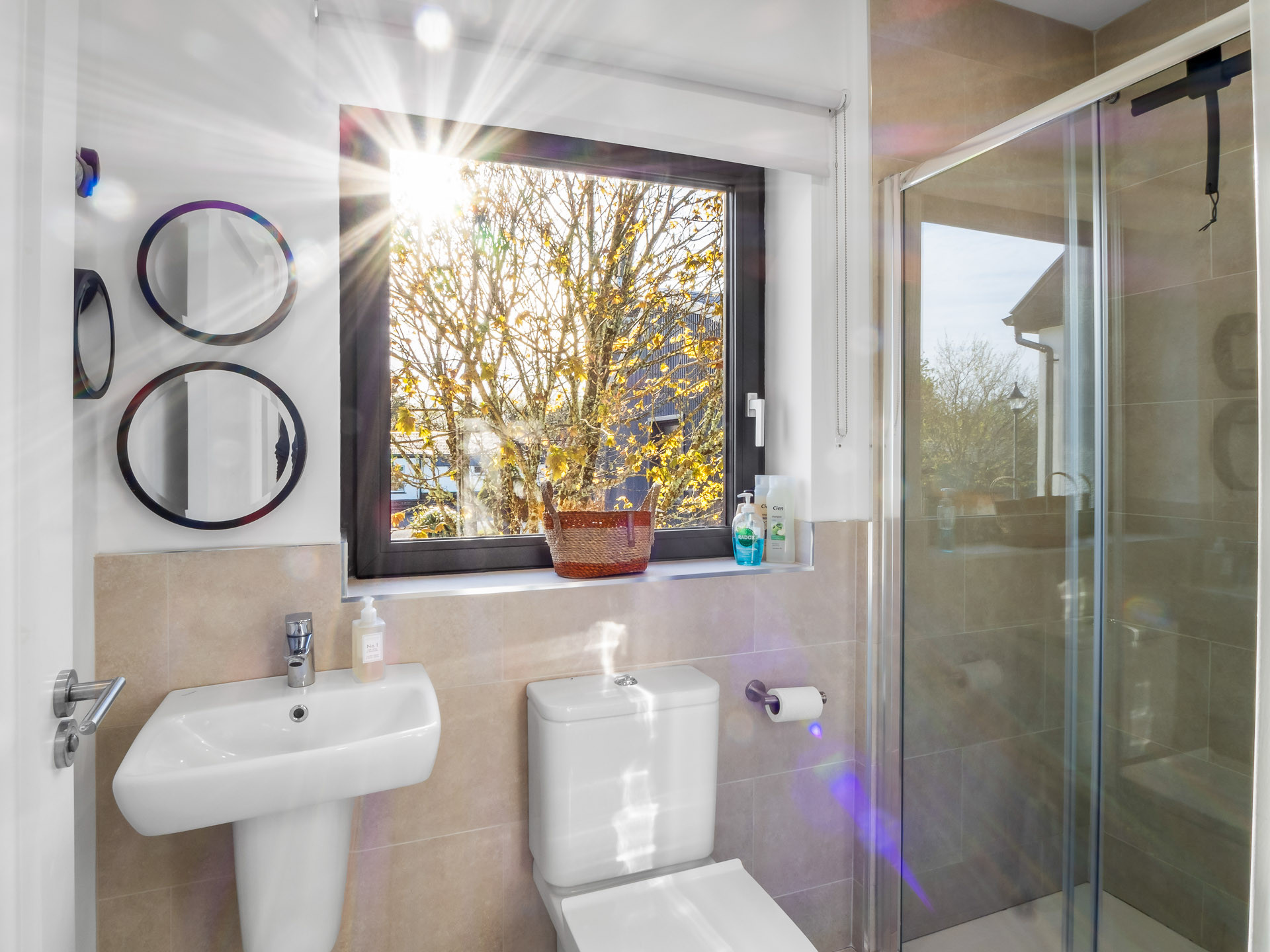 Family bathroom with a large shower unit, sink, and WC, plus a window overlooking the front of the house.