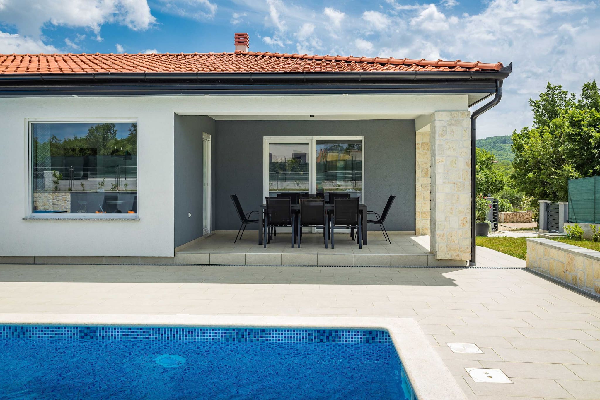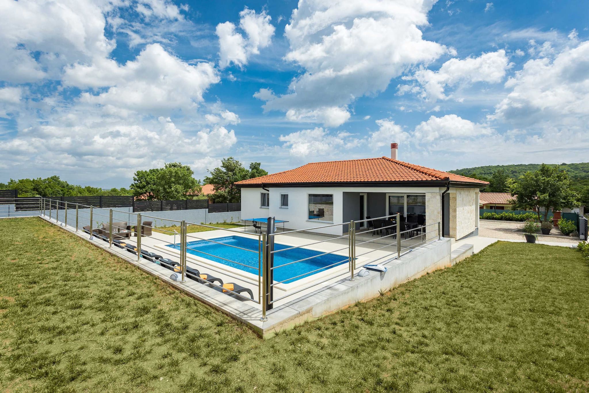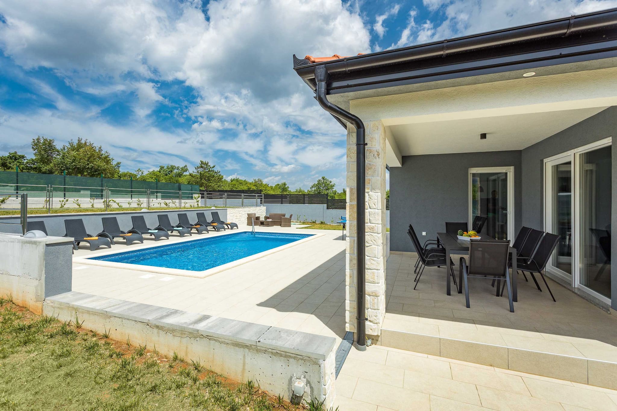 Holiday Home Greta is located in Salakovci, a village perfect for relaxing vacation. Guests have access to a private swimming pool, sun deck with sun loungers, outdoor dining area, trampoline and a charcoal grill/BBQ. House is entirely located on ground floor and it consists of living room, kitchen, 4 bedrooms with AC and en suite bathrooms. Washing machine is located in a separate toilet.