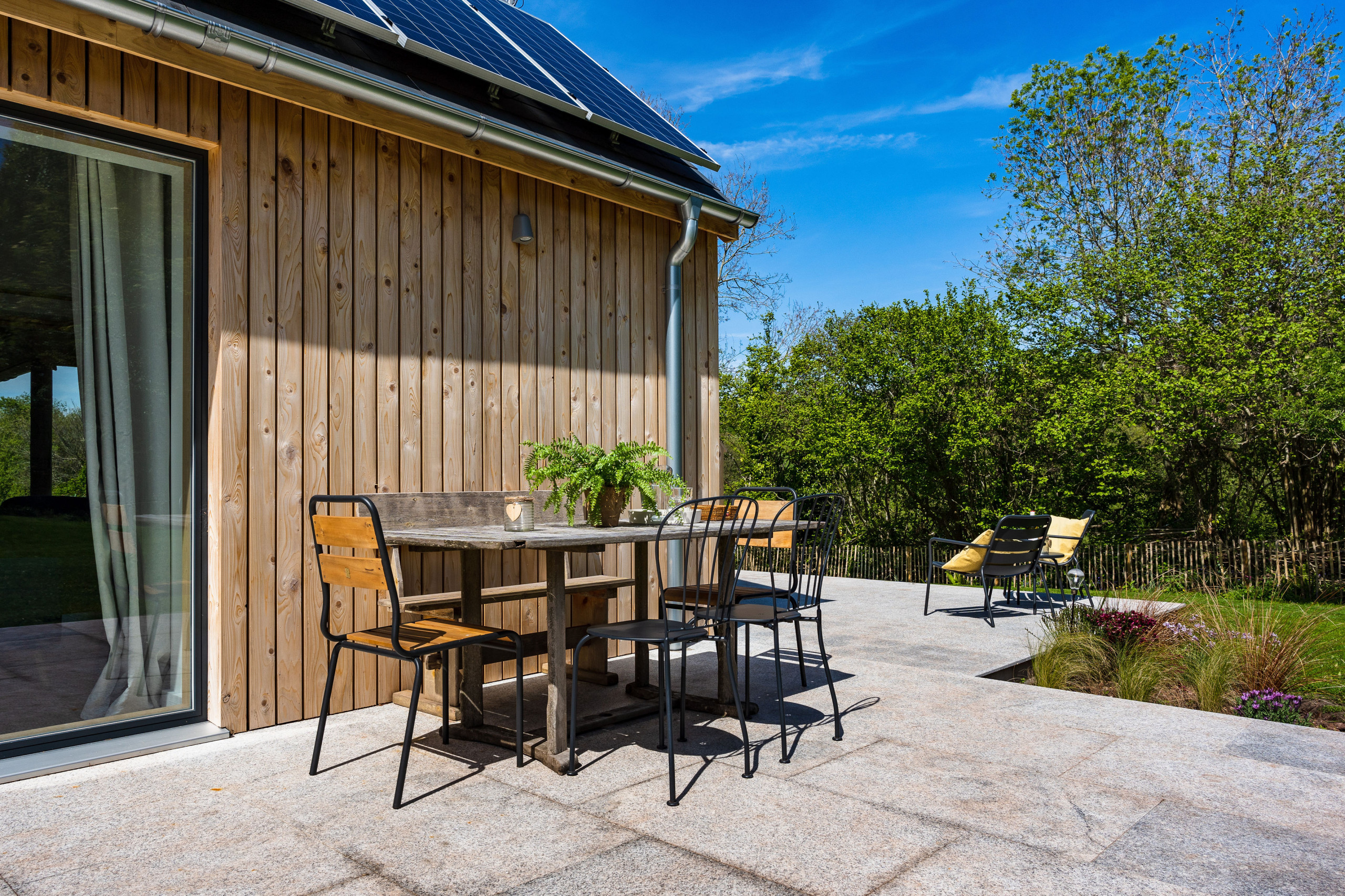 The house, attractively clad in UK grown cedar, is designed for every kind of holiday. The living area is welcoming, open and spacious, with large-screen television, Bose home entertainment system, books and games. Doors open from three different sides onto a granite terrace that surrounds the entire side and rear of the property. From here you can watch the children play in the garden, or entertain family and friends beneath a covered open area with sink and other utilities.