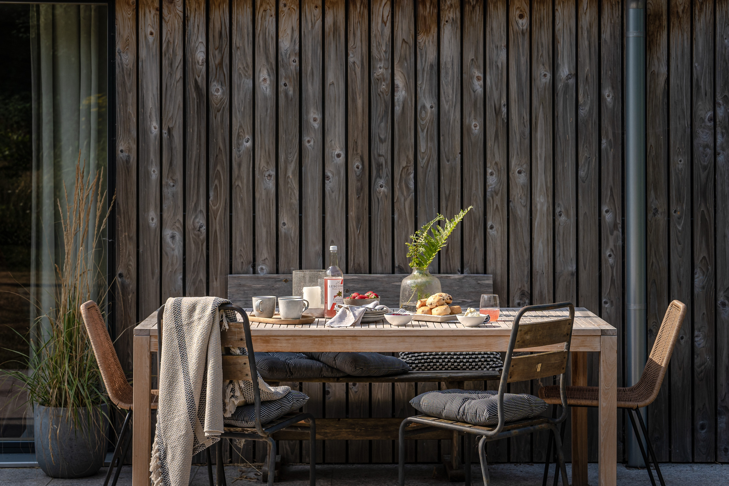 Each bedroom has a French door that opens onto the covered veranda and garden area. The larger super king room can also be configured into two single beds. The second bedroom has a king size bed. The third double futon bed is located on the mezzanine floor above the living room area. The bathroom is unique and is accessed from the hall way between both bedrooms. It has silent heat recovery ventilation with an integrated dual sink, a separate shower and double ended steel bath. There is also an additional toilet at the end of the hallway.