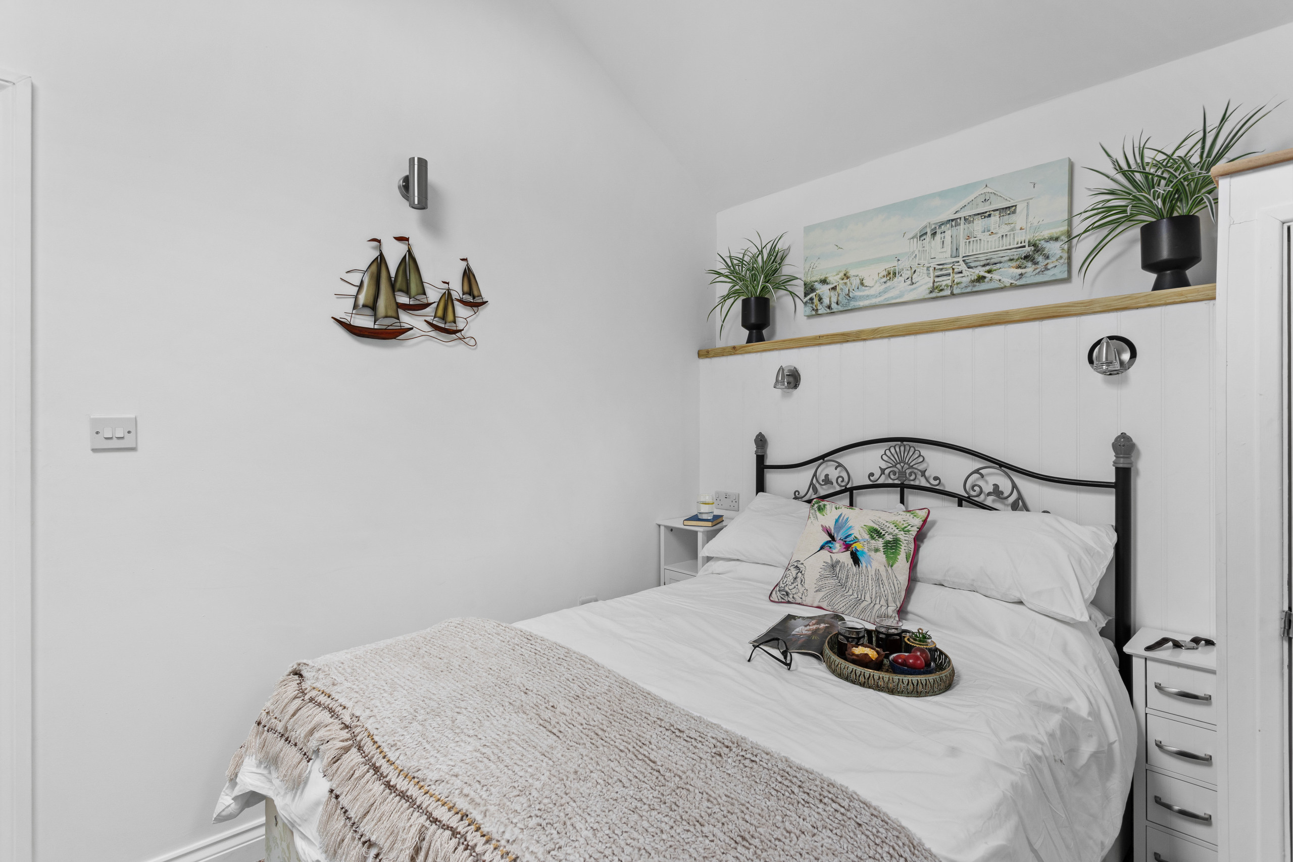 Upstairs there are two further bedrooms. To the rear, a nice-sized double bedroom, and to the front, the king-size bedroom with a large open-plan balcony to enjoy yet more spectacular sea views. Each bedroom is also equipped with a smart TV.
