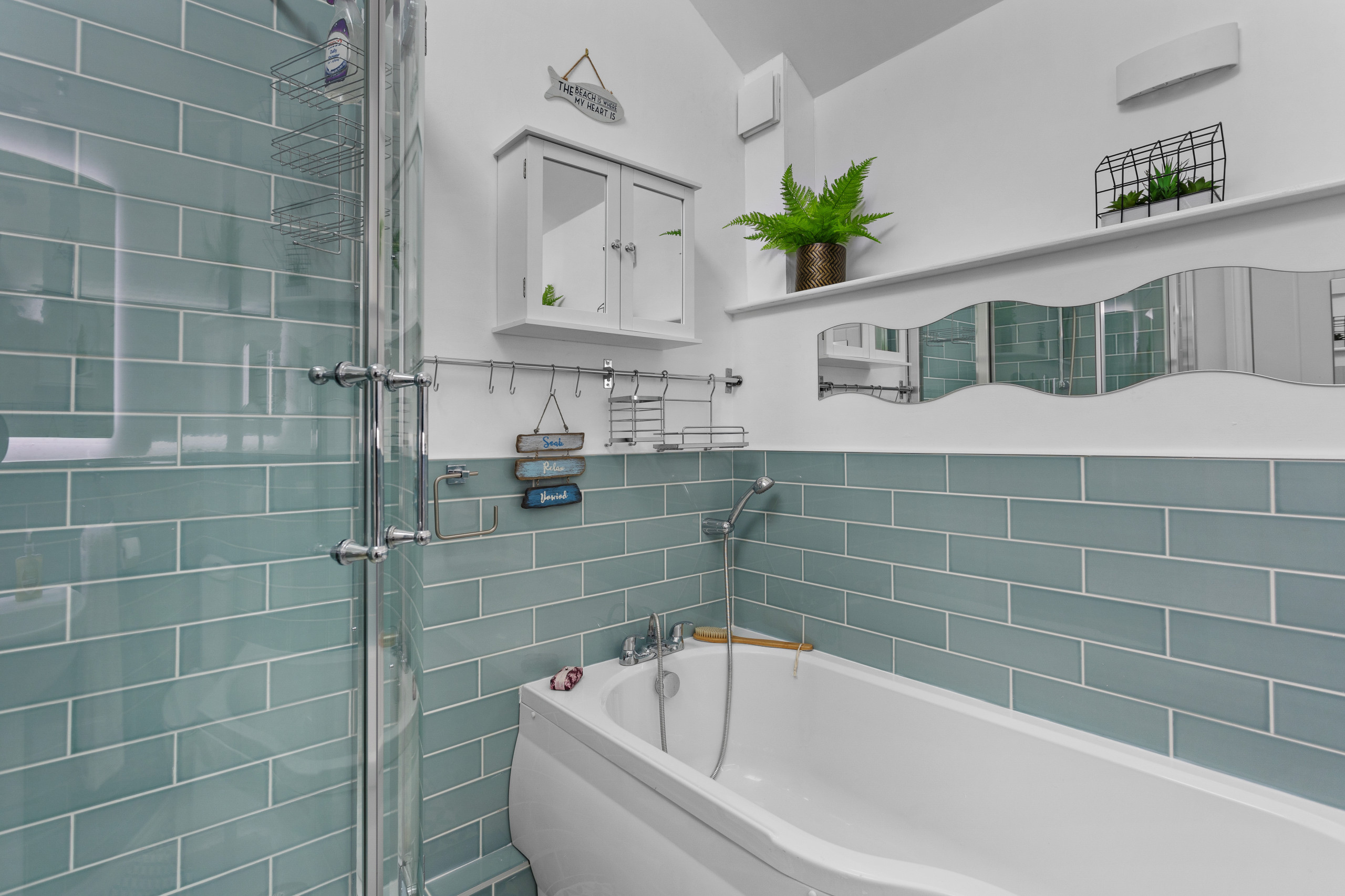 Between the bedrooms is the family bathroom. Framed in subtle nautical-green brick tiles, there’s a corner shower, curved shower bath with shower attached, plus a basin and toilet. It is also worth mentioning that there is also an large illuminated Bluetooth mirror with inbuilt speakers that plays music from any Bluetooth device.