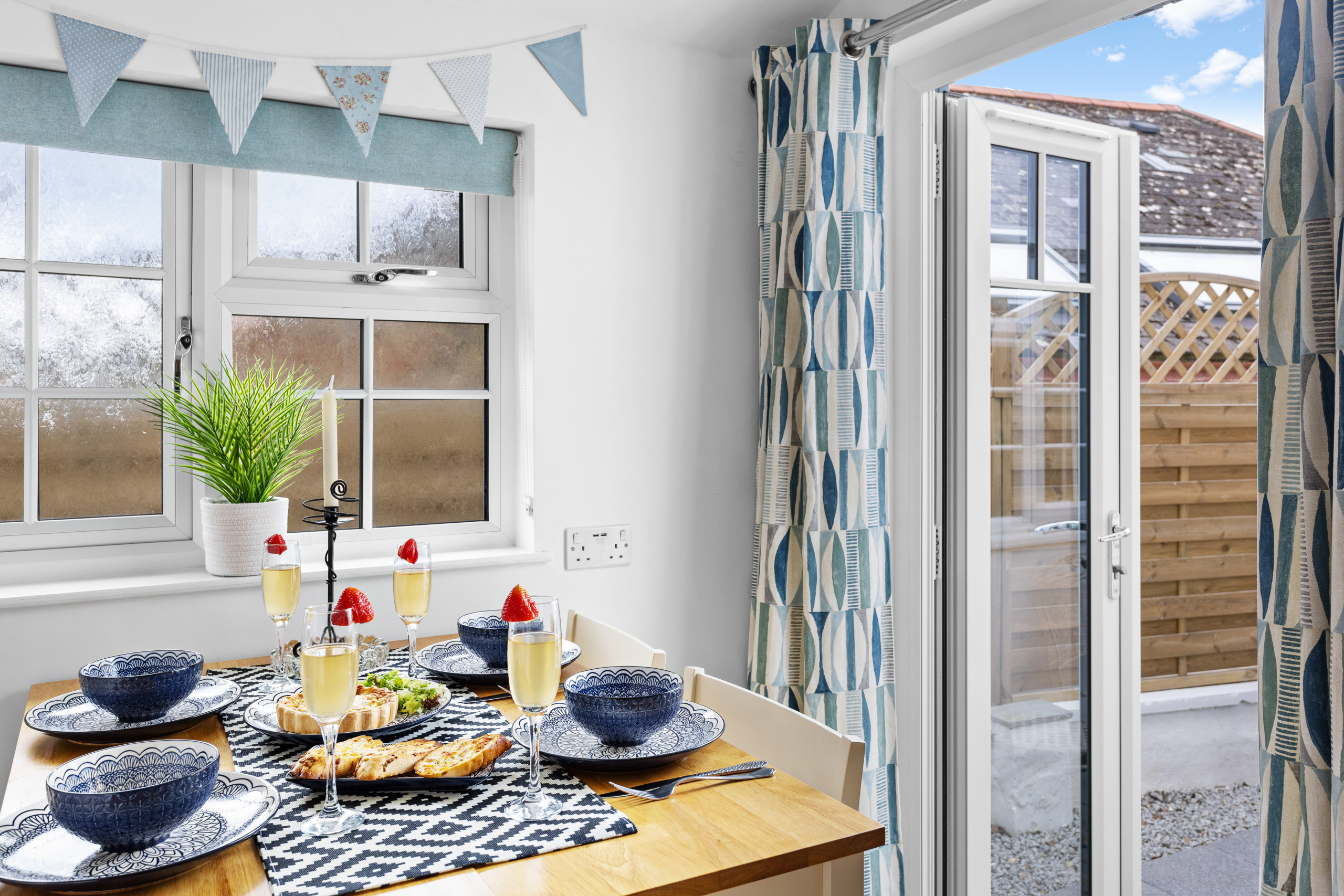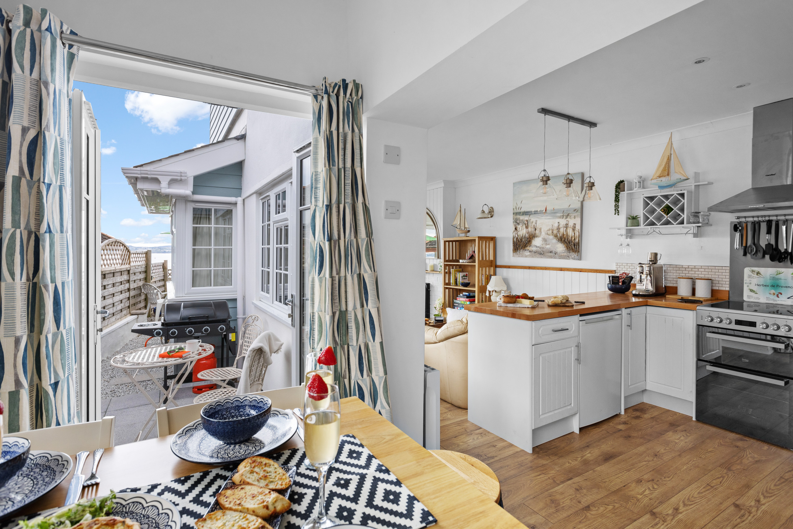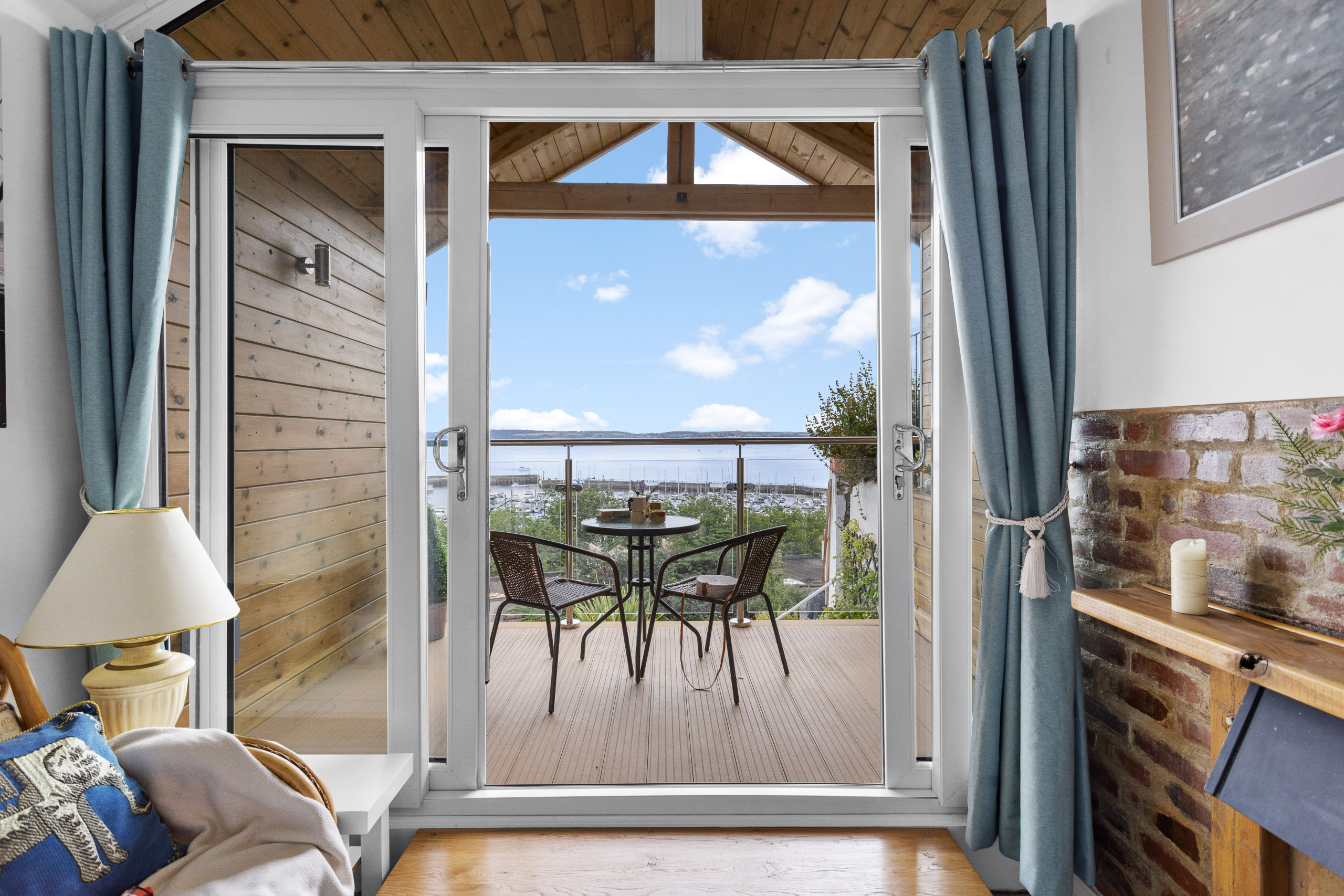 The moment you step inside The Boathouse, you’ll be captivated by the refreshing open-plan layout as the kitchen seamlessly merges with the living area, offering panoramic sea views of the marina and Torbay. As you settle into the cosy living space, let the sea air flow through, or take to the balcony to broaden the amazing vista. In the cooler months, also enjoy the warm glow of the wood-burning stove (ample wood, kindling, and firelighters are provided). Next to the kitchen area, the high dining table seats four. The feature-packed smart TV lets you stream your favourite on-demand programmes (subscriptions required) and adjusts to the ambient light for uninterrupted viewing, come rain or shine. There’s also a DVD player for your own choice of movies.