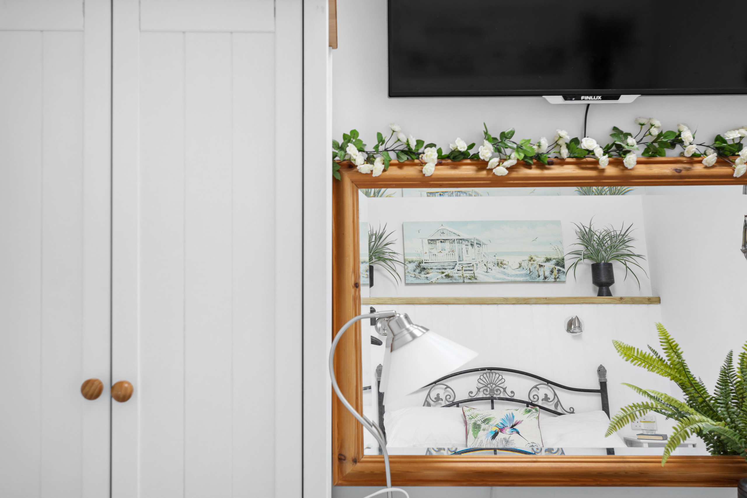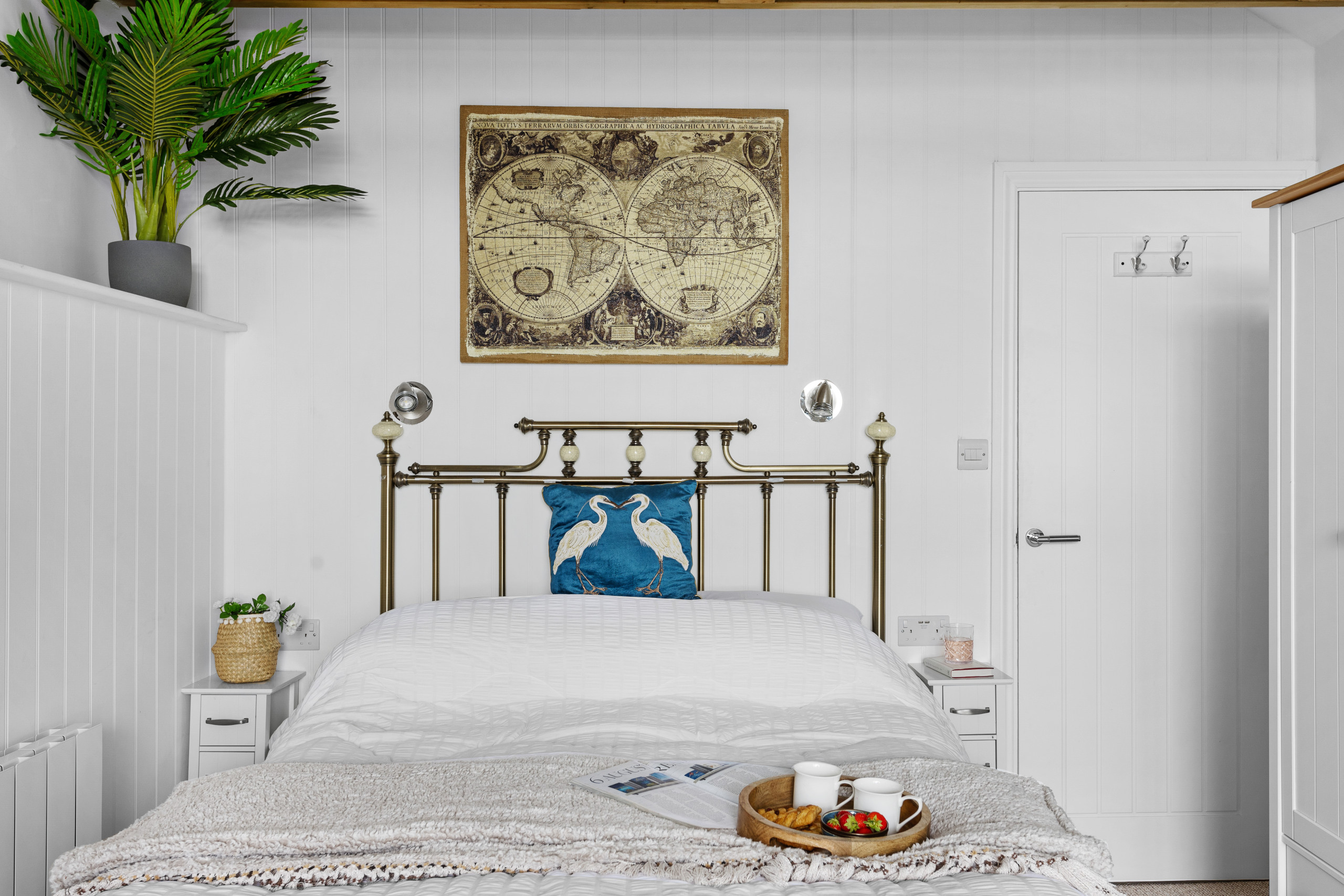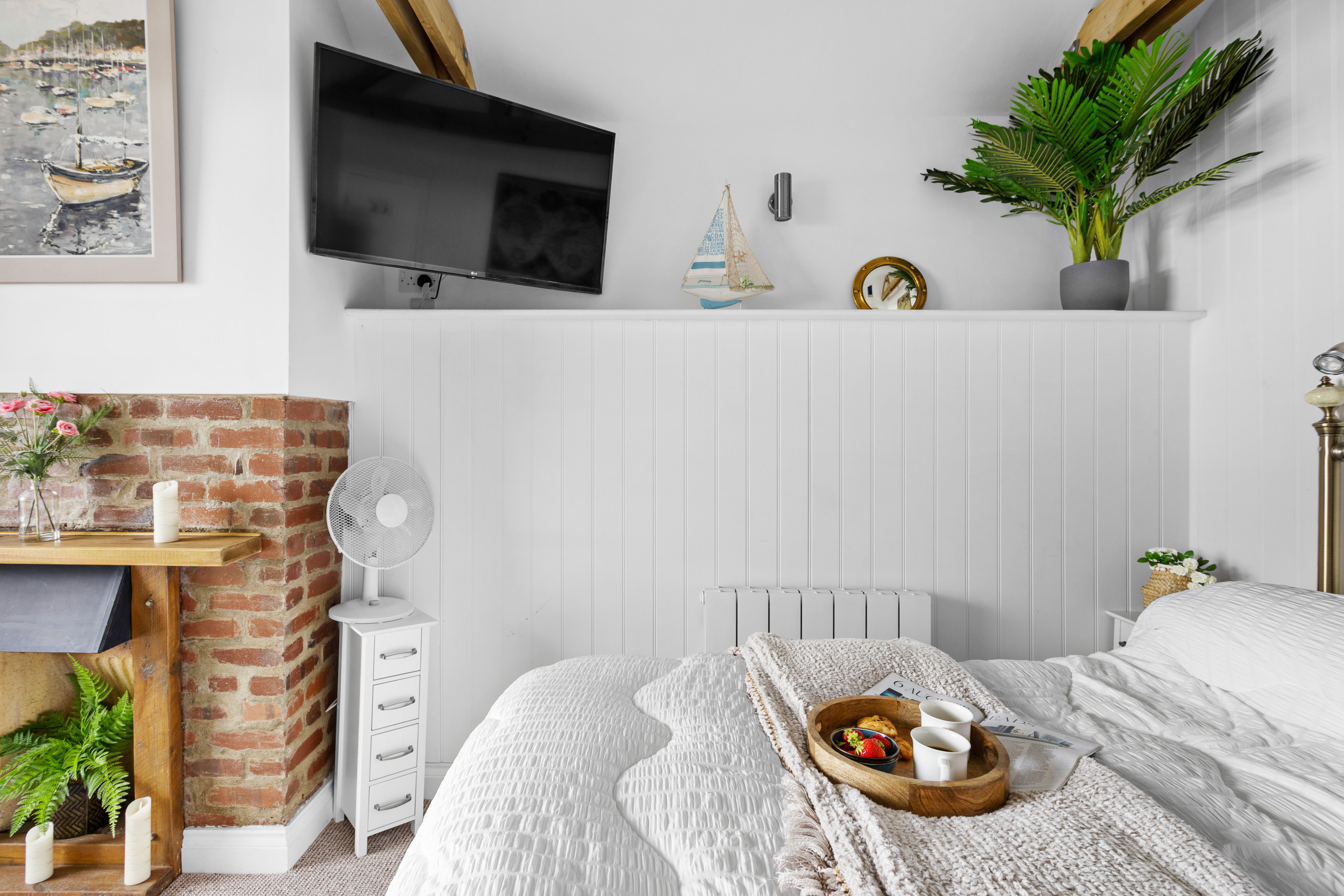 The moment you step inside The Boathouse, you’ll be captivated by the refreshing open-plan layout as the kitchen seamlessly merges with the living area, offering panoramic sea views of the marina and Torbay. As you settle into the cosy living space, let the sea air flow through, or take to the balcony to broaden the amazing vista. In the cooler months, also enjoy the warm glow of the wood-burning stove (ample wood, kindling, and firelighters are provided). Next to the kitchen area, the high dining table seats four. The feature-packed smart TV lets you stream your favourite on-demand programmes (subscriptions required) and adjusts to the ambient light for uninterrupted viewing, come rain or shine. There’s also a DVD player for your own choice of movies.