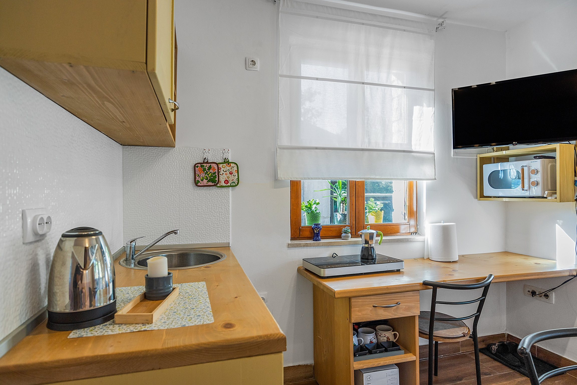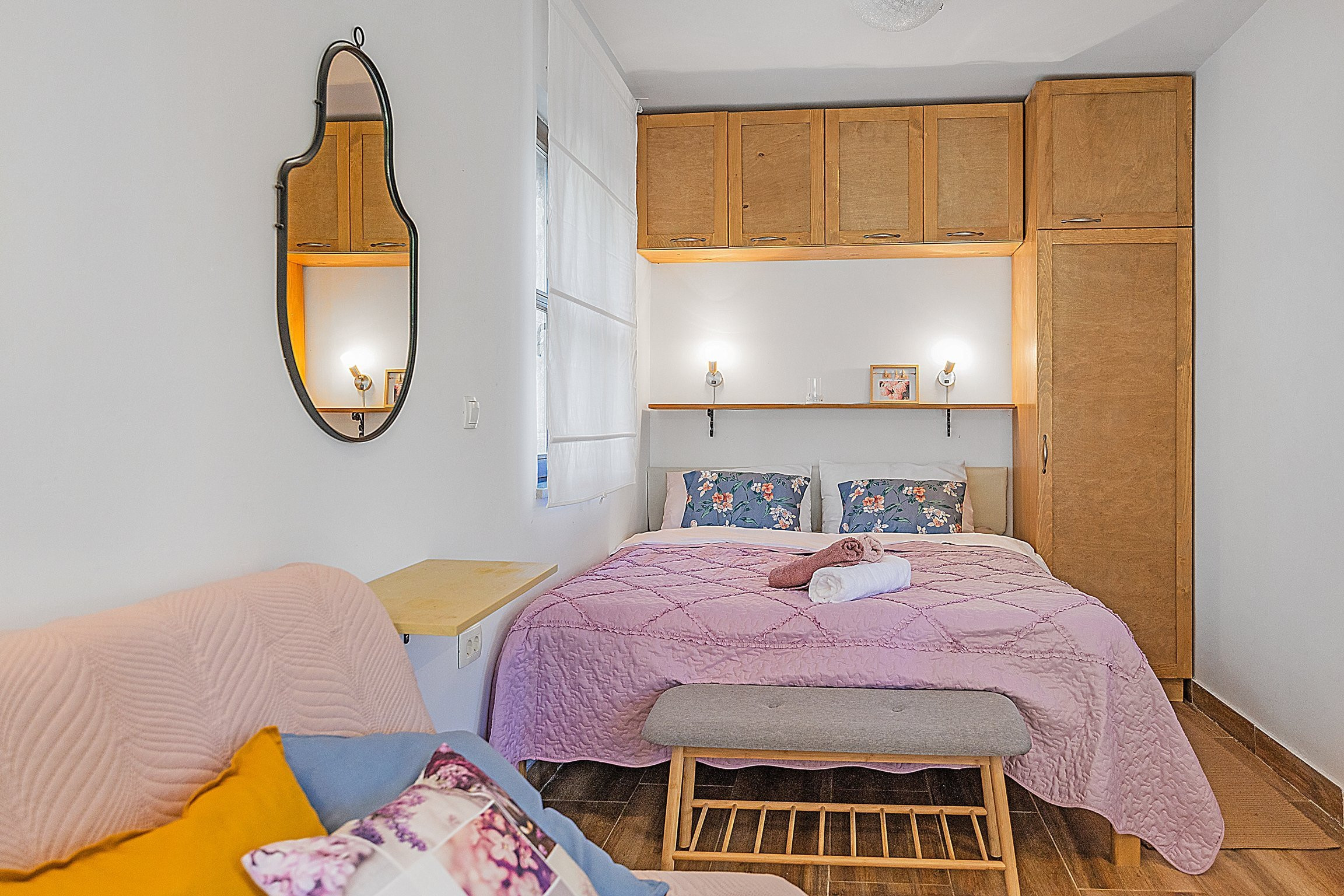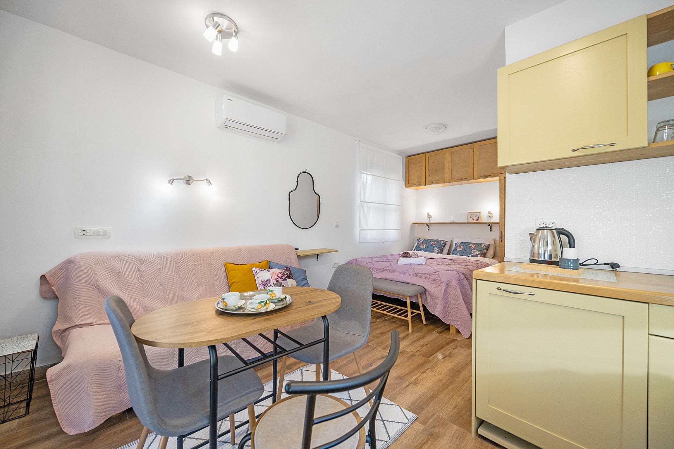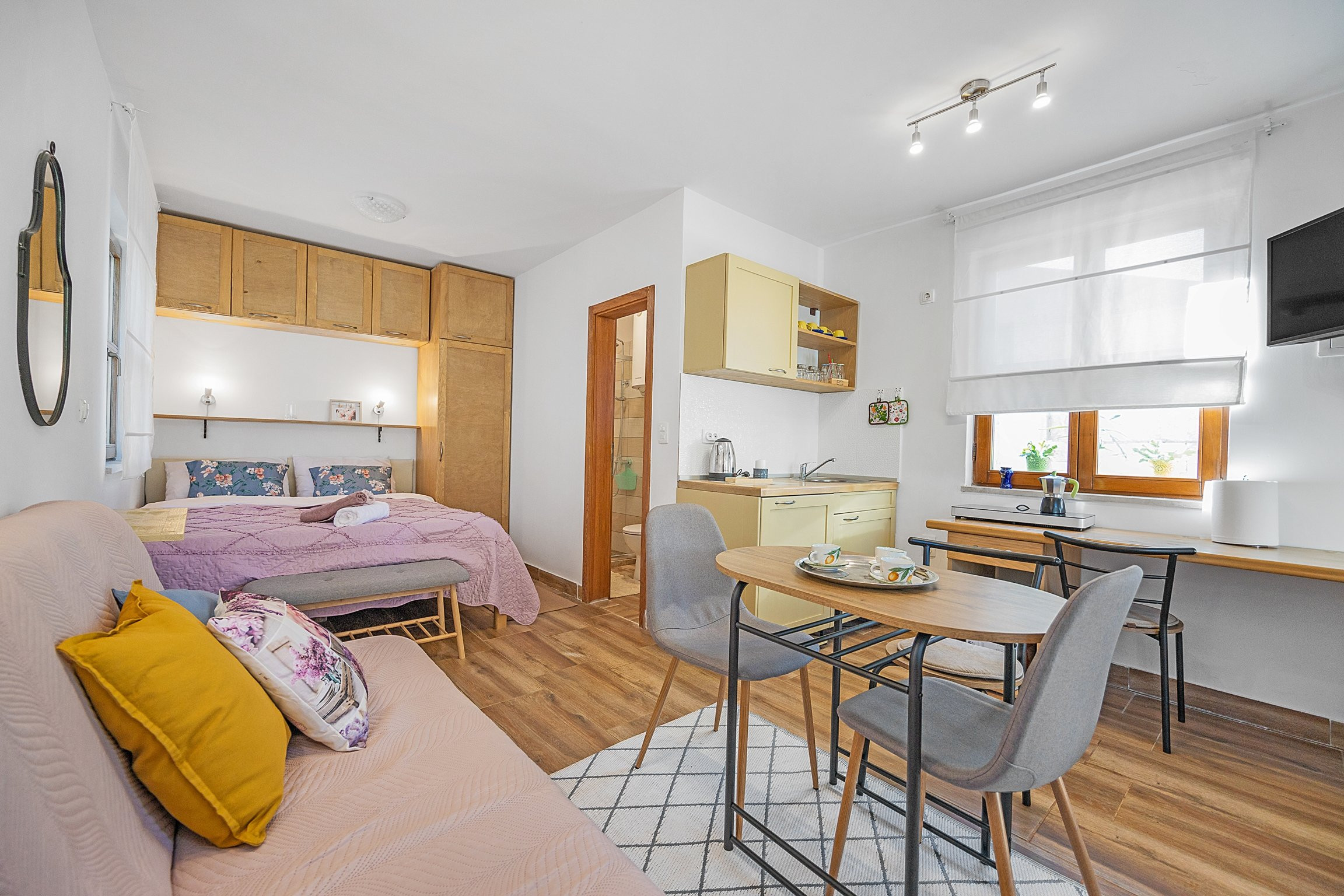 Studio Apartment Sole is a perfect choice for a couple getaway, as it can host up to two people. The apartment consists of a living area and a small bathroom, as well as the private terrace. The livng area is equipped with a small kitchen with all the necesary amenities, such as: cooker, fridge with a freezer drawer, sink, microwave, electric kettle and a toaster and a dining table for two and a sofa. A queensize bed will guarantee a comfortable sleep.