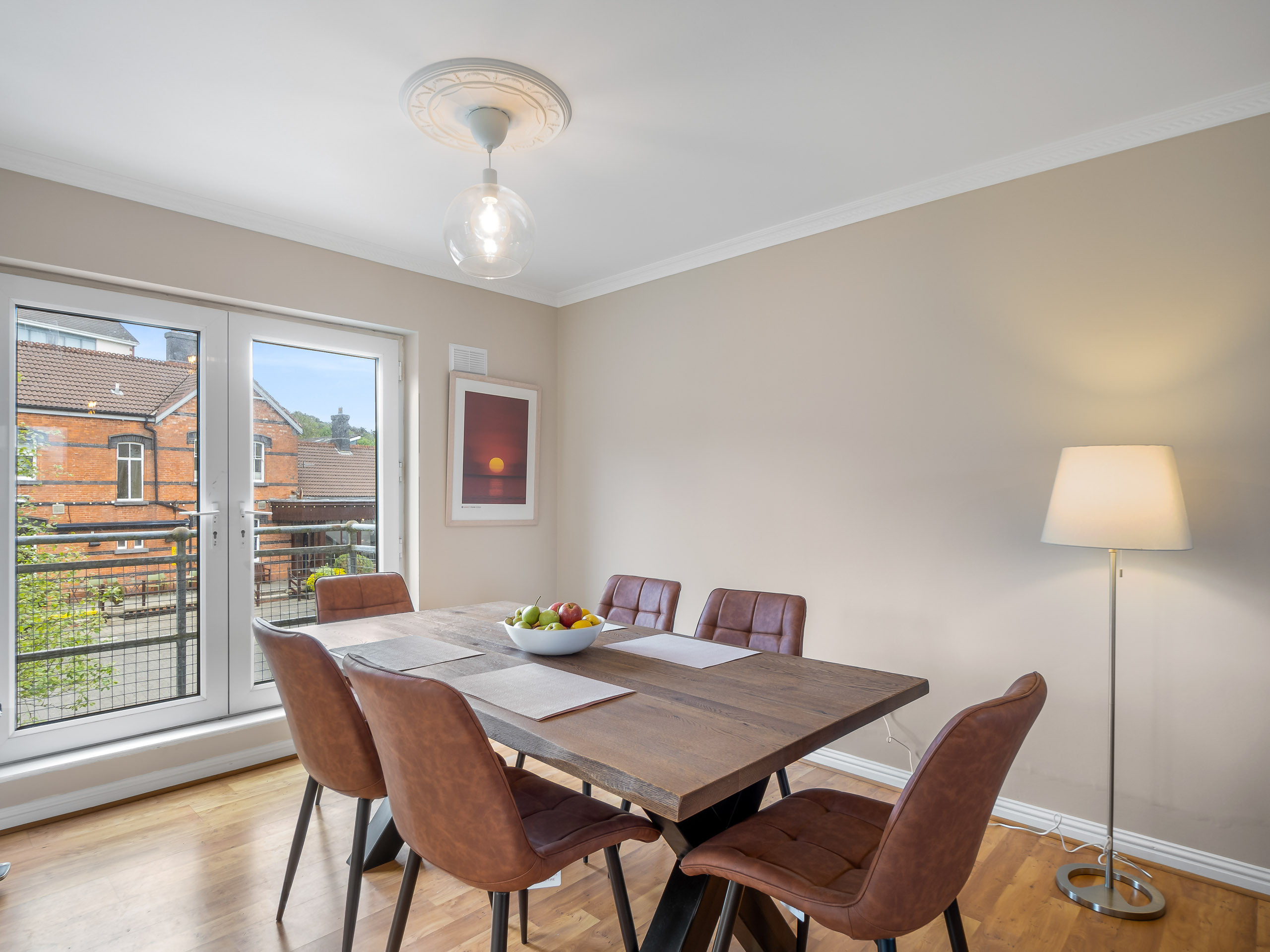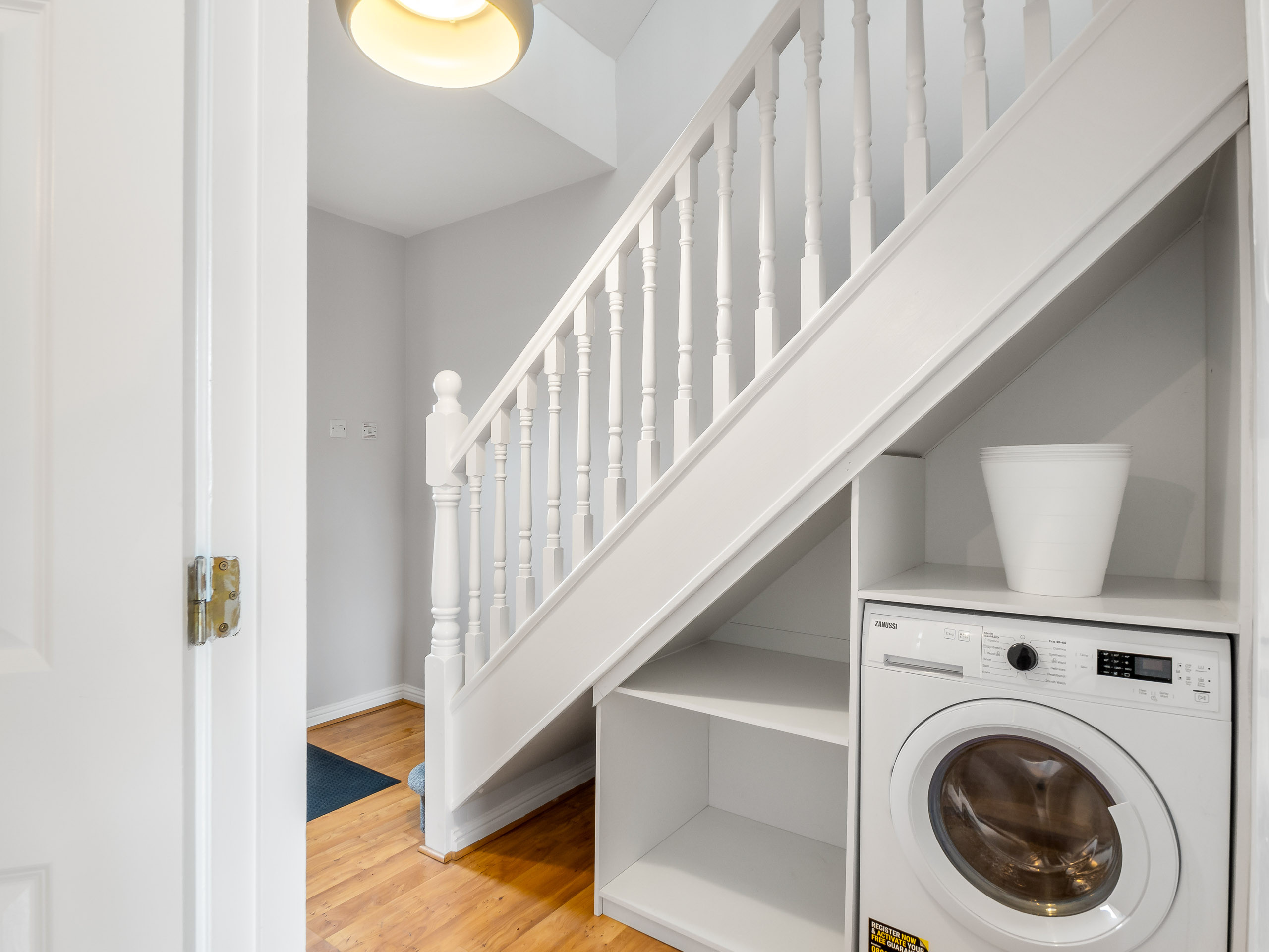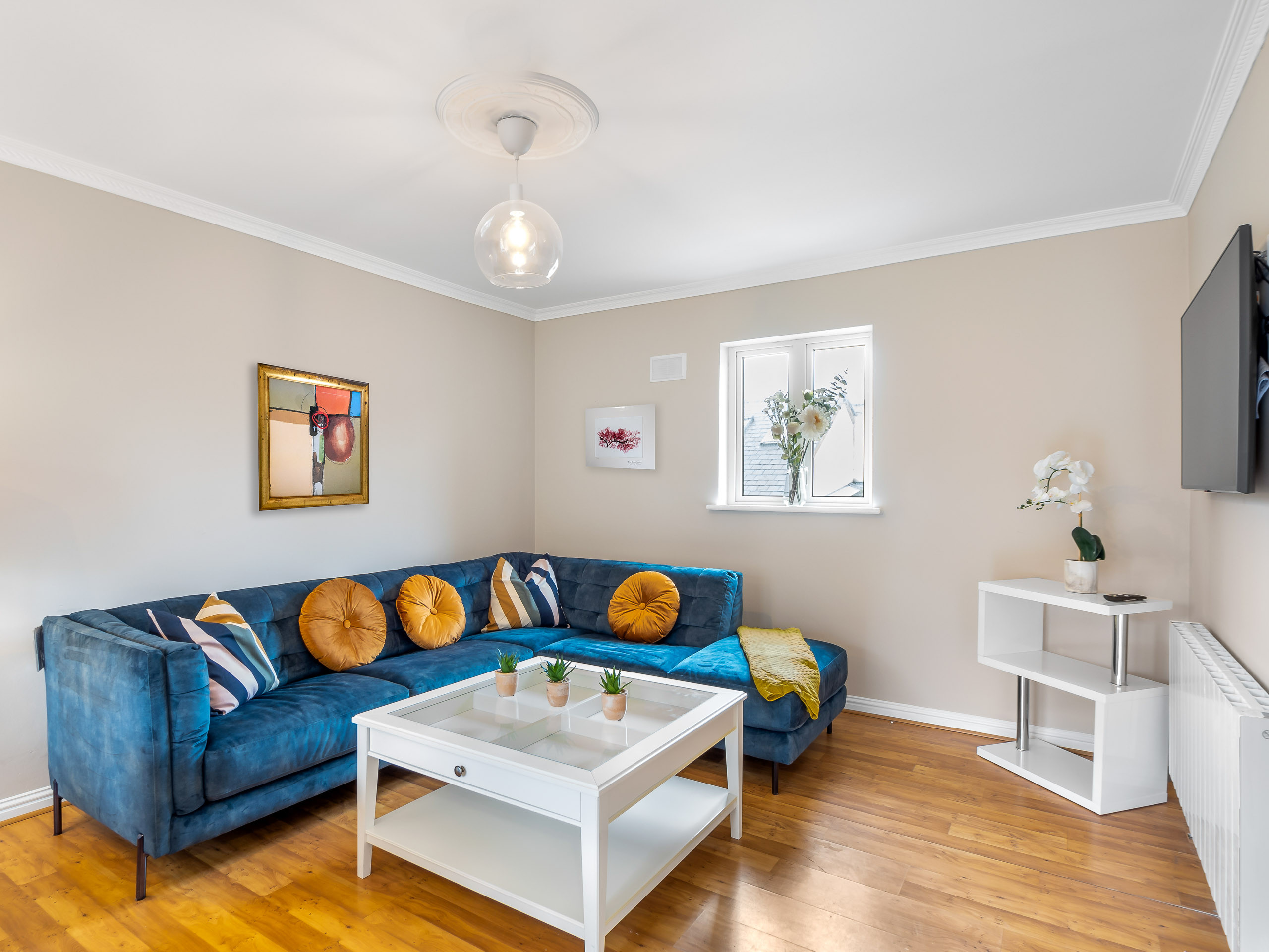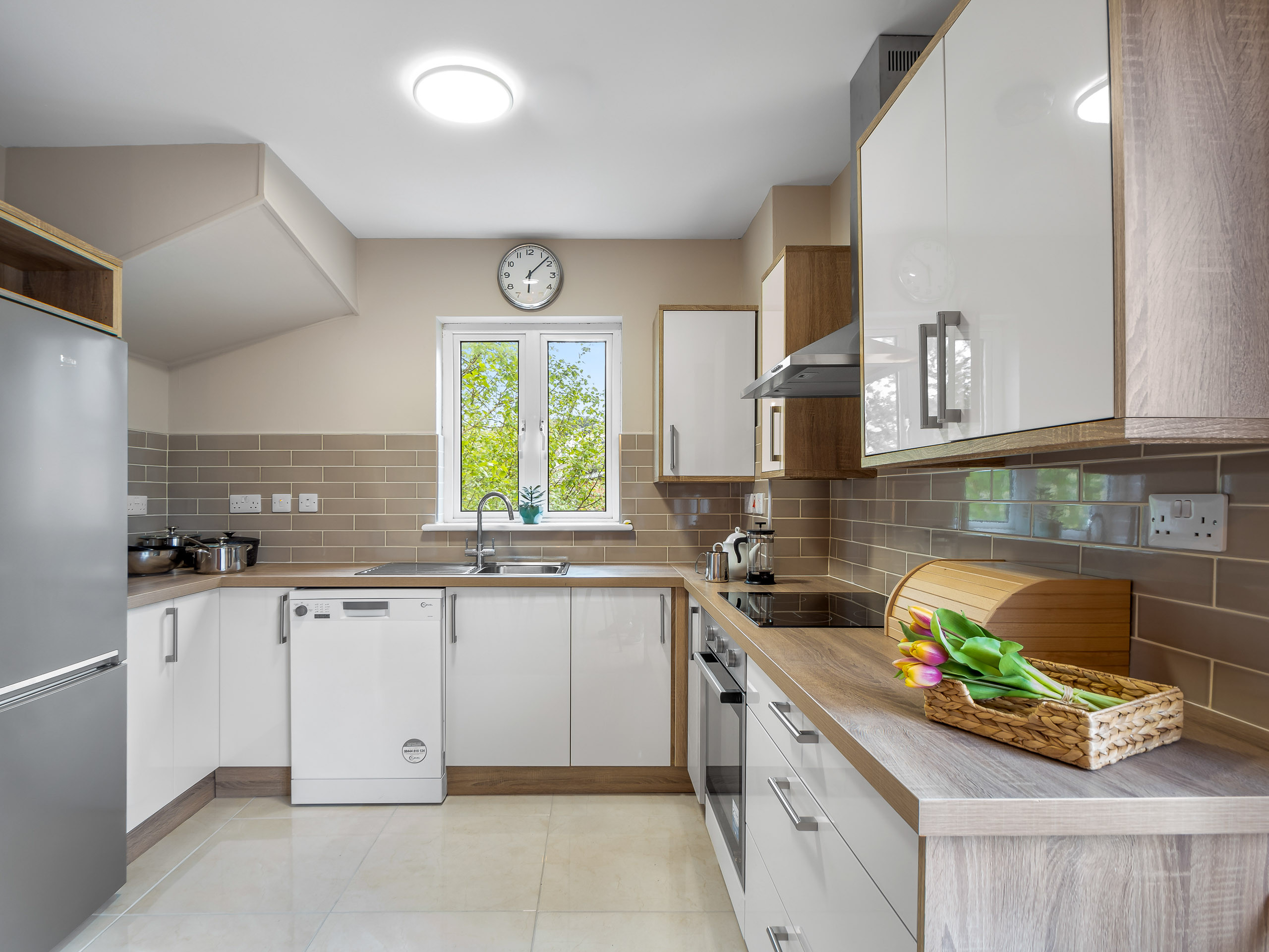 The kitchen is fully equipped with essential cooking amenities including a dishwasher, electric oven & hob, microwave, coffee machine, kettle, and toaster. Large fridge/freezer.