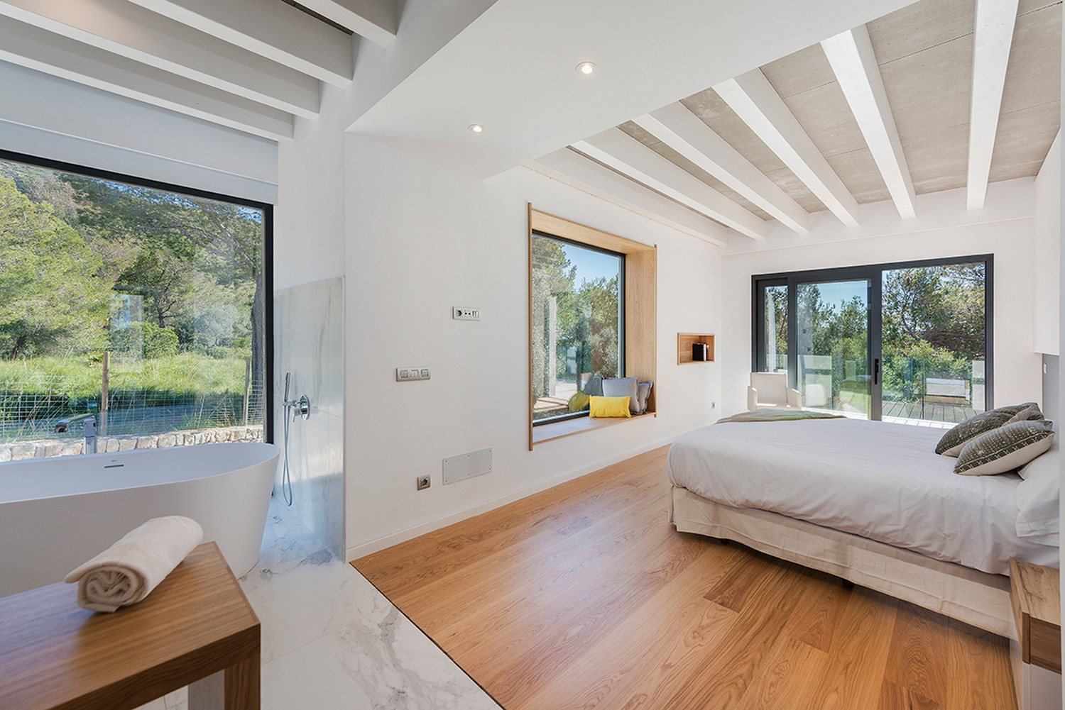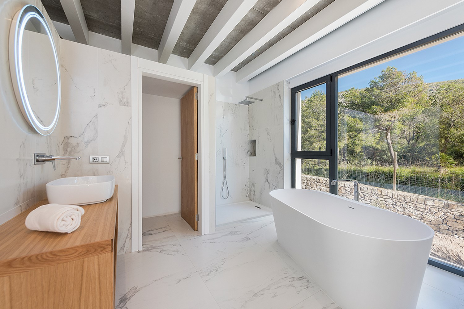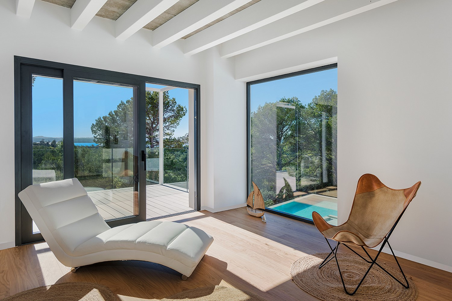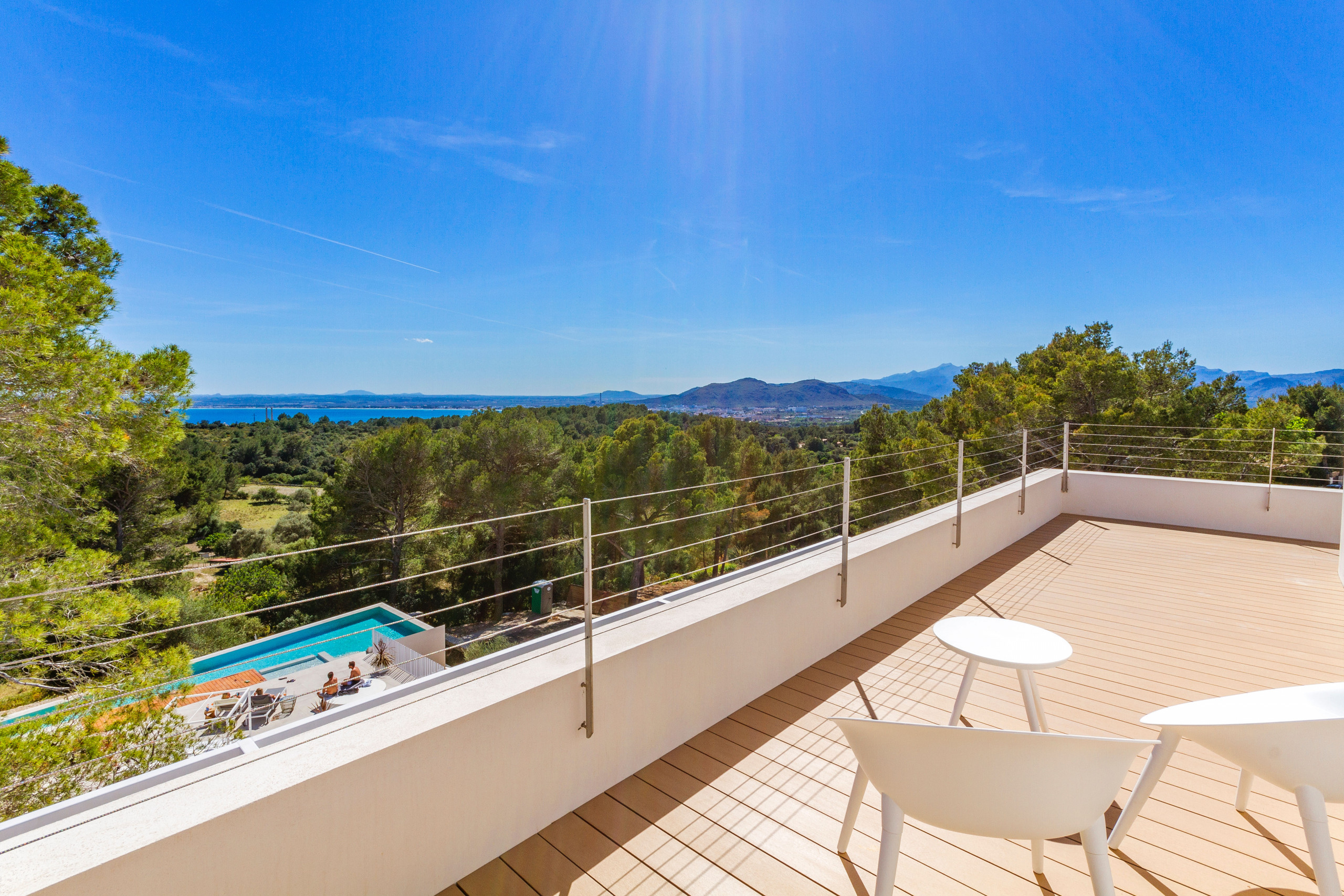 This brand new property offers marvellous views on the bay of Alcudia. A luxurous hideaway to spent your holidays with family or friends. The property is located in an elevated position with views across wonderful Green belt land to the Bay of Pollença. There are landscaped terrace gardens. The infinity pool has a water fall and a tiled and decked solarium furnished with loungers and a Balinese day bed. You will see that no expense has been spared in the construction and styling of this villa. With 4 bedrooms and 3 bathrooms, it accommodates 8 guests and is located in an affluent and picturesque zone known as the sky of Bonaire. The covered outdoor dining area is close to the pool with a further dining area by the BBQ. The sitting-dining room is very spacious and has no less than 3 floor to ceiling glass walls which open to the terrace, garden and pool. The kitchen is fabulous and has no less than three ovens. This kitchen lacks for nothing with its large island, two sinks and dining area. The room can be open plan to the sitting room or kept separate just by closing the large pocket door. Bedroom one has a kingsized bed and dual aspect views of the surrounding countryside and mountains. There is a spectacular freestanding bath and open marble shower with private WC. This suite has access to a furnished terrace. There is also a quite reading-chill out space with views to the sea on the first floor. Bedroom two has a kingsized bed with access to a decked terrace and en suite bathroom. Bedroom three has a kingsize bed with a bathroom ensuite and views to the nature. Bedroom four is equipped with two single beds. There is secured off Street parking.