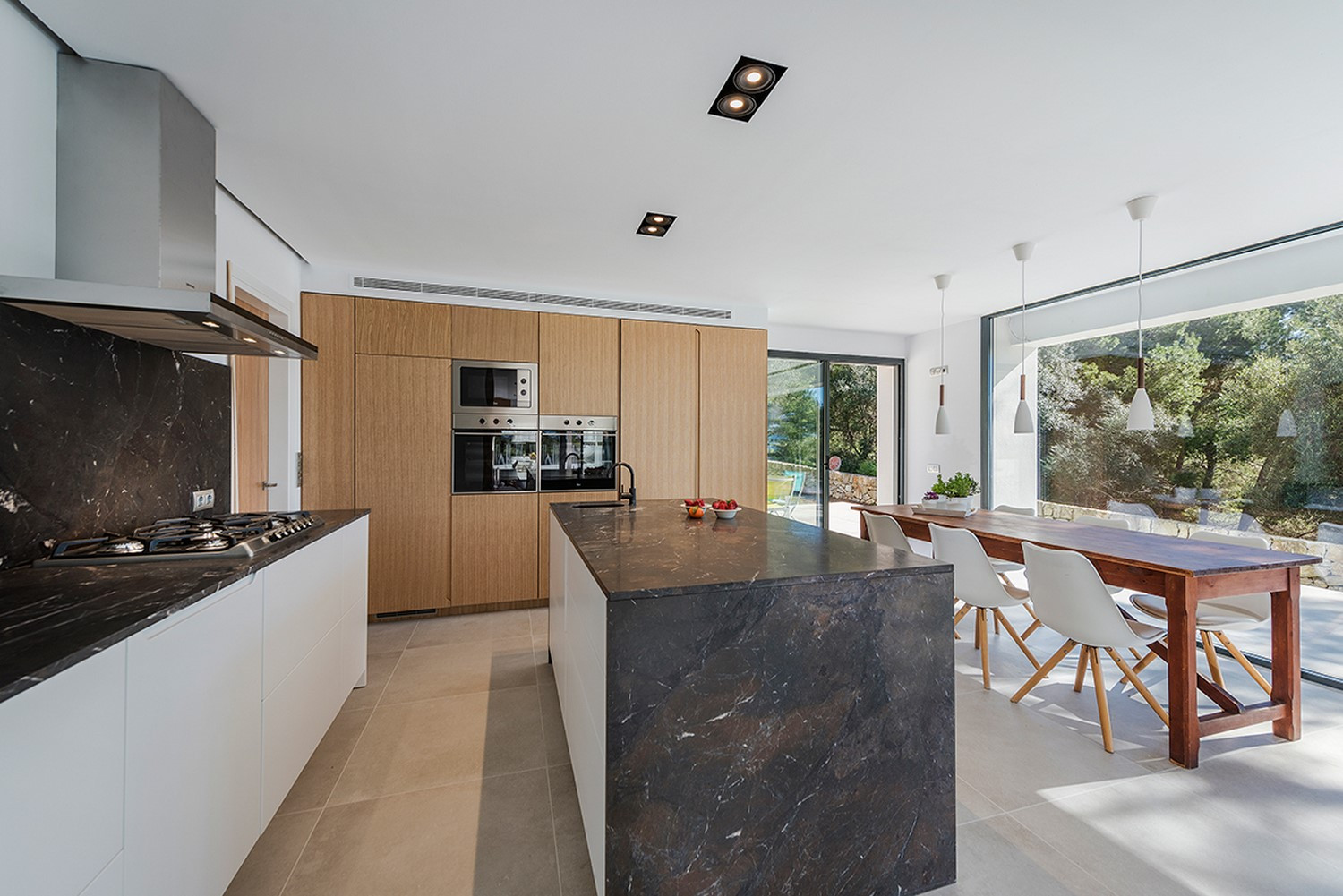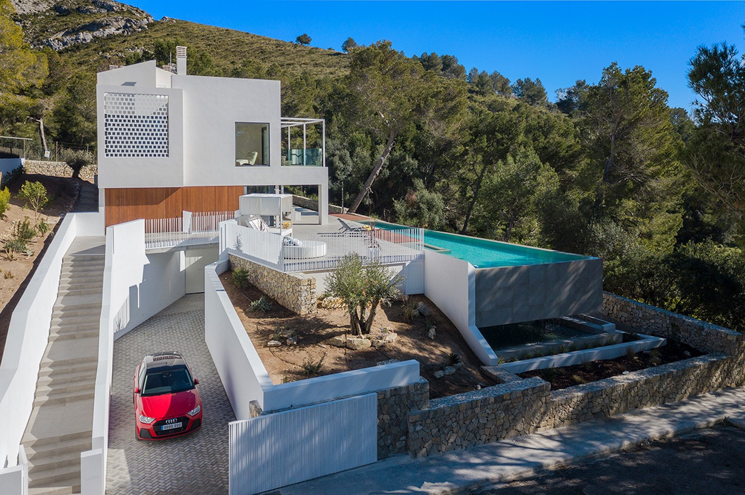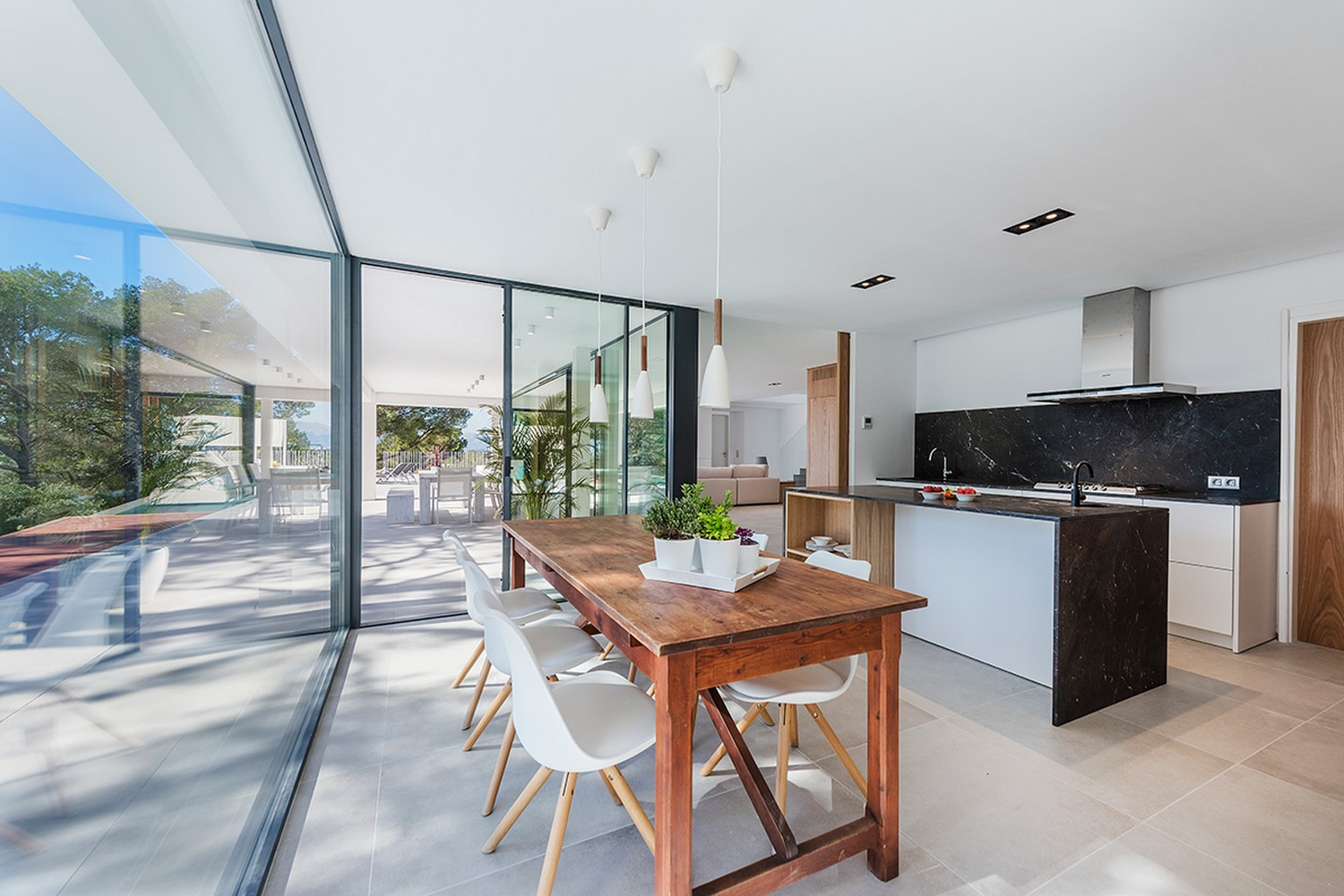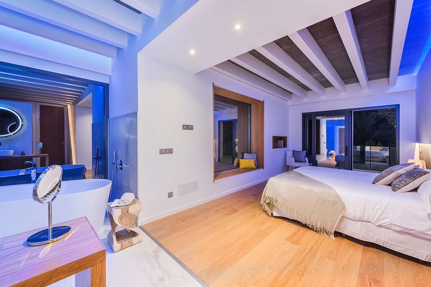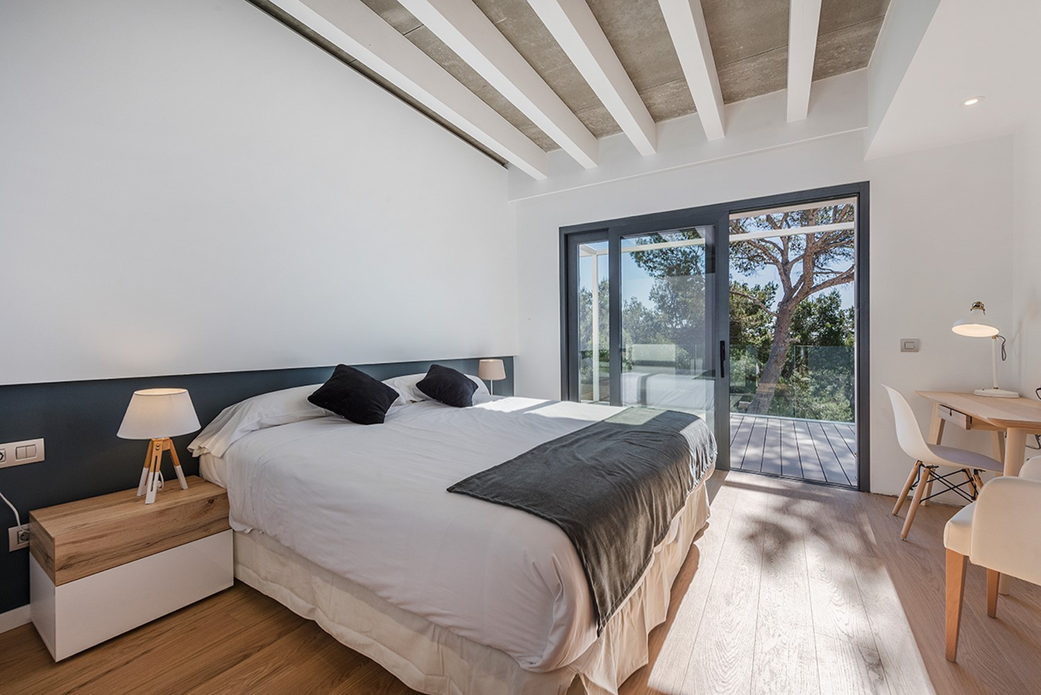 This brand new property offers marvellous views on the bay of Alcudia. A luxurous hideaway to spent your holidays with family or friends. The property is located in an elevated position with views across wonderful Green belt land to the Bay of Pollença. There are landscaped terrace gardens. The infinity pool has a water fall and a tiled and decked solarium furnished with loungers and a Balinese day bed. You will see that no expense has been spared in the construction and styling of this villa. With 4 bedrooms and 3 bathrooms, it accommodates 8 guests and is located in an affluent and picturesque zone known as the sky of Bonaire. The covered outdoor dining area is close to the pool with a further dining area by the BBQ. The sitting-dining room is very spacious and has no less than 3 floor to ceiling glass walls which open to the terrace, garden and pool. The kitchen is fabulous and has no less than three ovens. This kitchen lacks for nothing with its large island, two sinks and dining area. The room can be open plan to the sitting room or kept separate just by closing the large pocket door. Bedroom one has a kingsized bed and dual aspect views of the surrounding countryside and mountains. There is a spectacular freestanding bath and open marble shower with private WC. This suite has access to a furnished terrace. There is also a quite reading-chill out space with views to the sea on the first floor. Bedroom two has a kingsized bed with access to a decked terrace and en suite bathroom. Bedroom three has a kingsize bed with a bathroom ensuite and views to the nature. Bedroom four is equipped with two single beds. There is secured off Street parking.