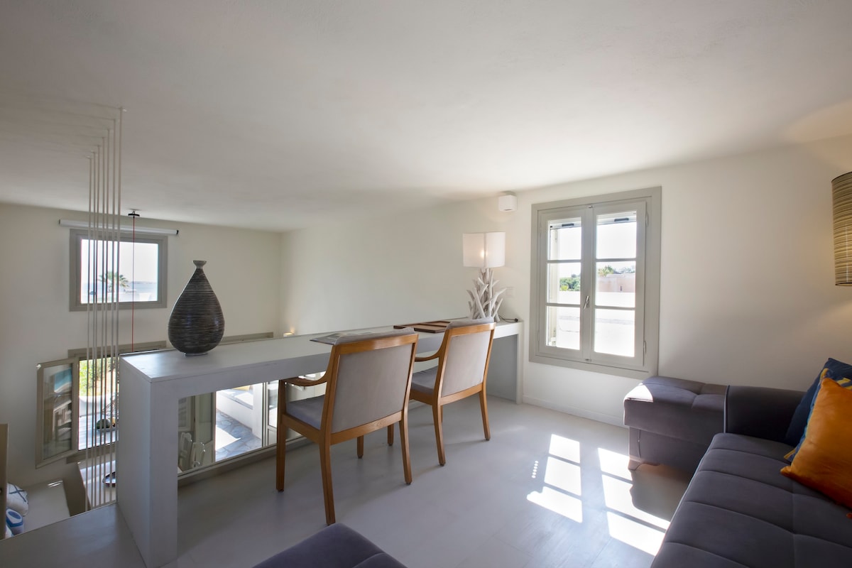 Indoors, the large living, dining and kitchen area is very modern, full of light, with very high ceilings and gorgeous sea, island and garden views. There is a large dining table, ideal for family gatherings, a modern living area and a fully-equipped kitchen.