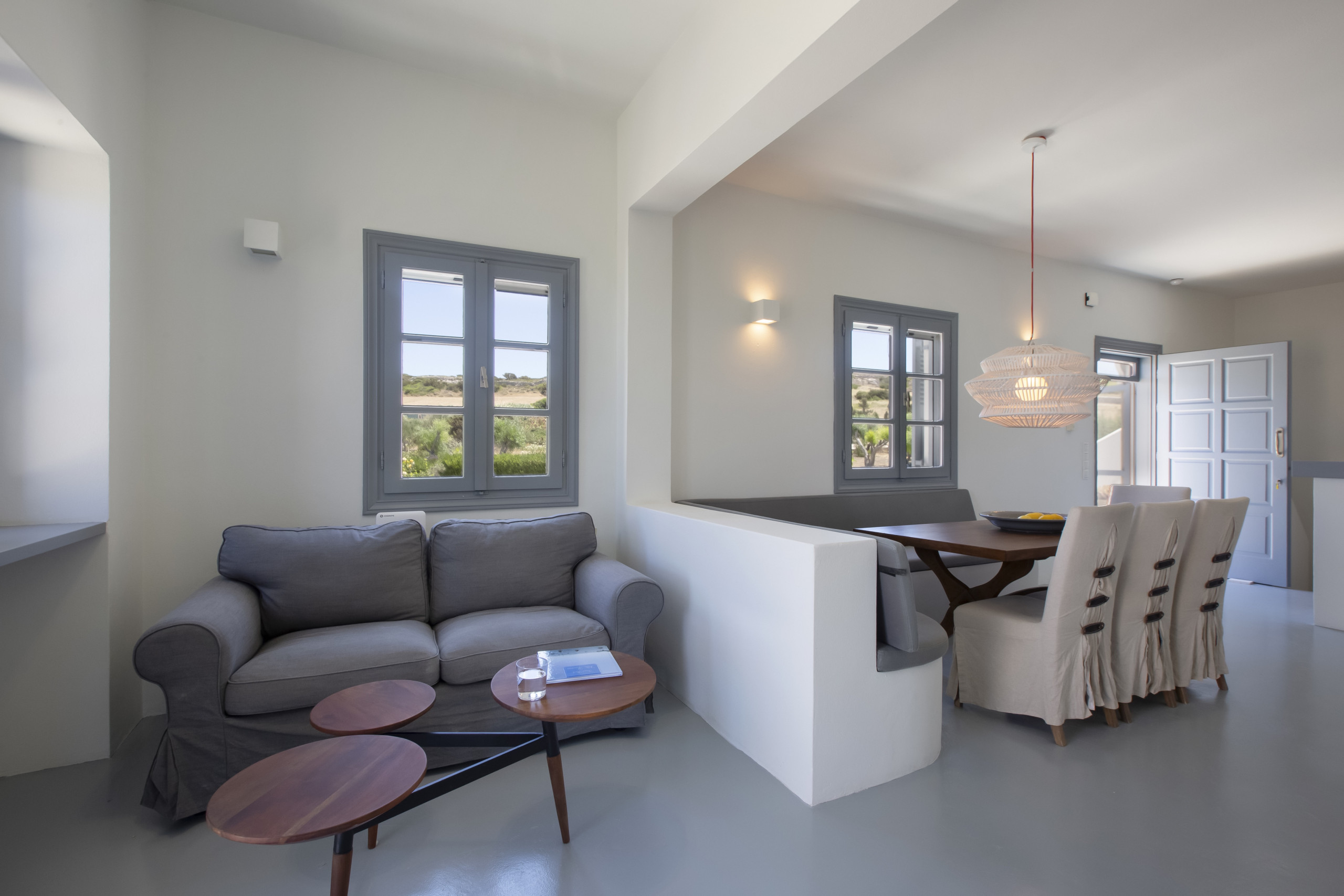 The villa is designed in classic Cycladic style with white walls and Aegean blue shutters, blending modern comfort with local charm. Inside, you’ll find a large living, dining, and kitchen area, thoughtfully furnished for both style and functionality. The kitchen is fully equipped, and all bedrooms offer comfort and privacy, with three queen beds, two twin bedrooms, and an extra child’s bed in the living area. The ensuite bathrooms, spacious layout, and elegant design throughout.