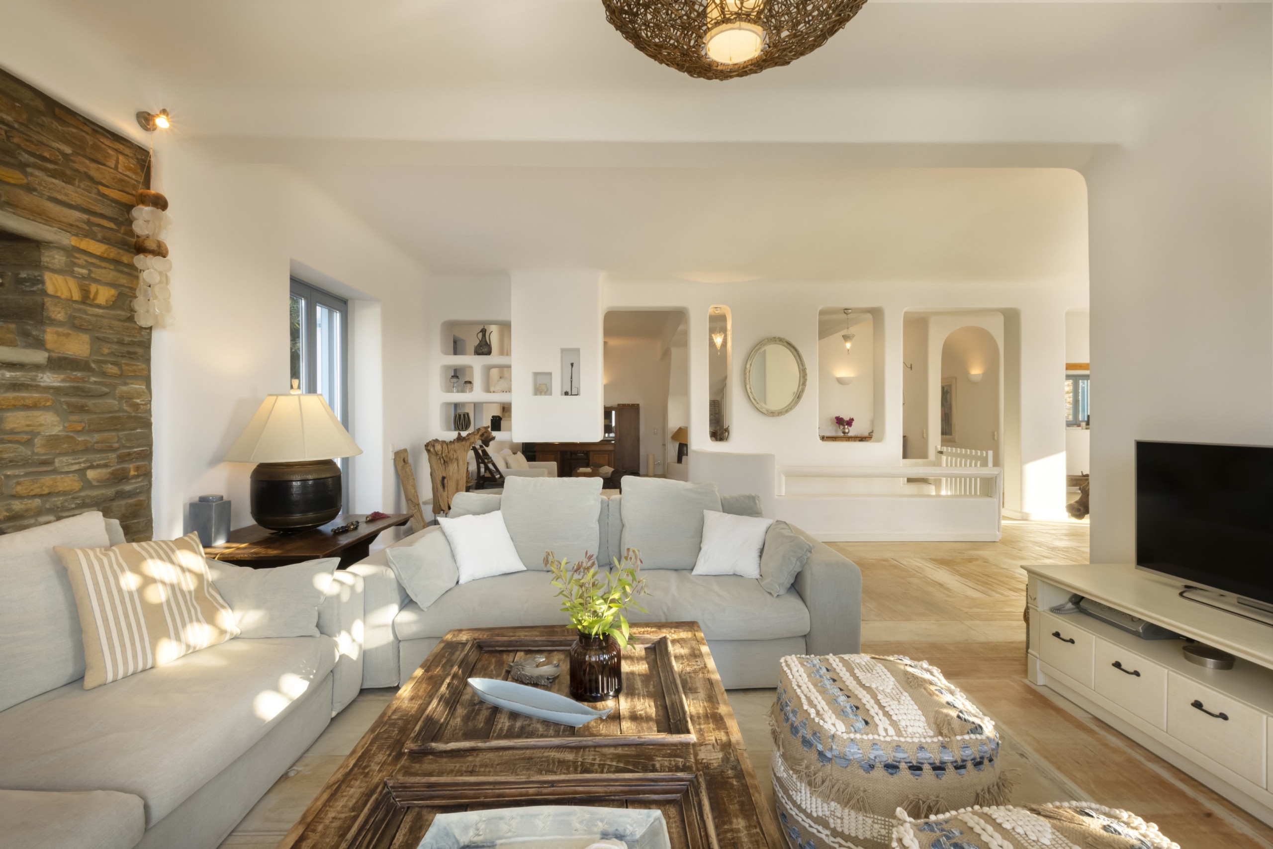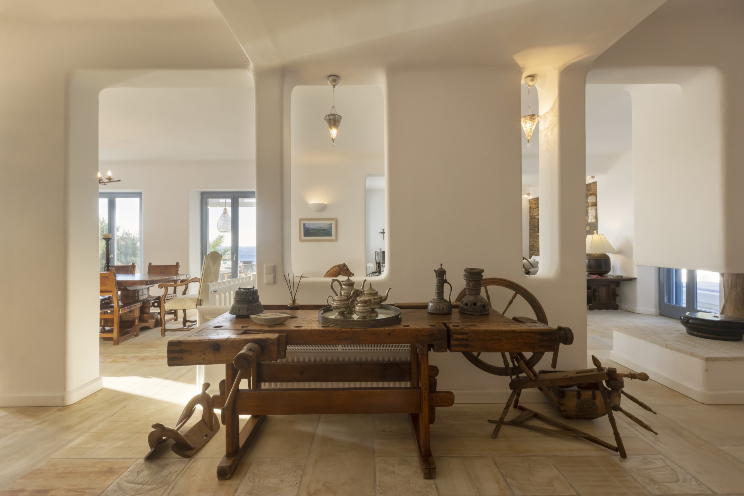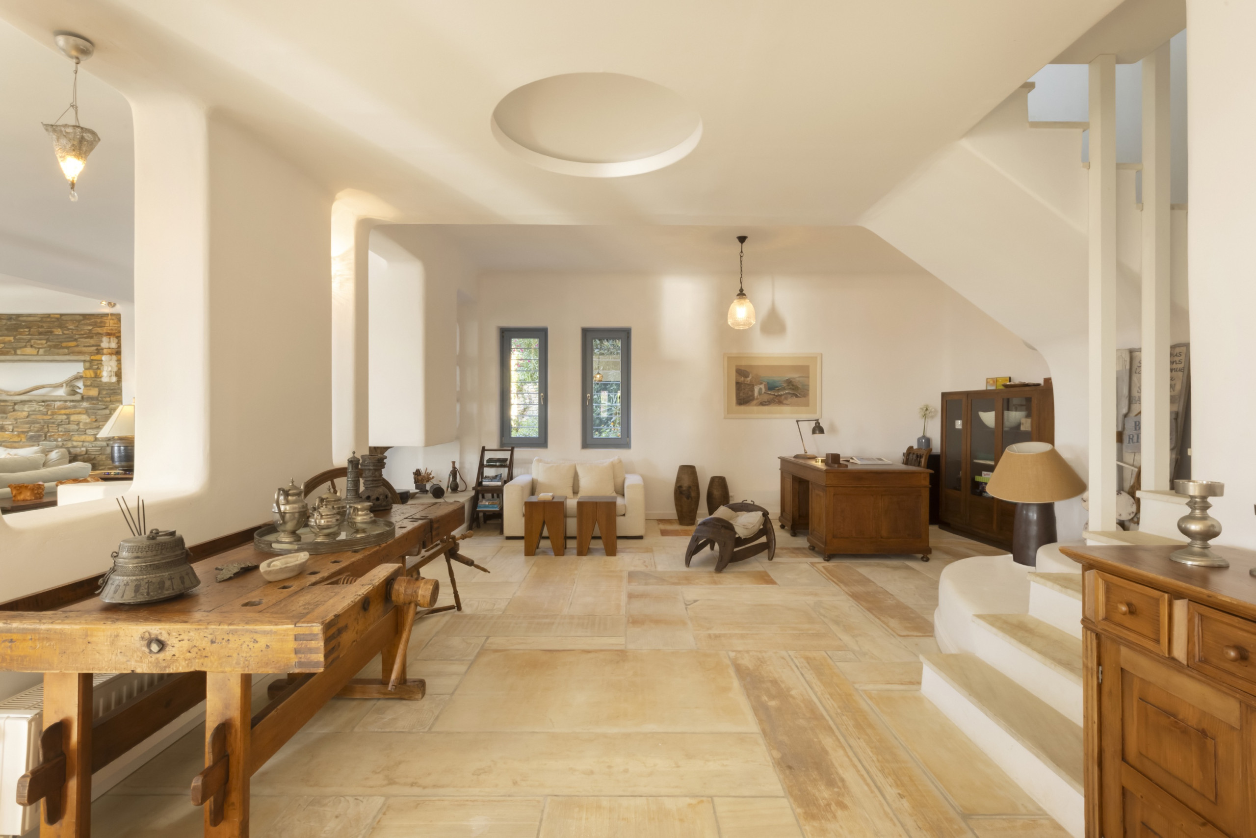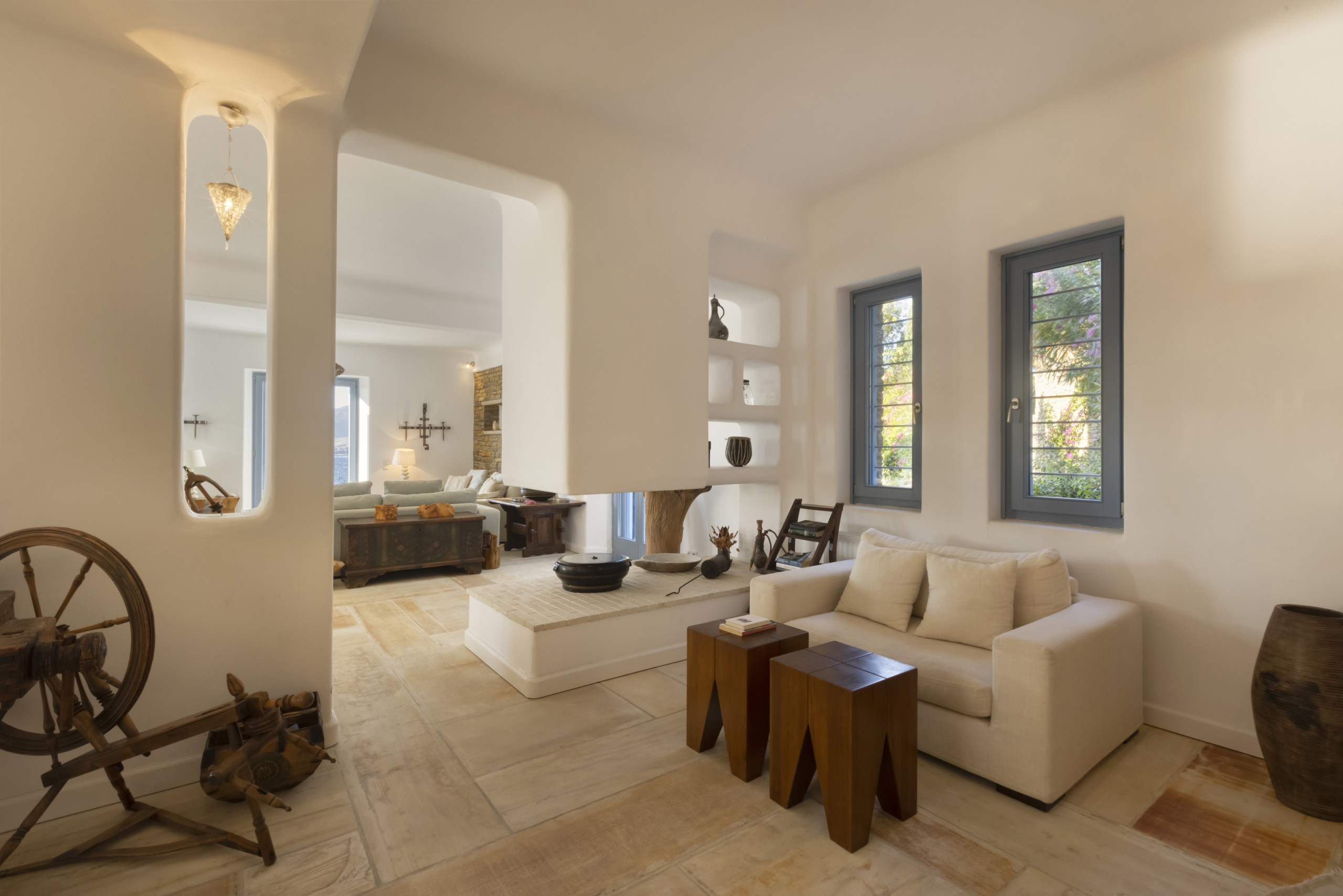 The residence is set on three levels. It has been built in keeping with the local architecture, using local stone and featuring wooden elements and whitewashes walls. From its garden, verandas and outdoor spaces you will savor the Aegean sea, take in the island’s atmosphere and relax in elegance and comfort.