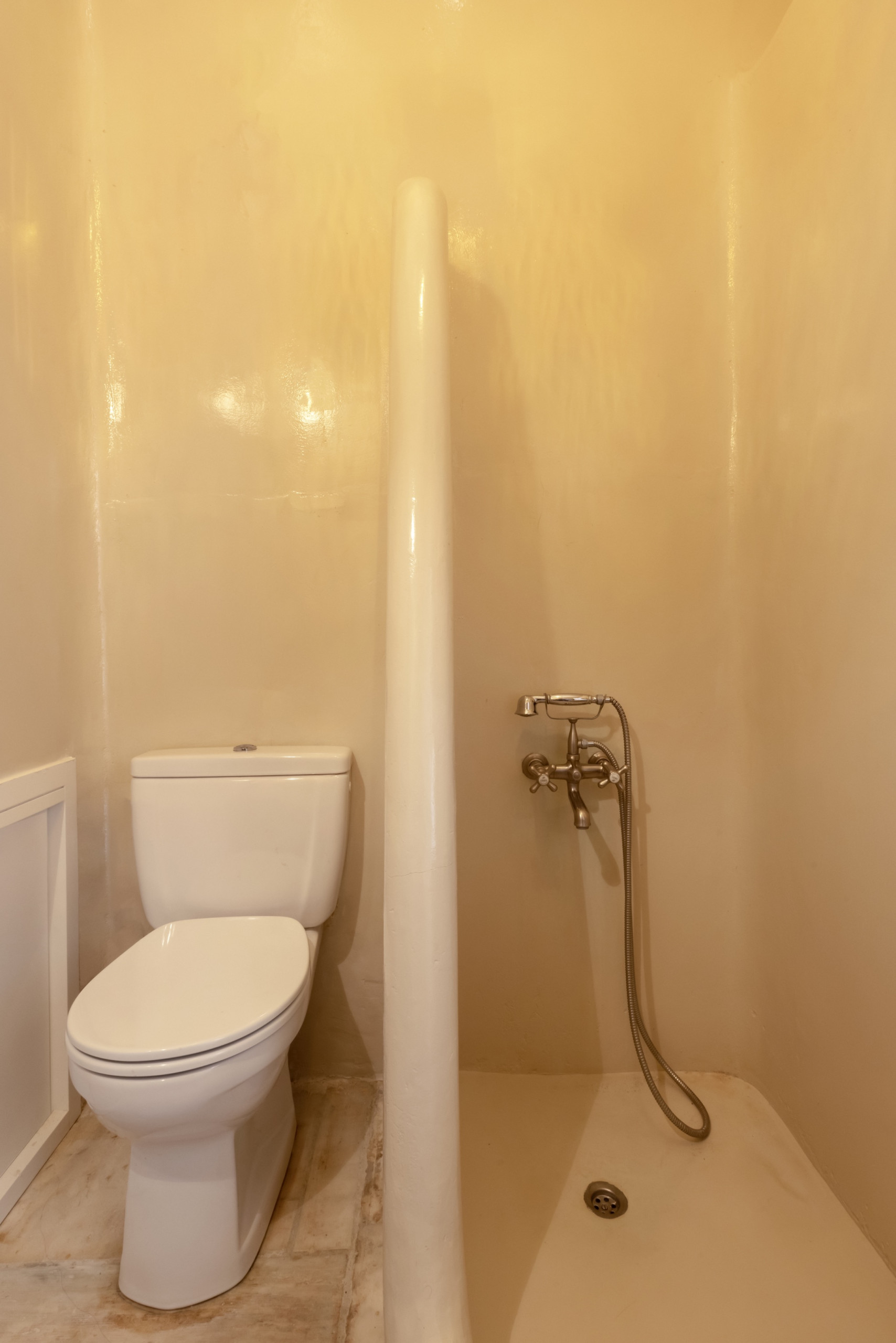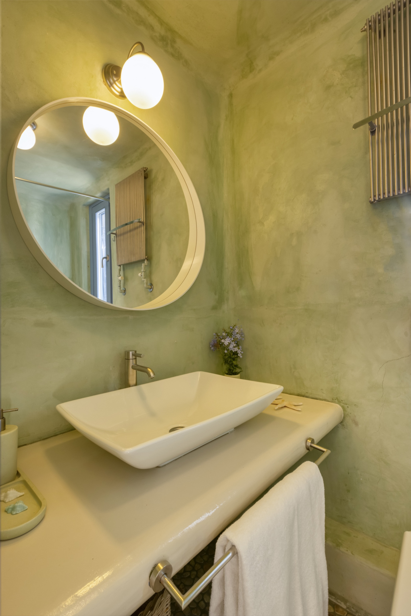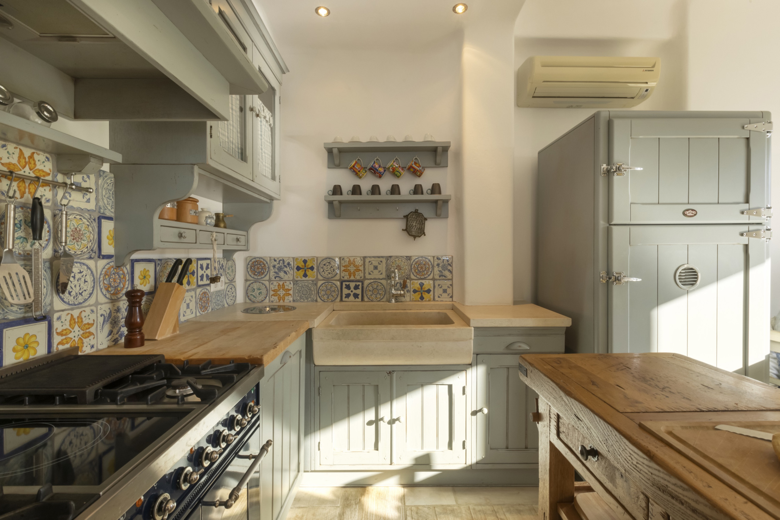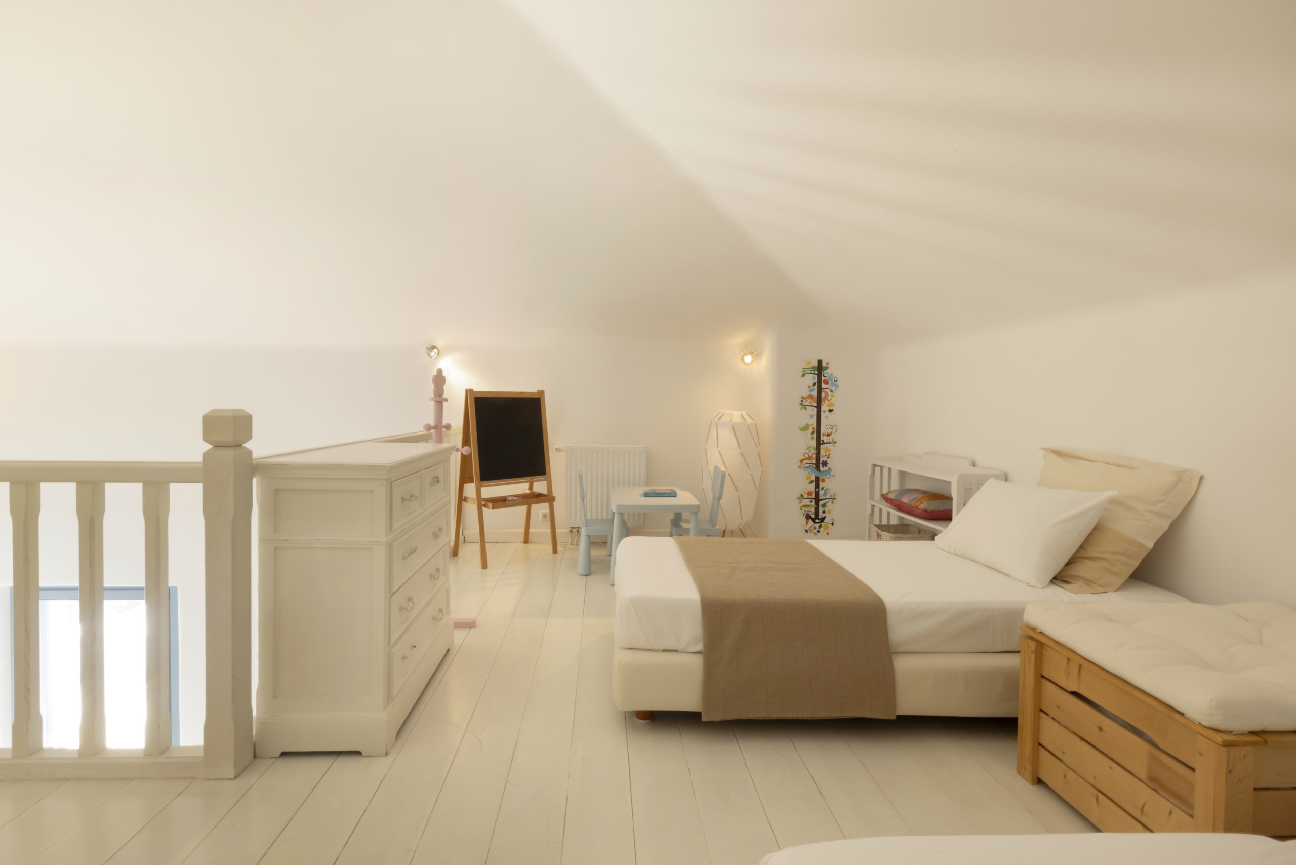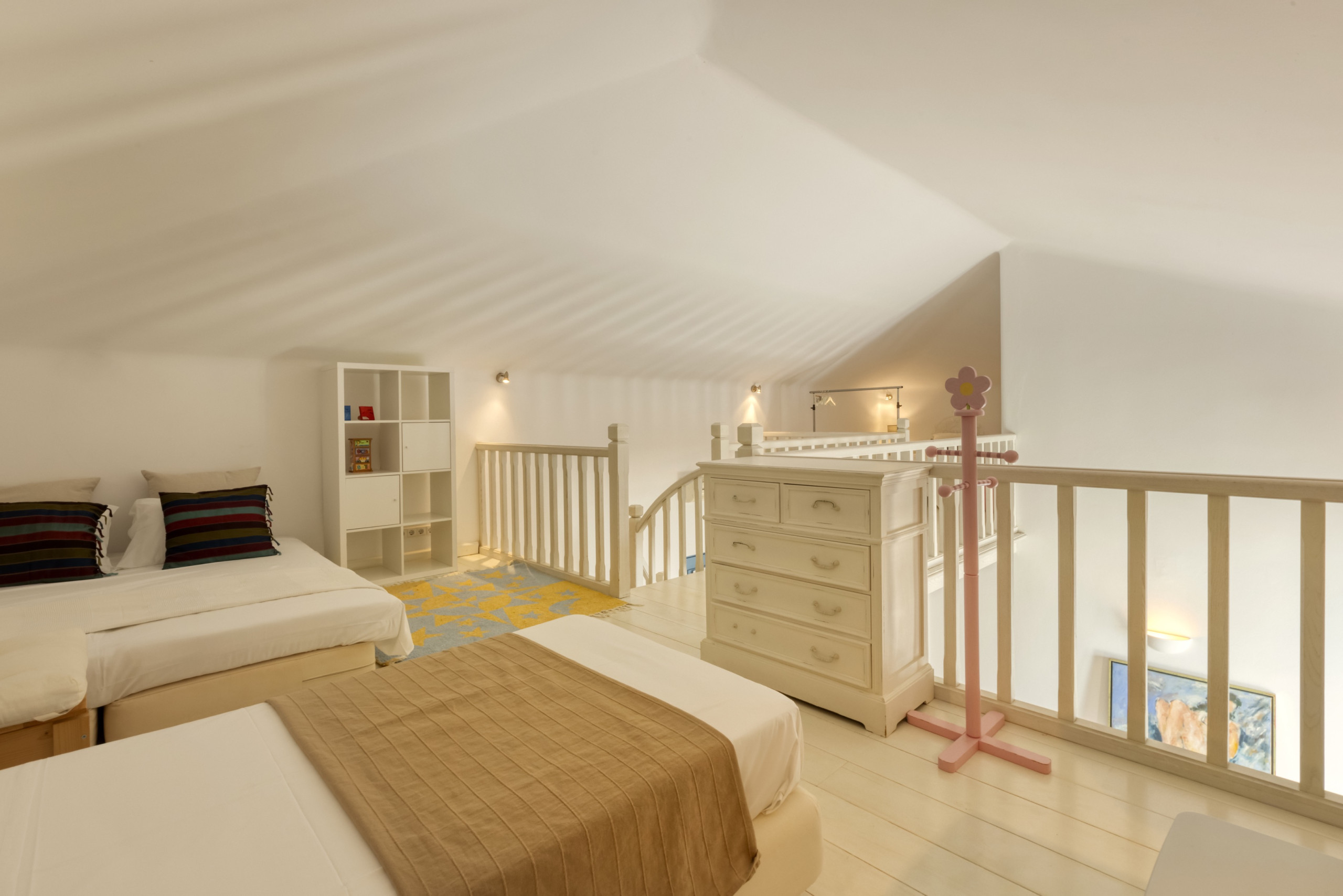 On the ground floor you will spend time in the villa’s sizeable living area with a comfortable sitting room and a large dining area that can comfortably seat a big group or family. There is also an office area, a WC and a double bedroom with a private bathroom. The retro style kitchen is self-contained and fully equipped and has its own dining table and sitting area.