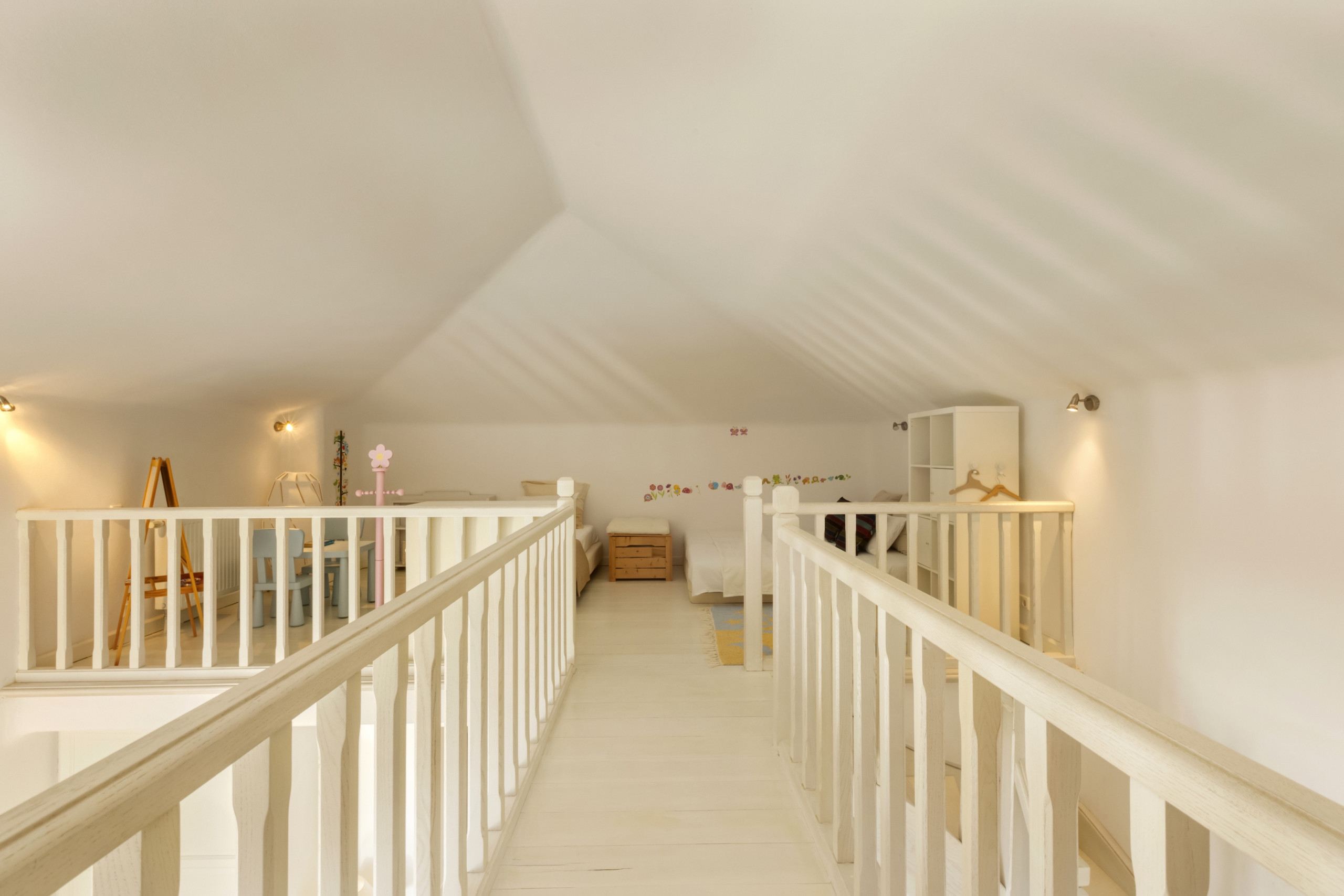 A large wooden staircase leads to a large open plan room in the attic with two beds and another attic bedroom with a single bed.