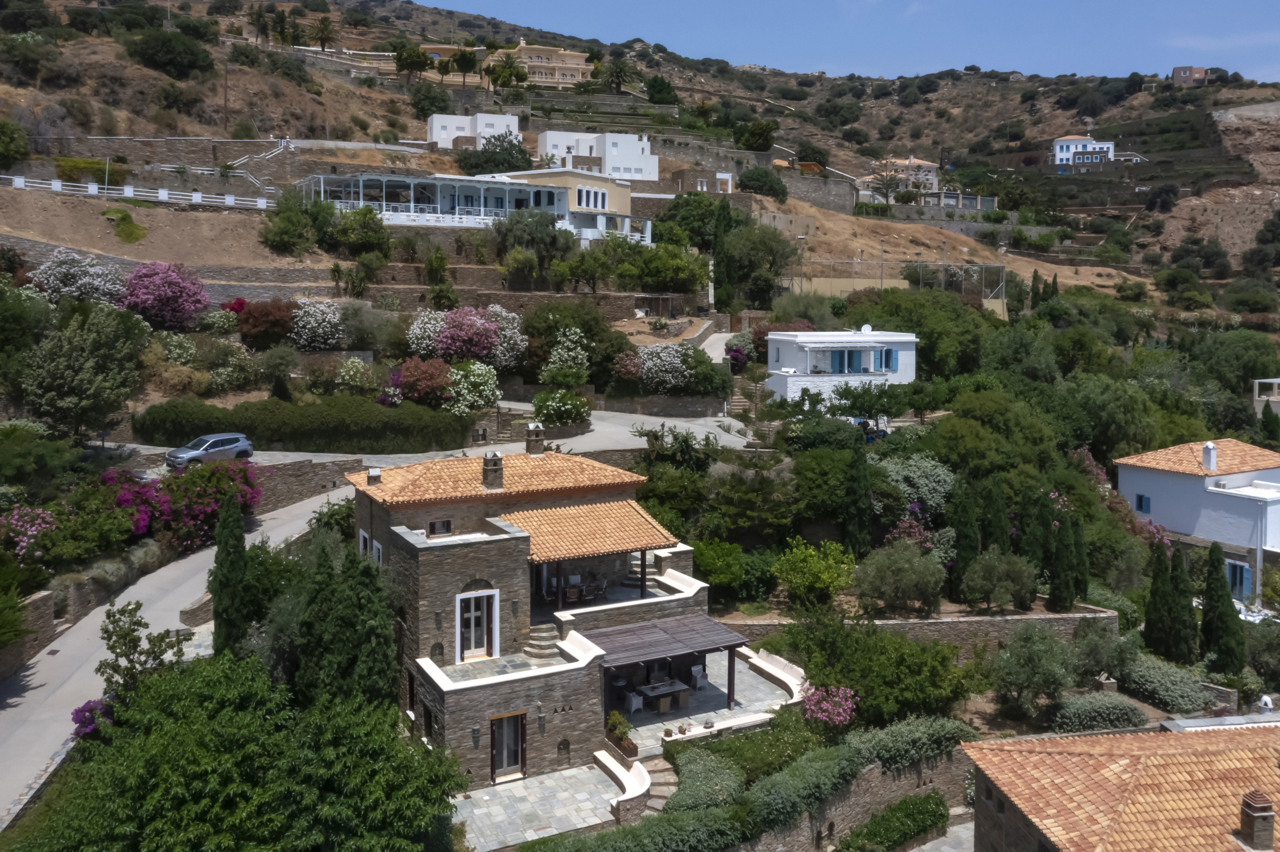 To best enjoy your stay in our home and Andros we recommend you hire a car. There is free parking on the premises.