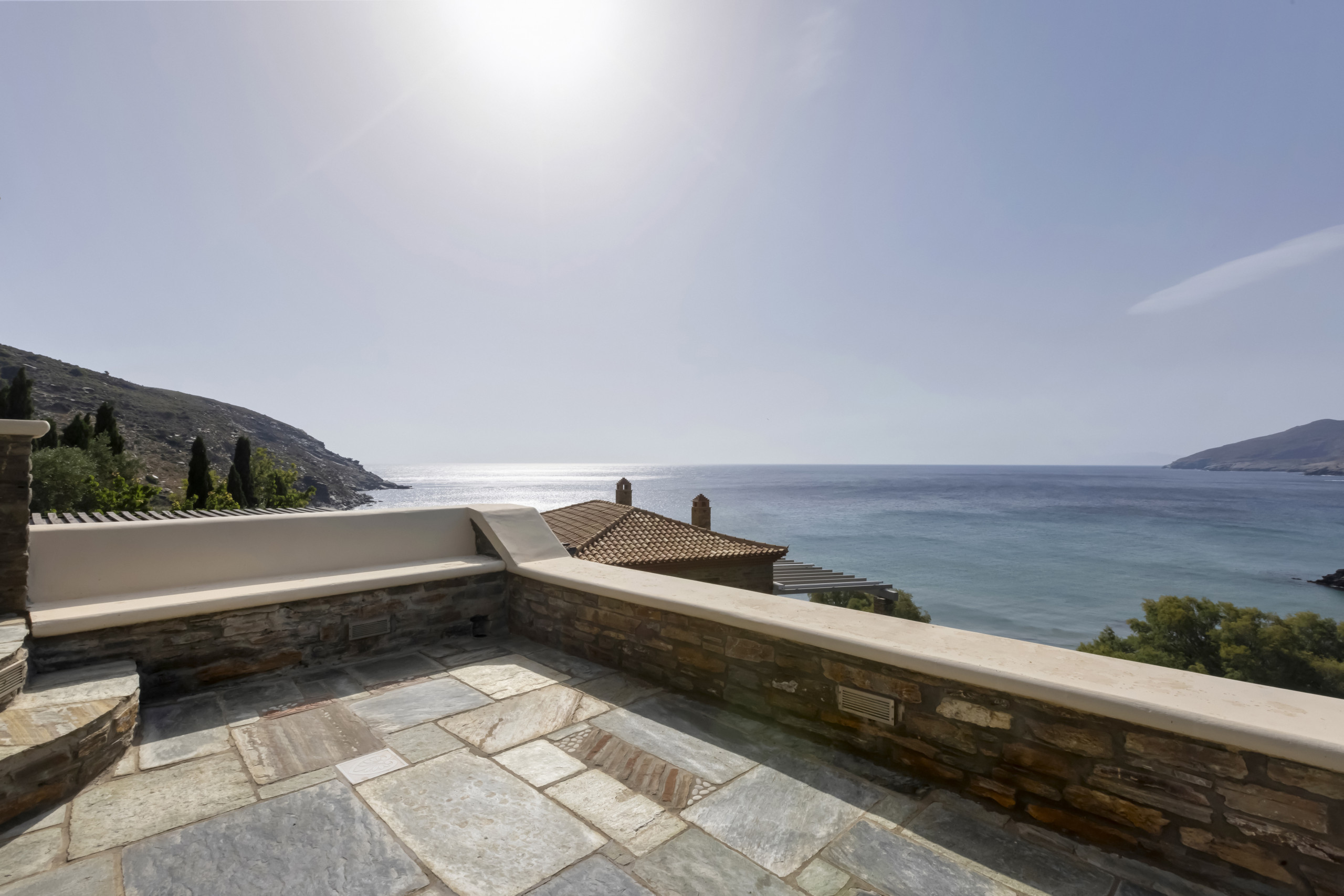 The residence is set in large gardens and over two levels. It has been built in keeping with the local architecture, using local stone and featuring wooden. From its garden, verandas and outdoor spaces you will savor the Aegean sea, take in the island’s atmosphere and relax in elegance and comfort.