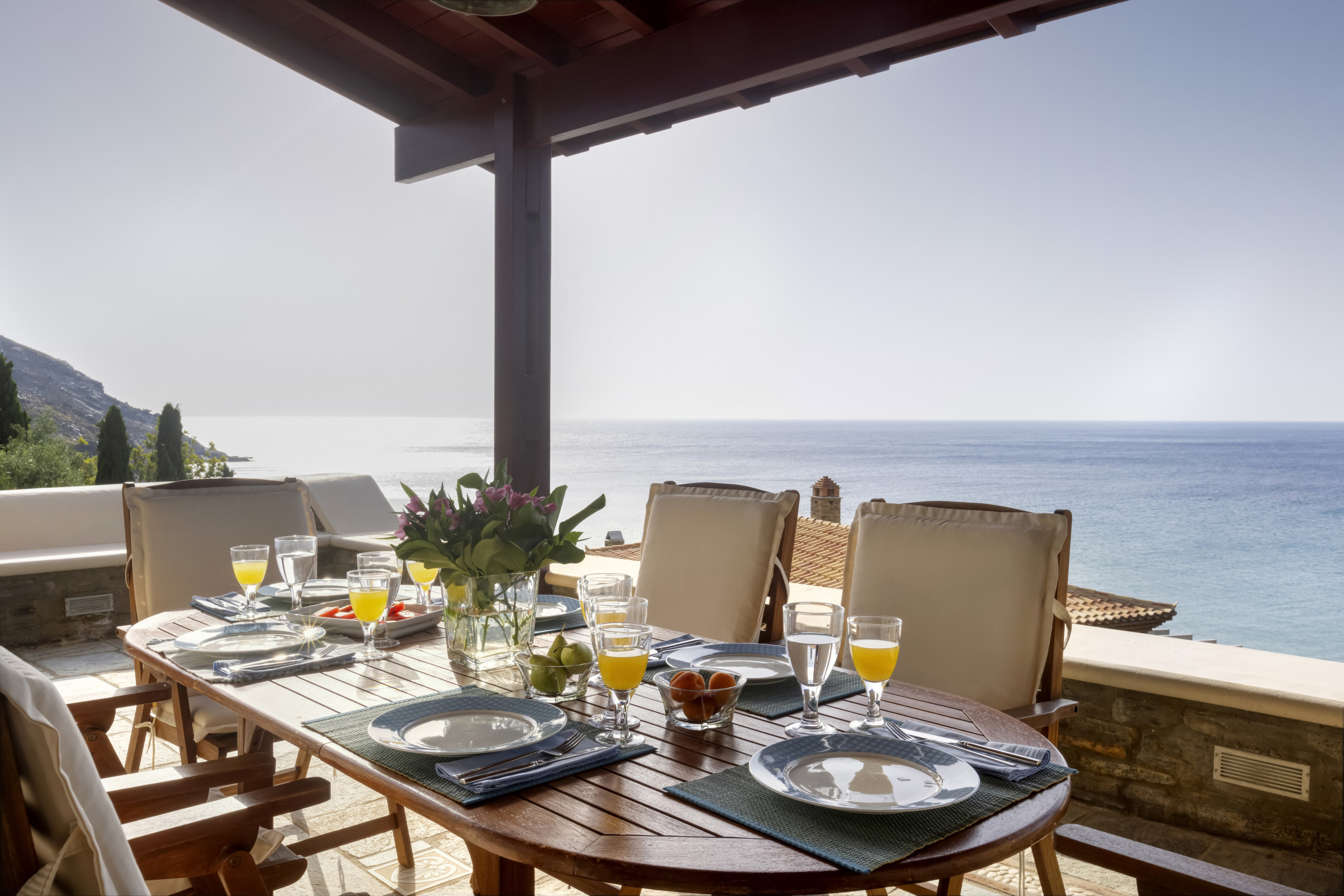 An incredible home with amazing views, set in an idyllic location. Our 4-bedroom villa is set very close to the beach just a short drive from the main town of Andros island and a walk from the lovely village of Stenies. It has extensive gardens and outdoors spaces, all offering stunning sea views. It is ideal for families and groups of friends. Elegant, spacious, and full of light, it is the perfect setting for an unforgettably wonderful holiday.