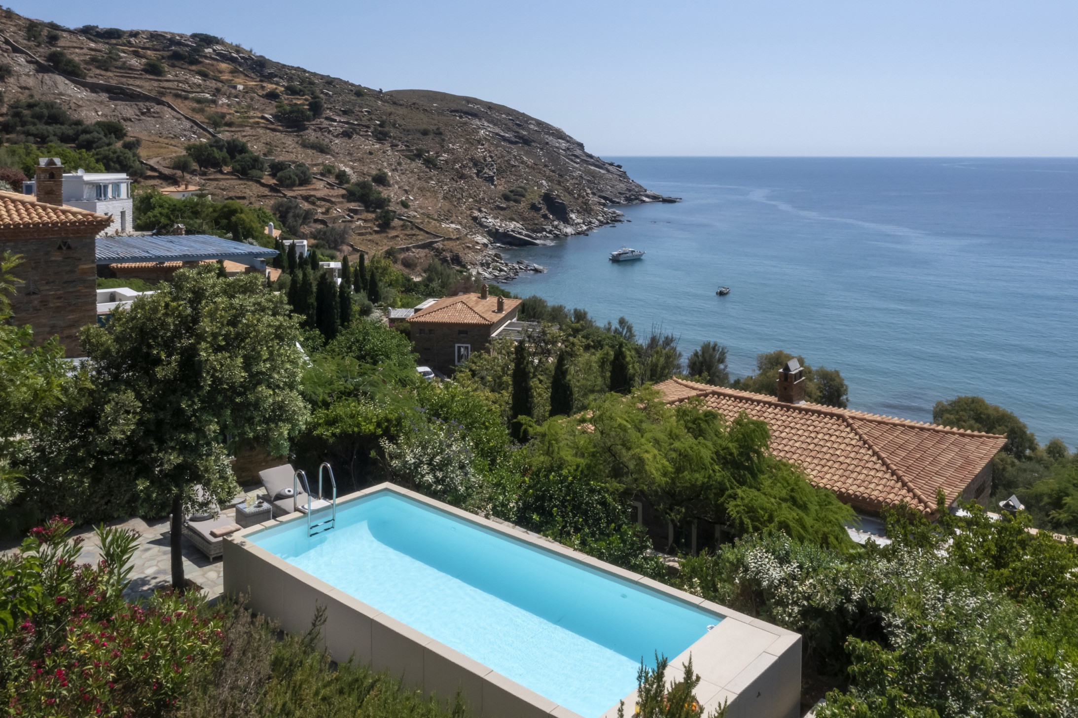 Surrounded by lush gardens, the villa is a short drive from charming local villages, where guests can explore traditional Greek tavernas and shops. This villa on Andros Island promises an unforgettable retreat for families and groups seeking a luxurious Greek island getaway.