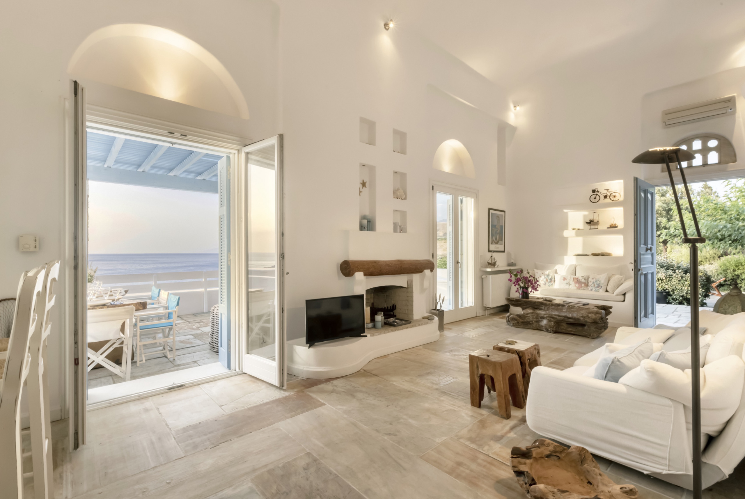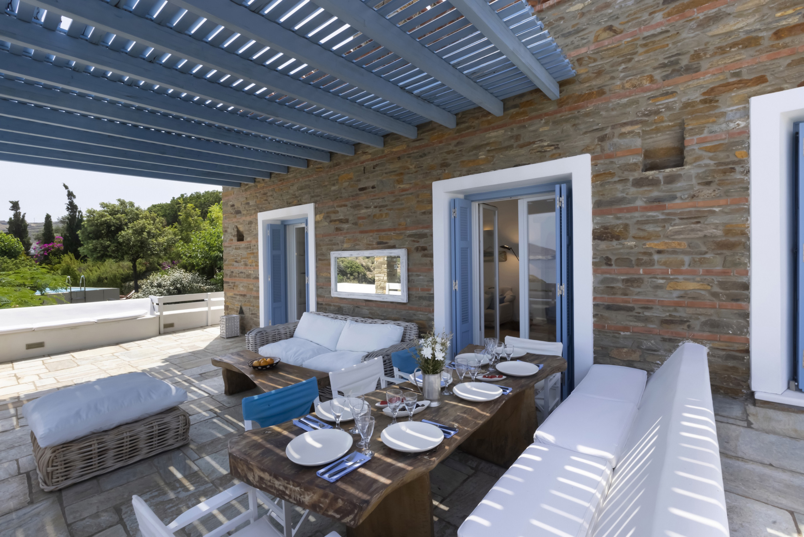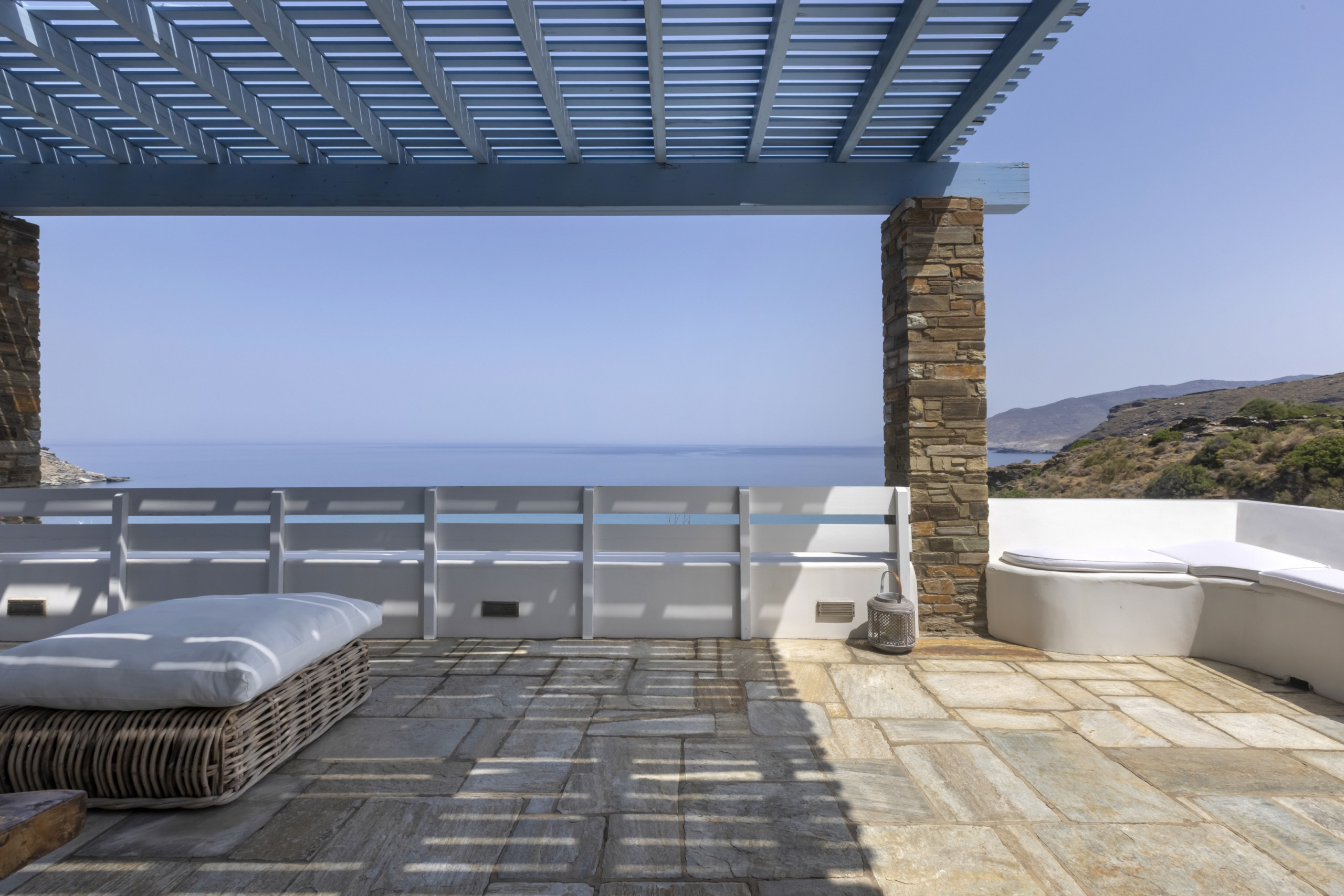 The residence is set in large gardens and over two levels. It has been built in keeping with the local architecture, using local stone and featuring wooden. From its garden, verandas and outdoor spaces you will savor the Aegean sea, take in the island’s atmosphere and relax in elegance and comfort.
