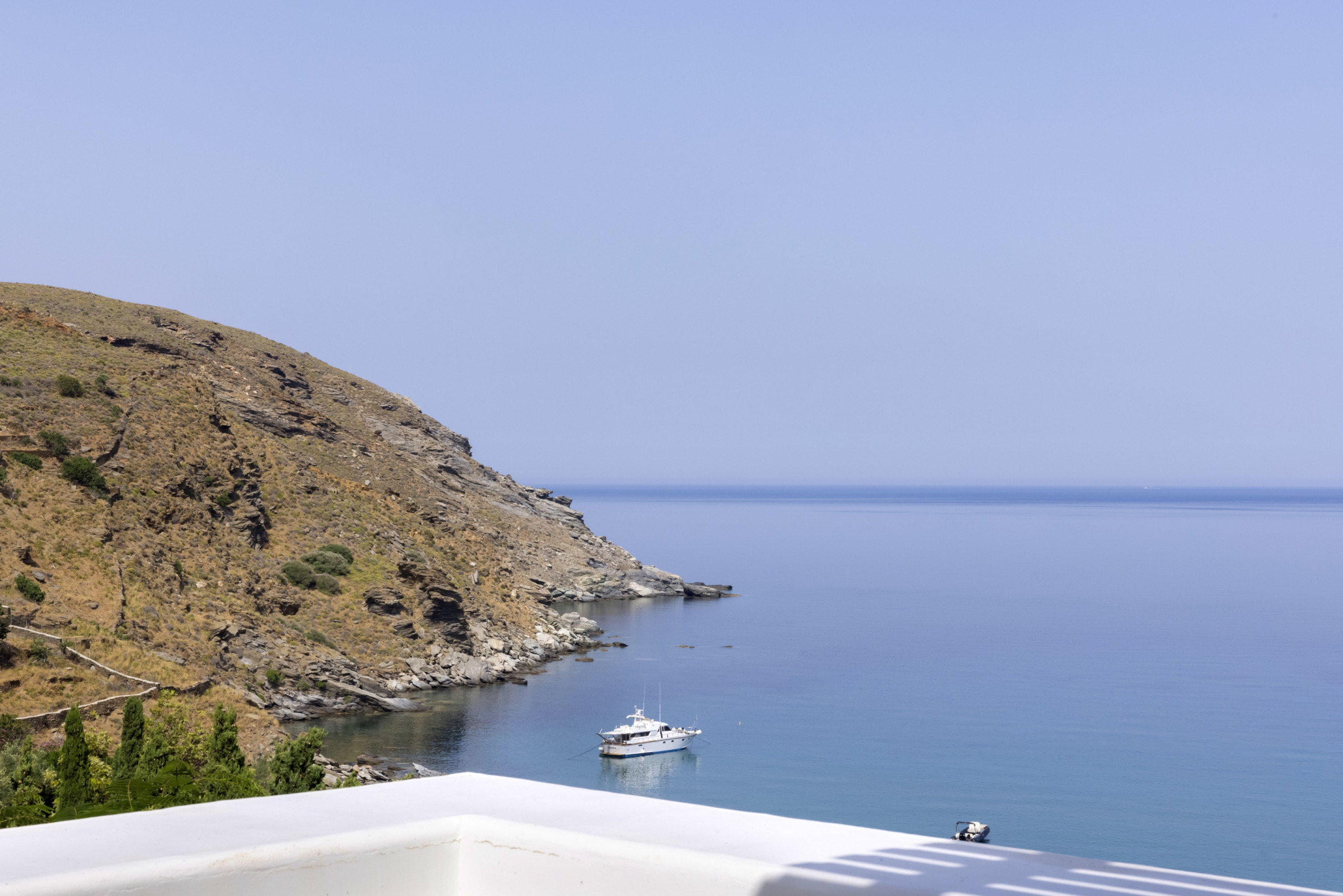 An incredible home with amazing views, set in an idyllic location. Our 4-bedroom villa is set very close to the beach just a short drive from the main town of Andros island and a walk from the lovely village of Stenies. It has extensive gardens and outdoors spaces, all offering stunning sea views. It is ideal for families and groups of friends. Elegant, spacious, and full of light, it is the perfect setting for an unforgettably wonderful holiday.