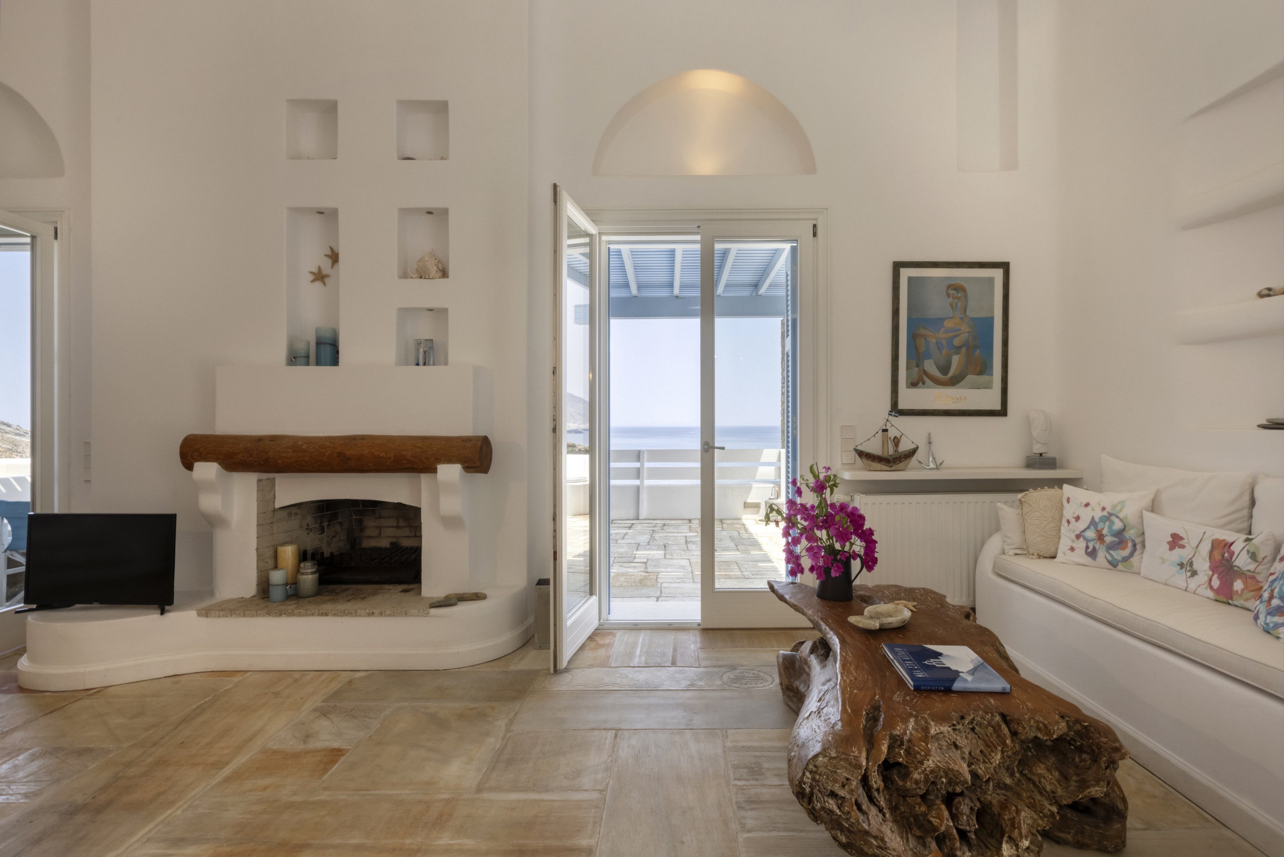 Enjoy stunning sea views while staying in this big, comfortable, elegant island home just a few steps away from a sandy beach and the Aegean Sea waters. Our 5-bedroom villa is set in an idyllic location and comes with a garden and outdoor spaces for you to enjoy. It’s just a short drive from the picturesque Hora, the island’s main town, and a short walk from the beautiful village of Stenies.
