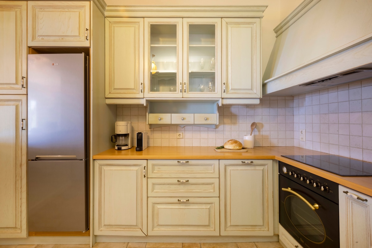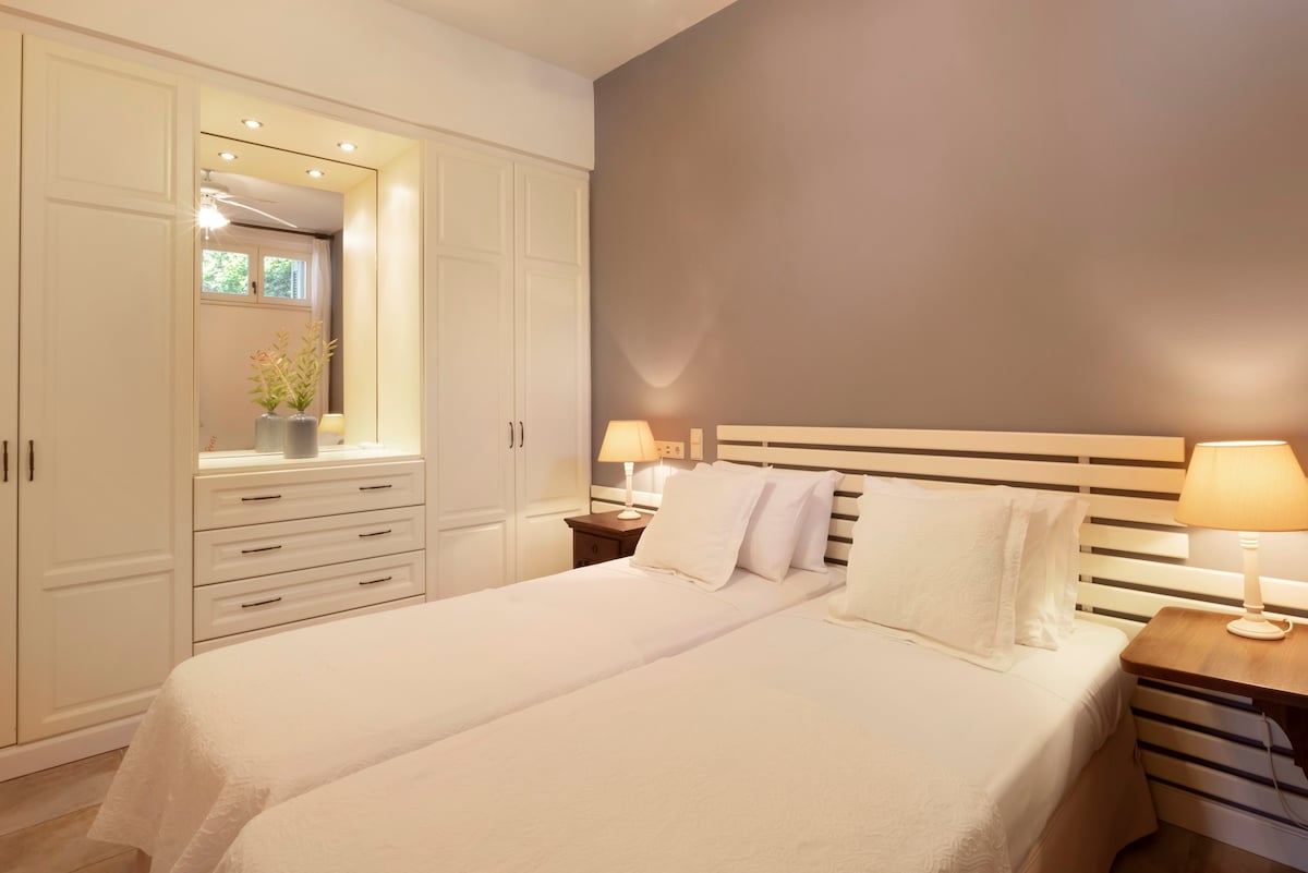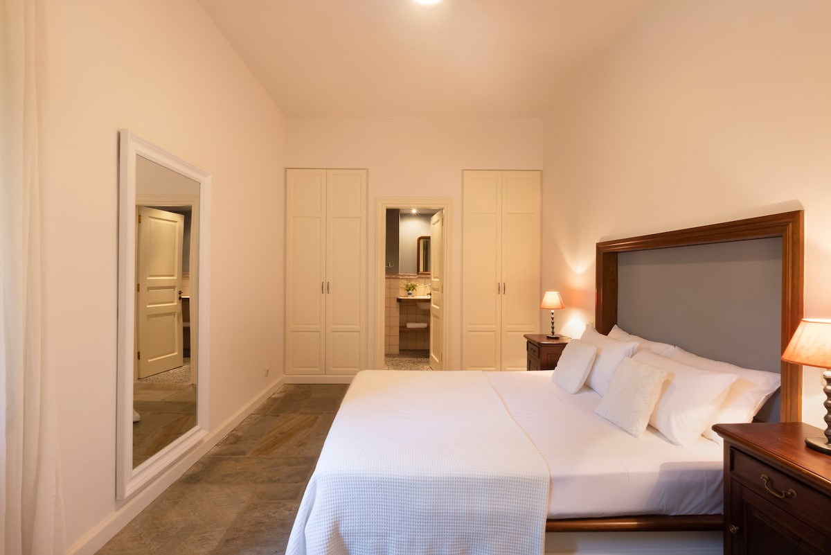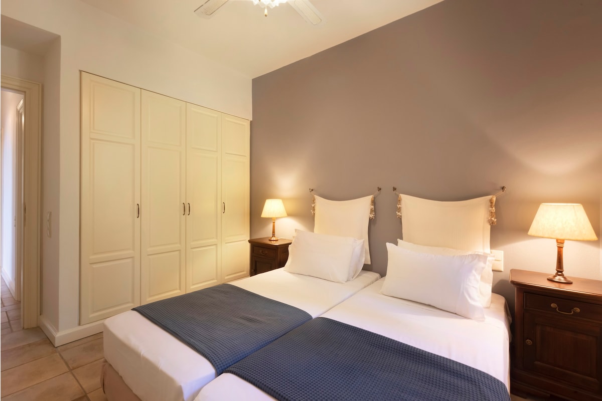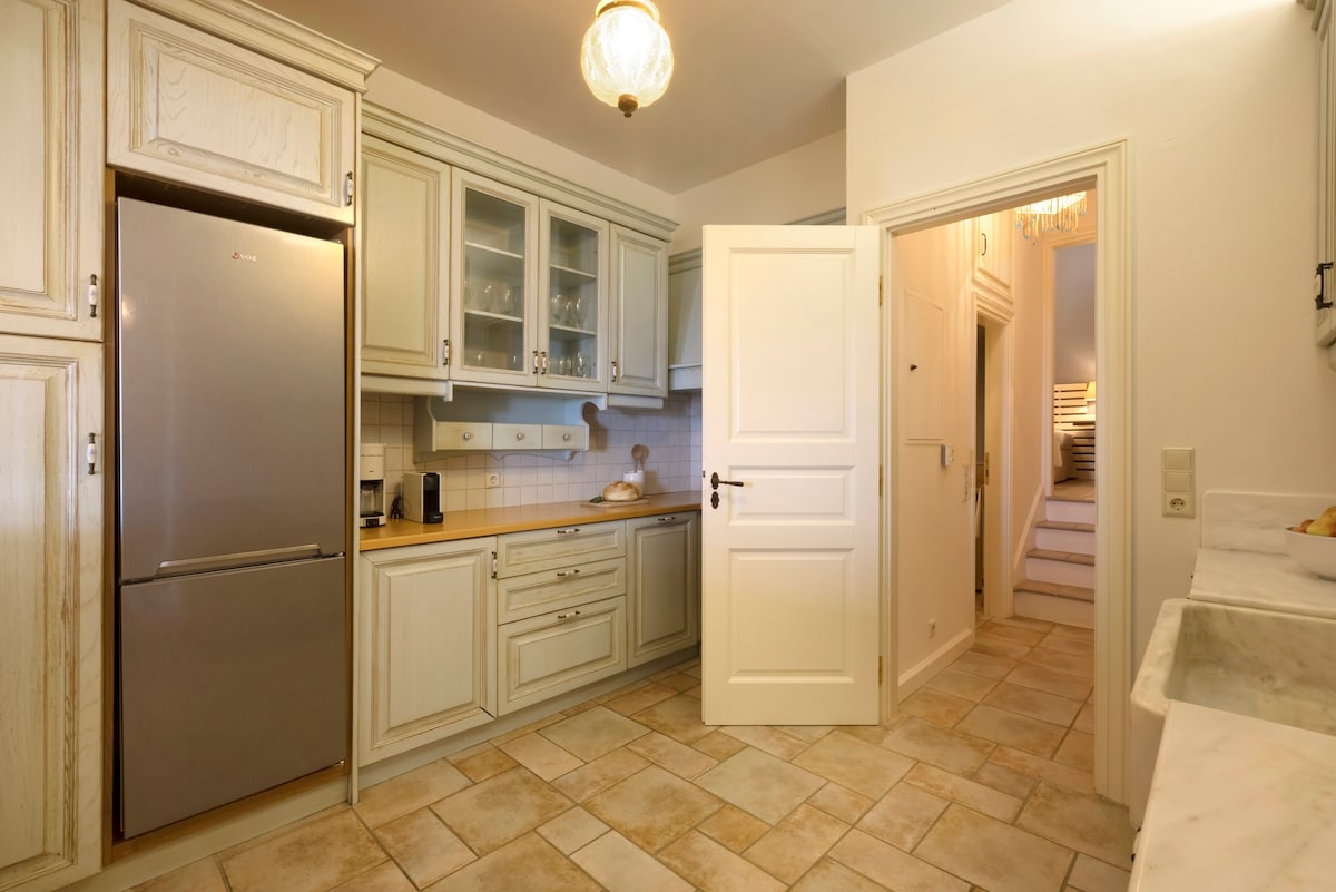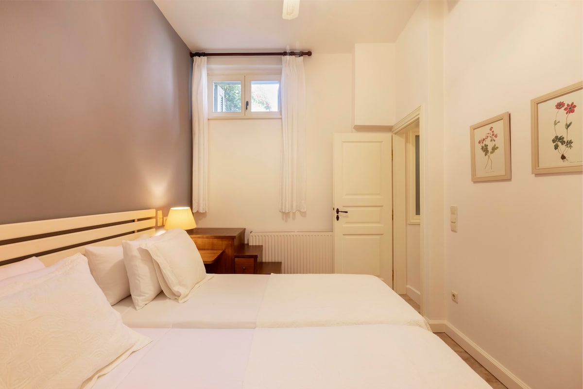 The house has a fully equipped retro style kitchen, a dining area that can seat a group of friends or family and a comfortable sitting area with an A/C. There are three spacious and elegant bedrooms one with a double bed and the other two with single beds, put together in order to accommodate either couples or friends. Two of the rooms have ceiling fans and one has an A/C.