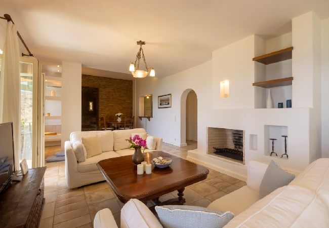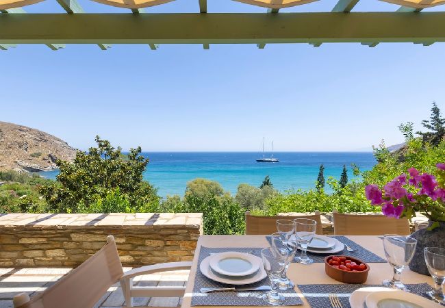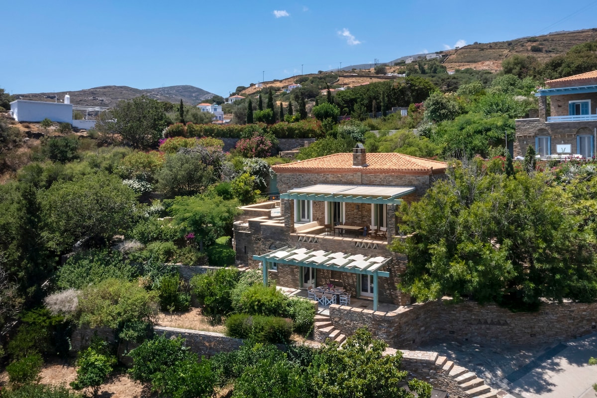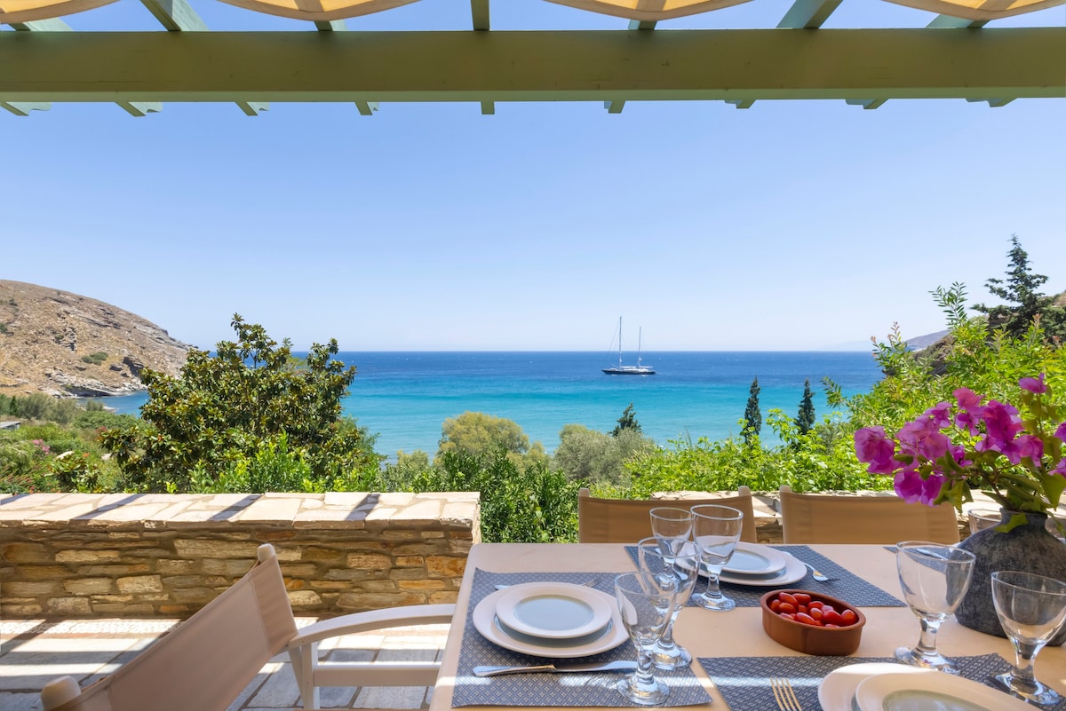 An exquisite villa set in idyllic location, surrounded by green slopes and the turquoise waters of the Aegean, just a few meters away from a sandy beach. This is a graceful, elegant and comfortable home, ideal for family or group vacations. Just a short drive from the island’s handsome main town, a short walk from a lovely village, yet still tranquil and private with gorgeous sea views, our villa is the perfect spot to relax, refresh and regenerate.