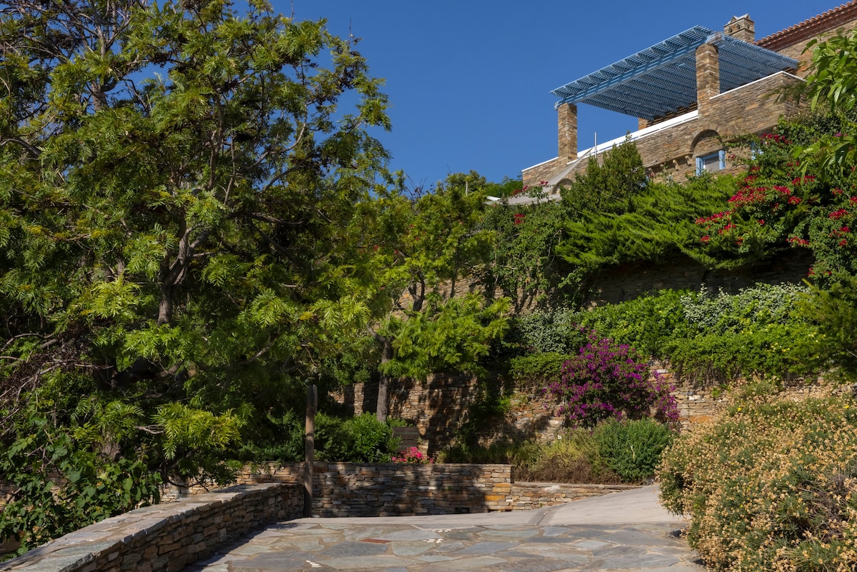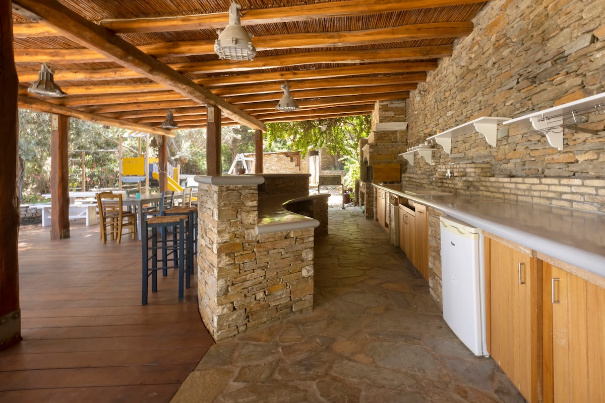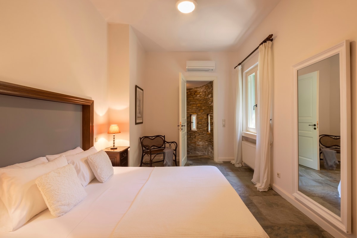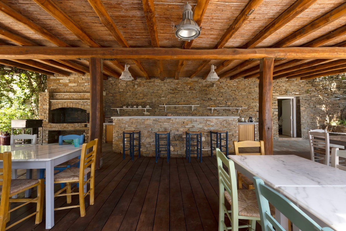 The residence, set in one level with a few steps leading to the bedrooms, has been built in keeping with the local architecture, using local stone and featuring wooden elements and whitewashes walls. From its garden, verandas and outdoor spaces you will savor the Aegean sea, take in the island’s atmosphere and relax in elegance and comfort.