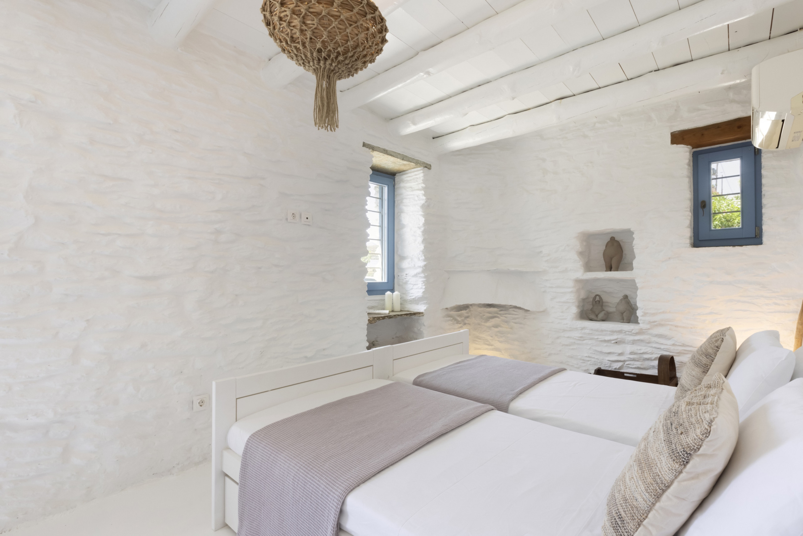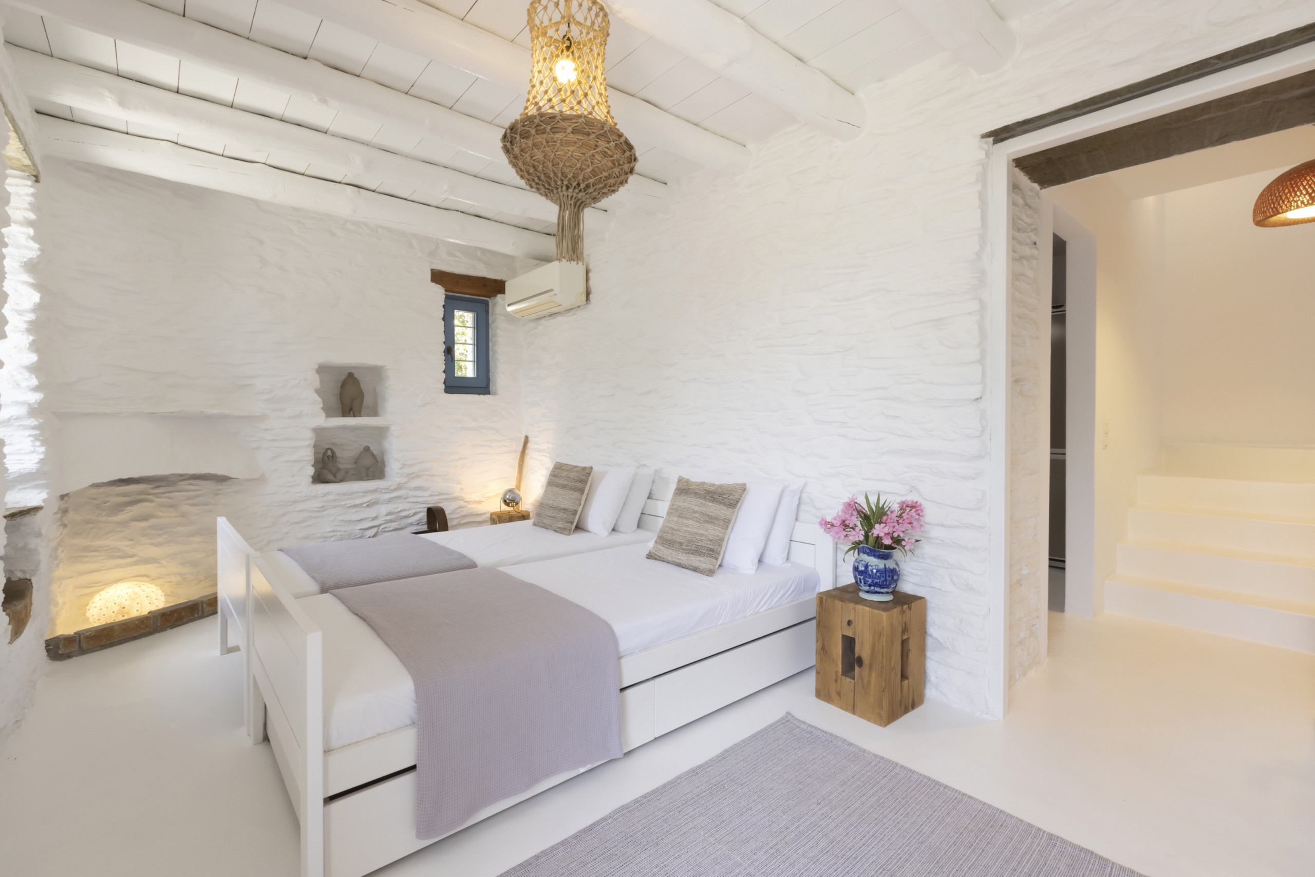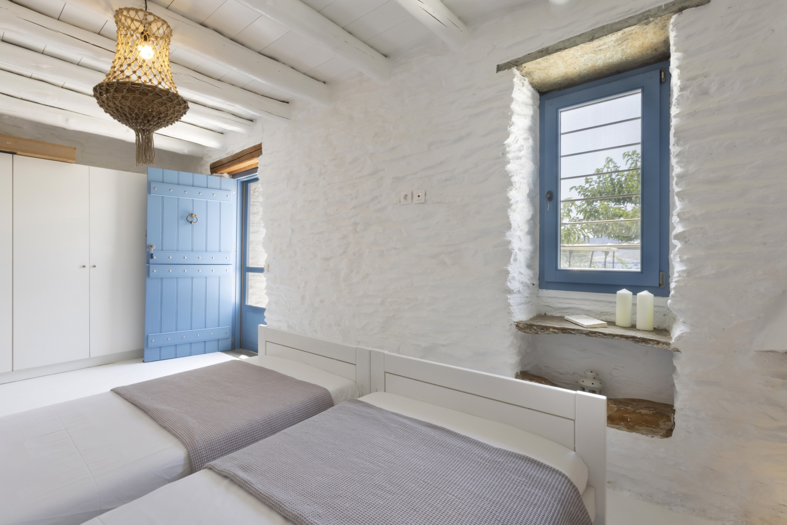 The residence, set in one level with a few steps leading to the bedrooms, has been built in keeping with the local architecture, using local stone and featuring wooden elements and whitewashes walls. From its garden, verandas and outdoor spaces you will savor the Aegean sea, take in the island’s atmosphere and relax in elegance and comfort.