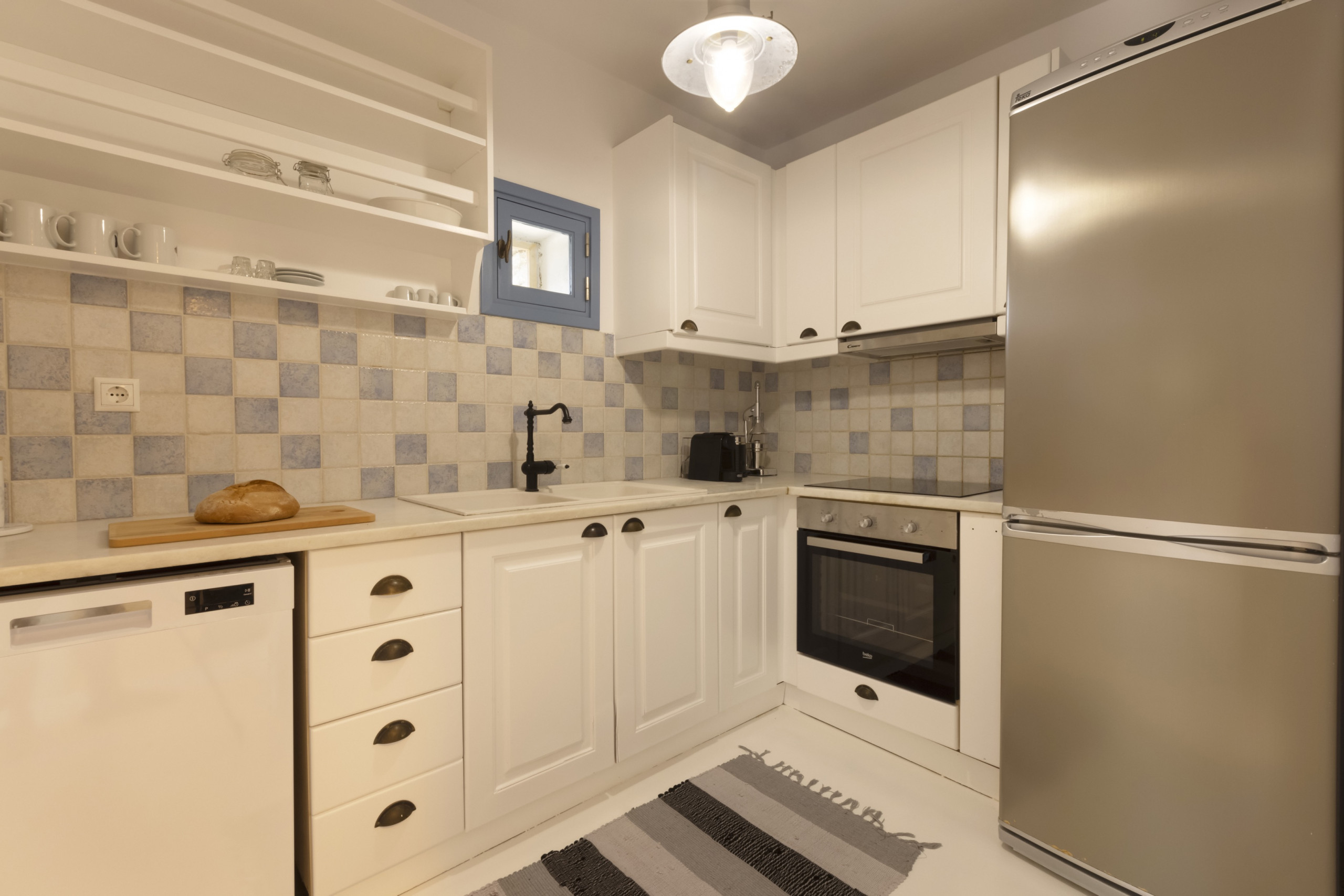 The house has a fully equipped retro style kitchen, a dining area that can seat a group of friends or family and a comfortable sitting area with an A/C. There are three spacious and elegant bedrooms one with a double bed and the other two with single beds, put together in order to accommodate either couples or friends. Two of the rooms have ceiling fans and one has an A/C.