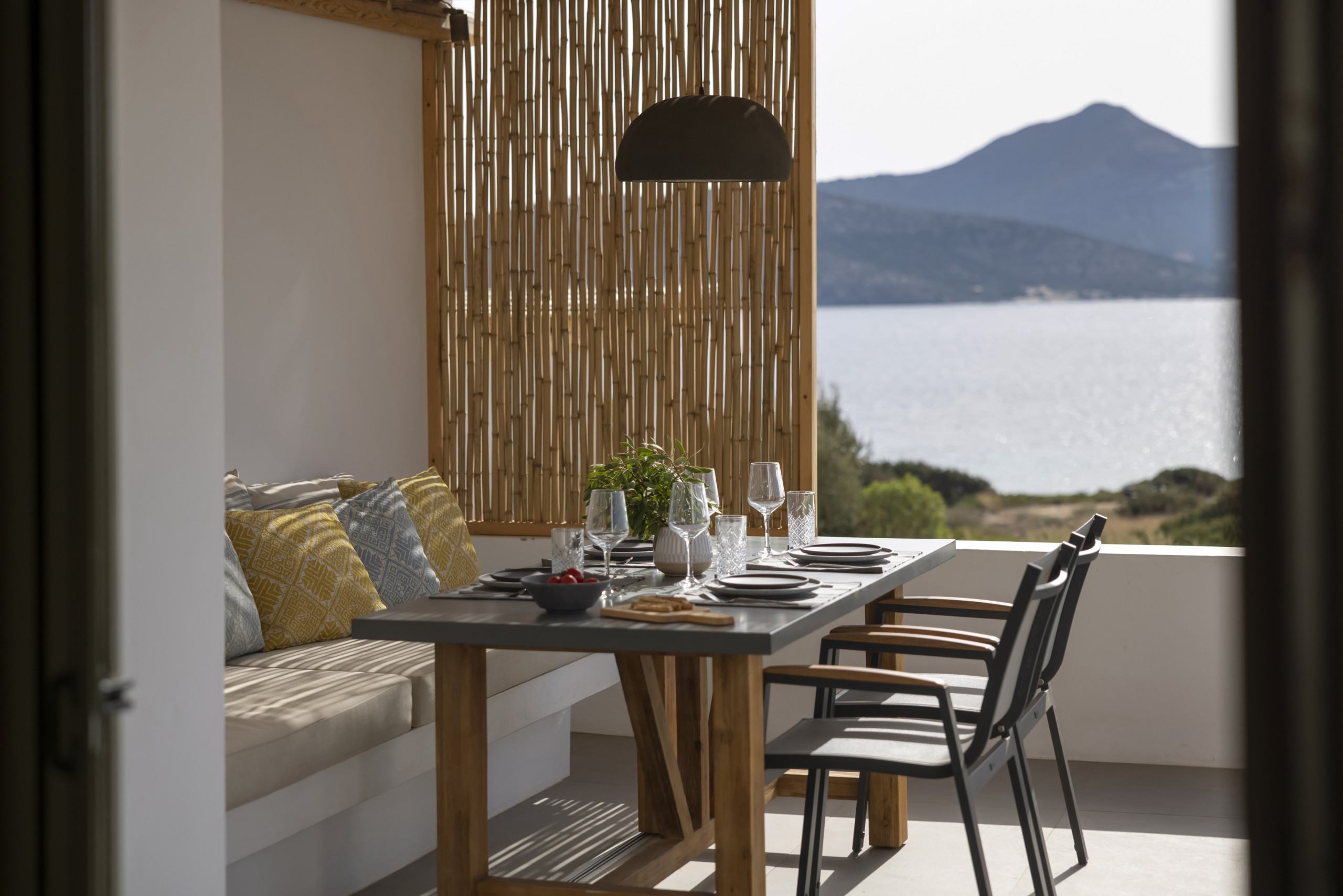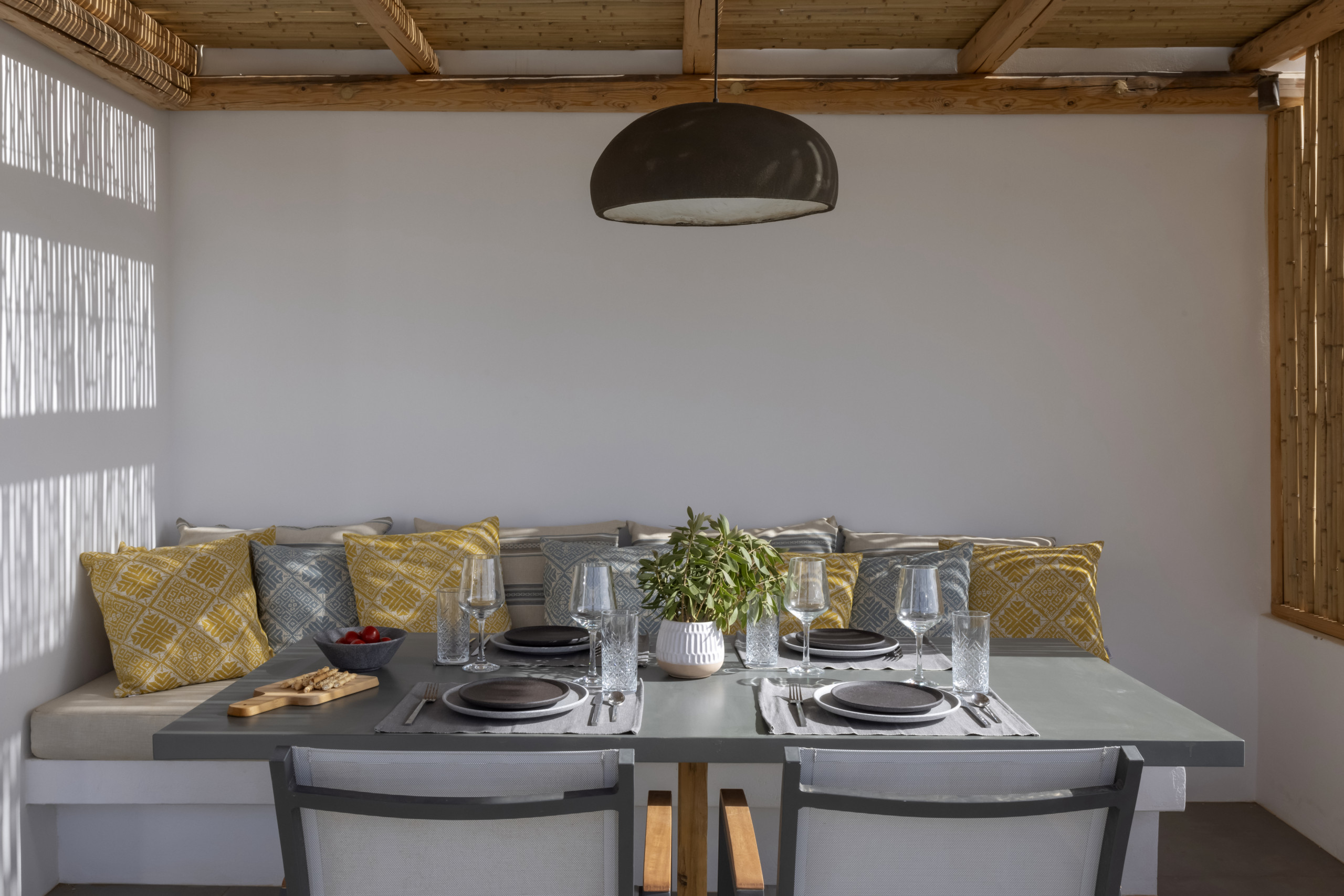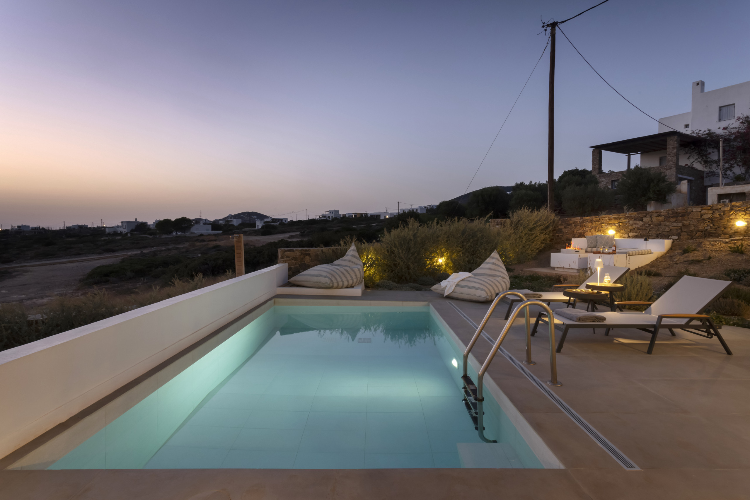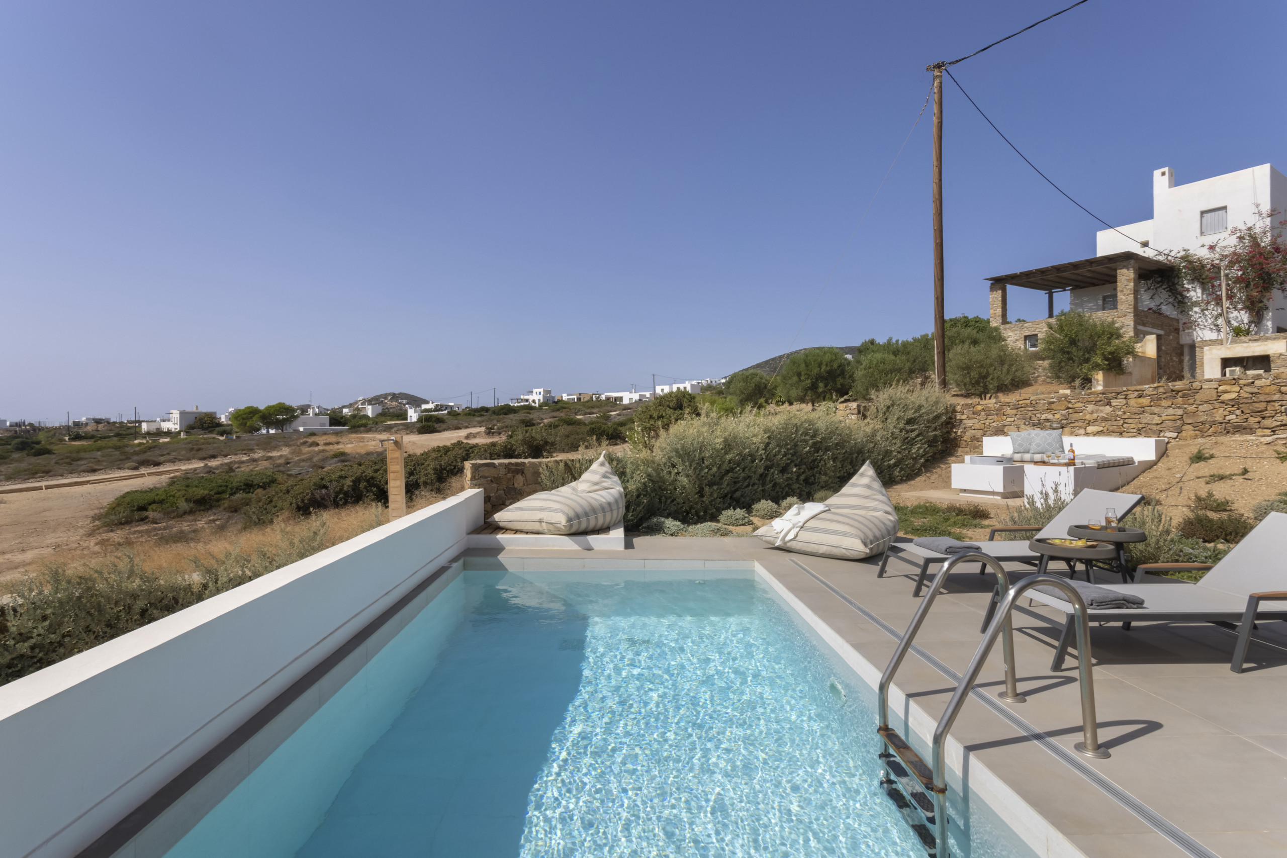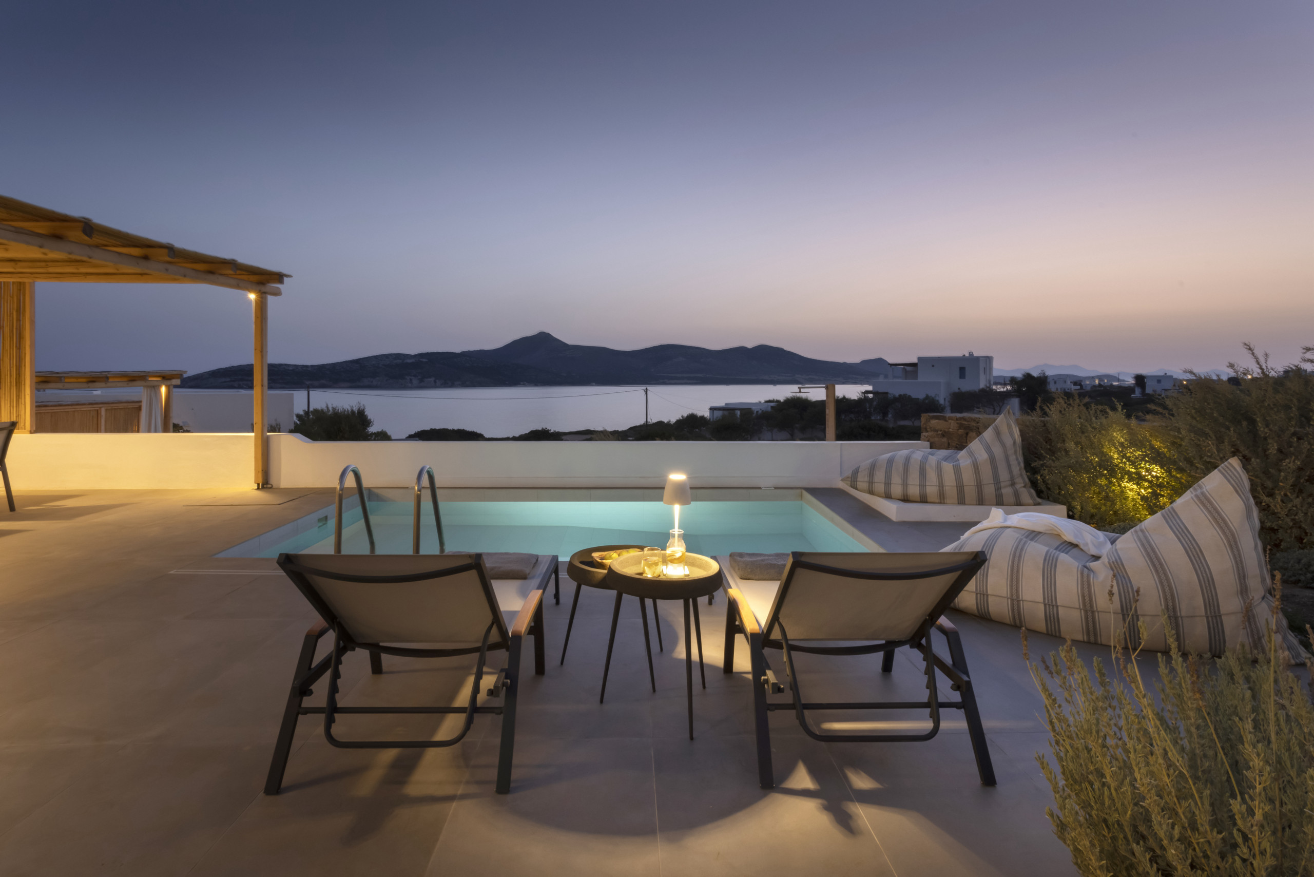 Sweet earthy tones, unpretentious elegance and modern bohemian aesthetics are harmoniously combined in the spaces of Avra residence. The refined decoration is complemented by the use of natural materials in furniture and lighting, such as wood and mat, as well as characteristic samples of Cycladic art, highlighted by the aesthetic lighting, which is evident in most rooms. In Avra you can enjoy plenty of spaces to rest, sleep and dine, relax in the hammock of the small private garden overlooking the ancient findings at Despotiko or take a dip in the pool while enjoying the fragrances of the local aromatic plants that dominate the area.