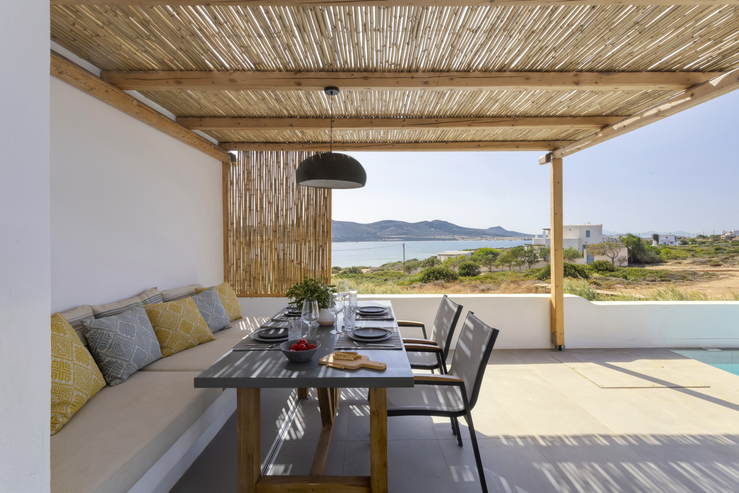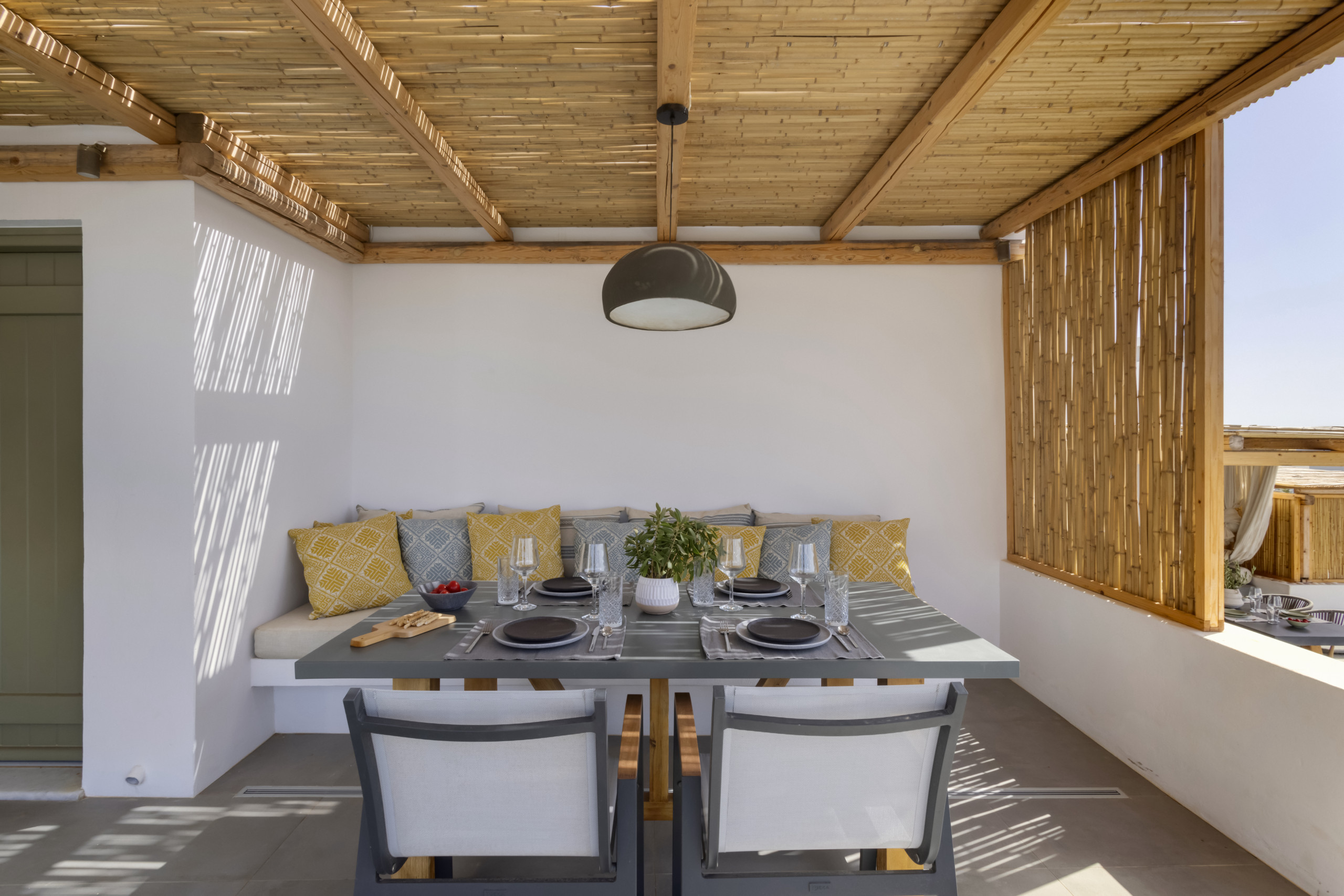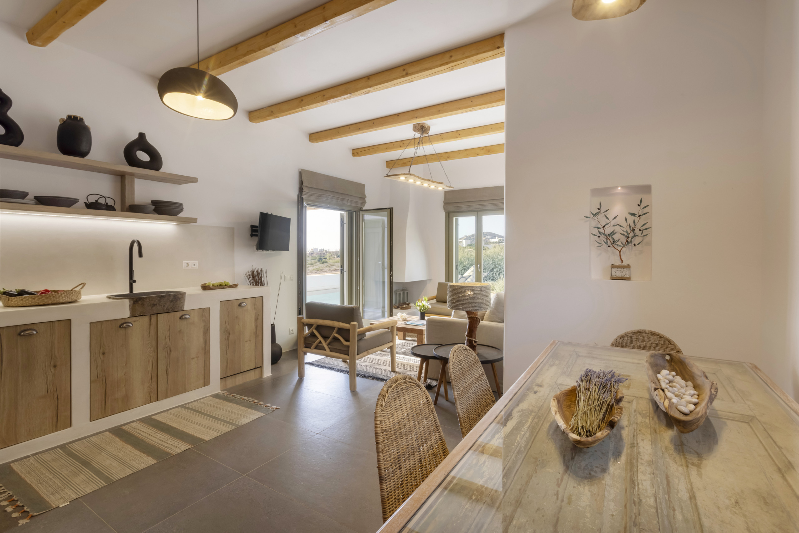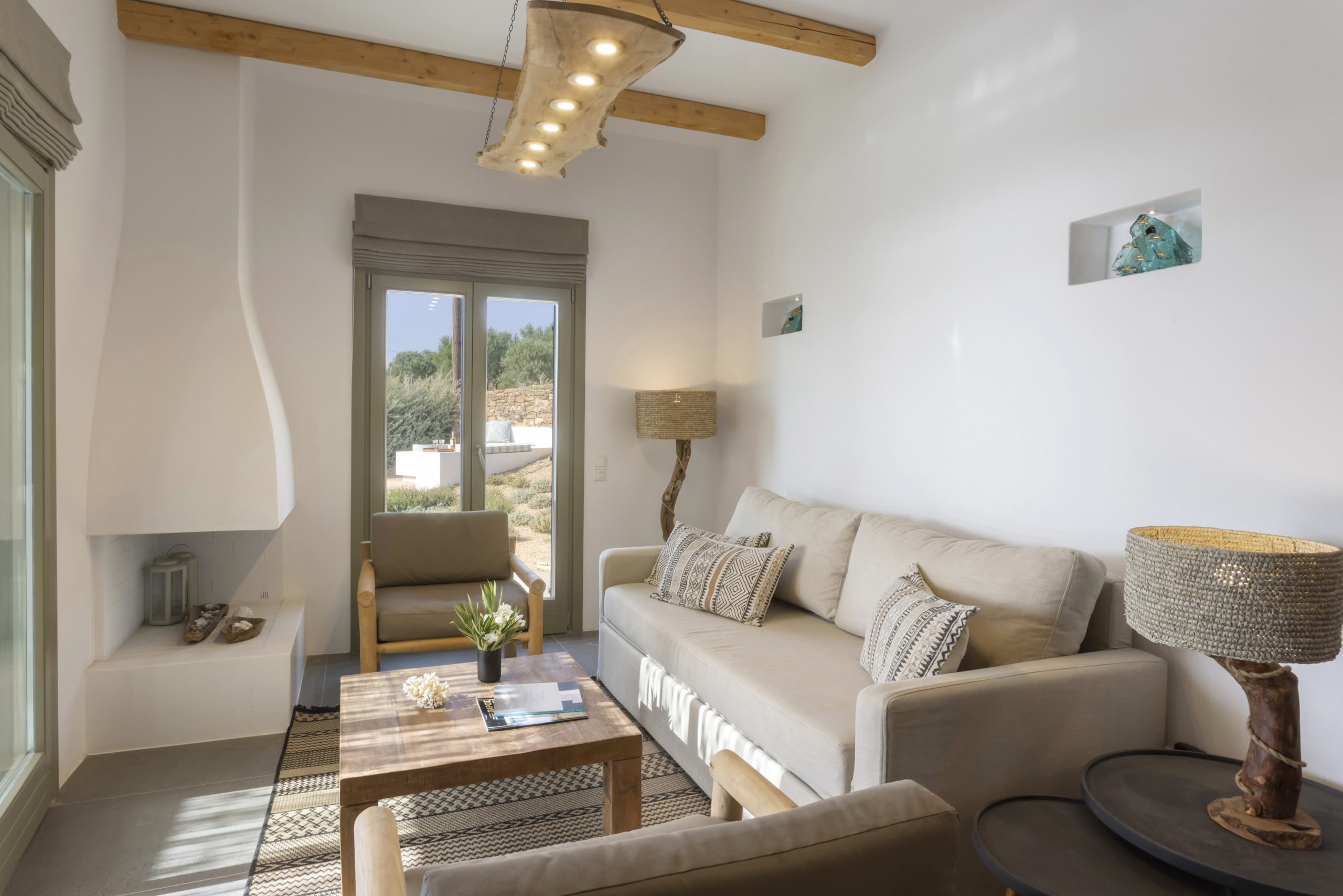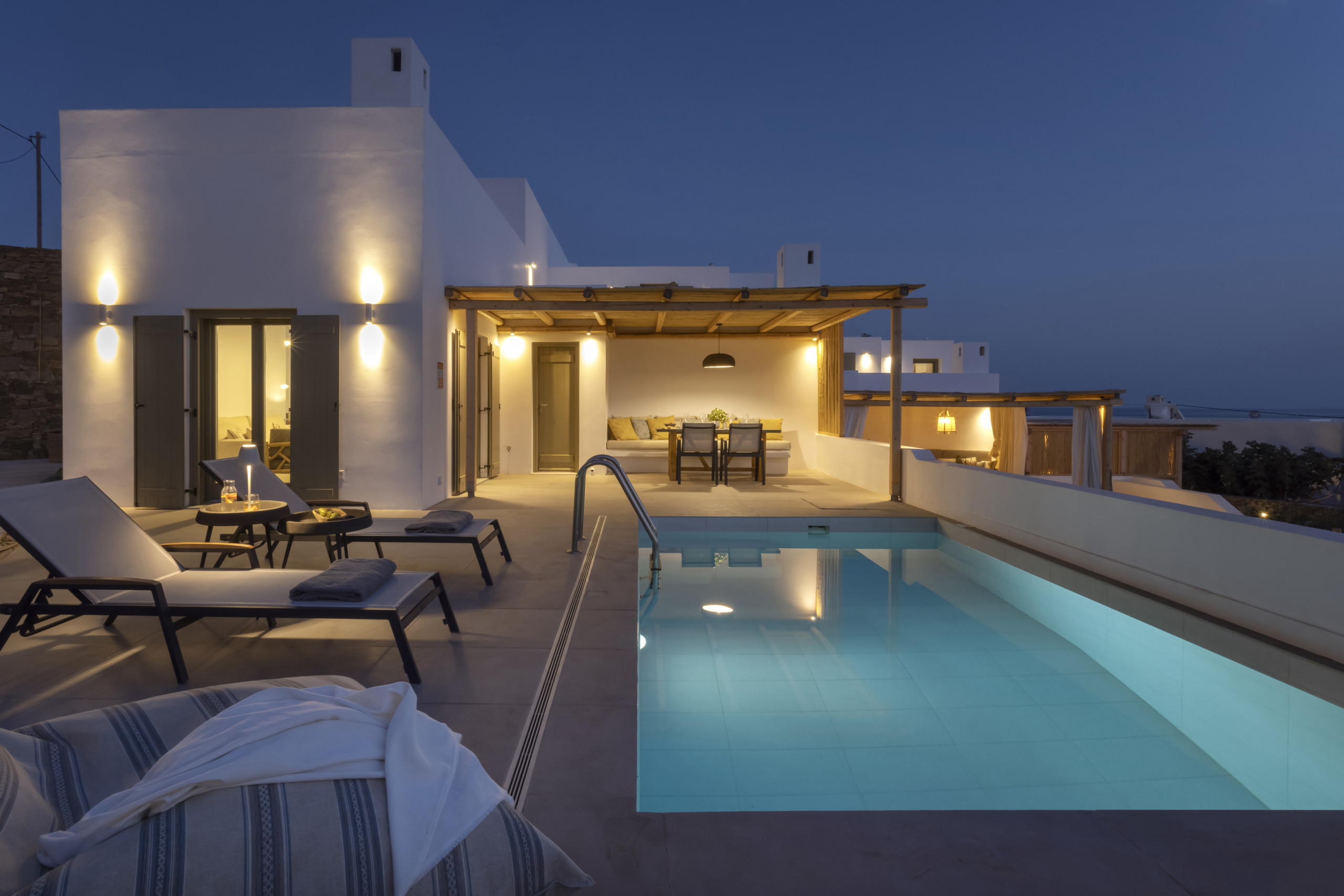Sweet earthy tones, unpretentious elegance and modern bohemian aesthetics are harmoniously combined in the spaces of Avra residence. The refined decoration is complemented by the use of natural materials in furniture and lighting, such as wood and mat, as well as characteristic samples of Cycladic art, highlighted by the aesthetic lighting, which is evident in most rooms. In Avra you can enjoy plenty of spaces to rest, sleep and dine, relax in the hammock of the small private garden overlooking the ancient findings at Despotiko or take a dip in the pool while enjoying the fragrances of the local aromatic plants that dominate the area.