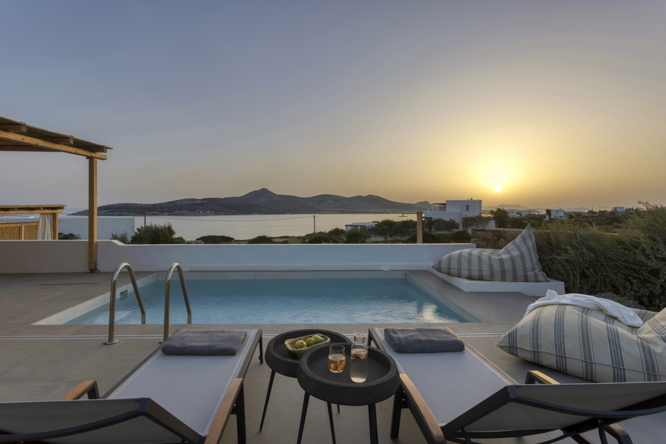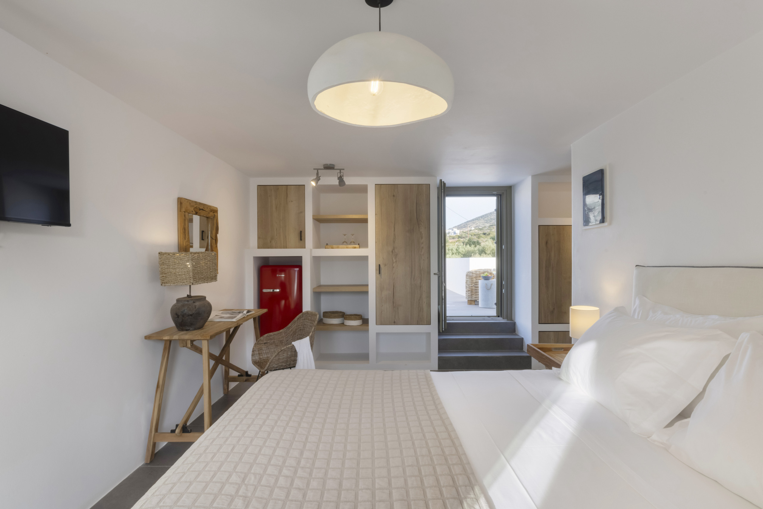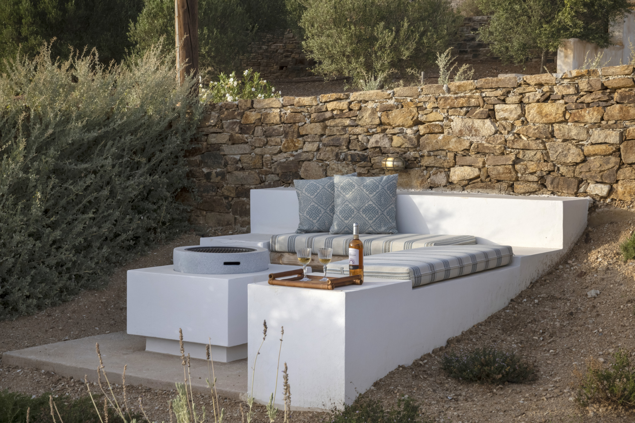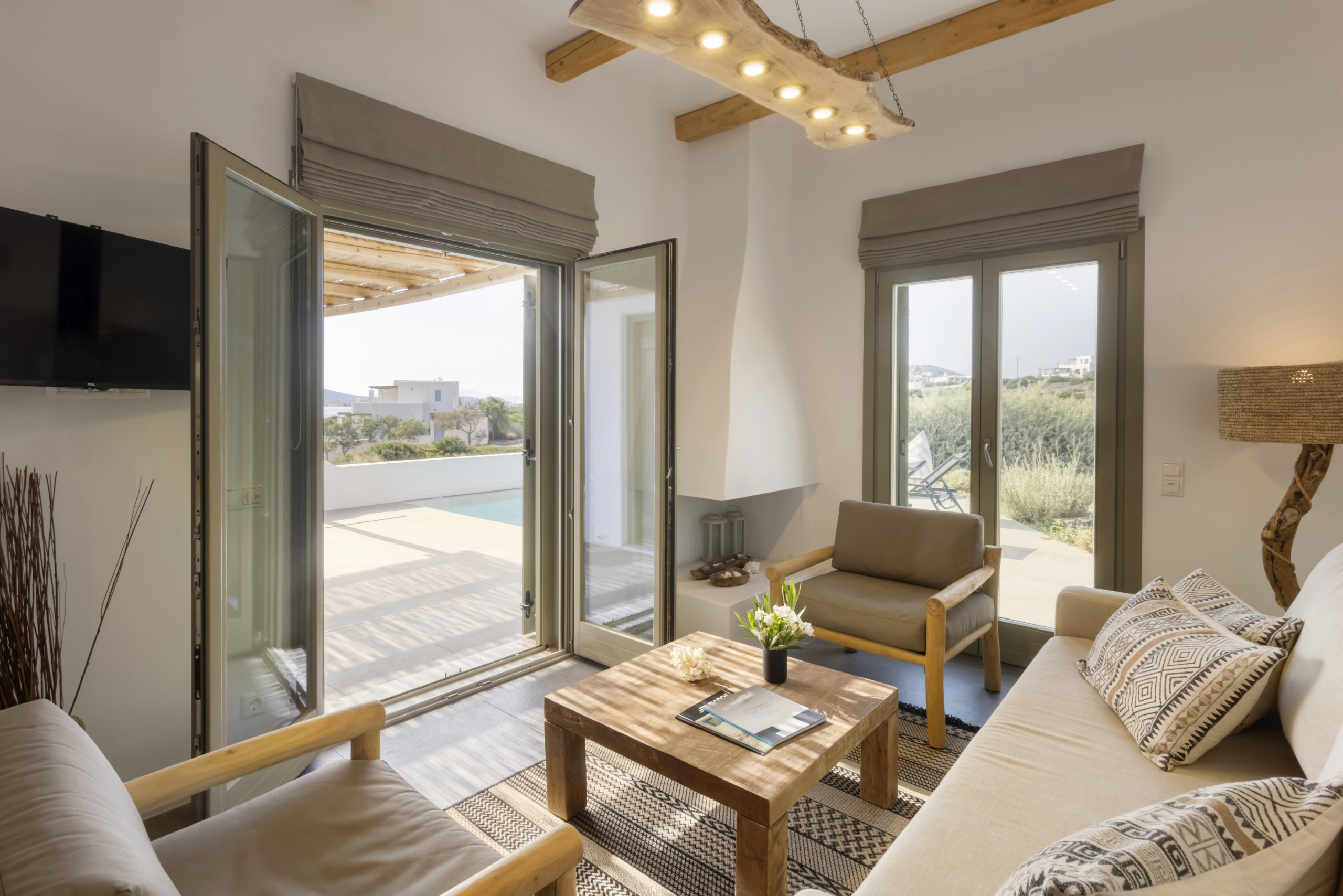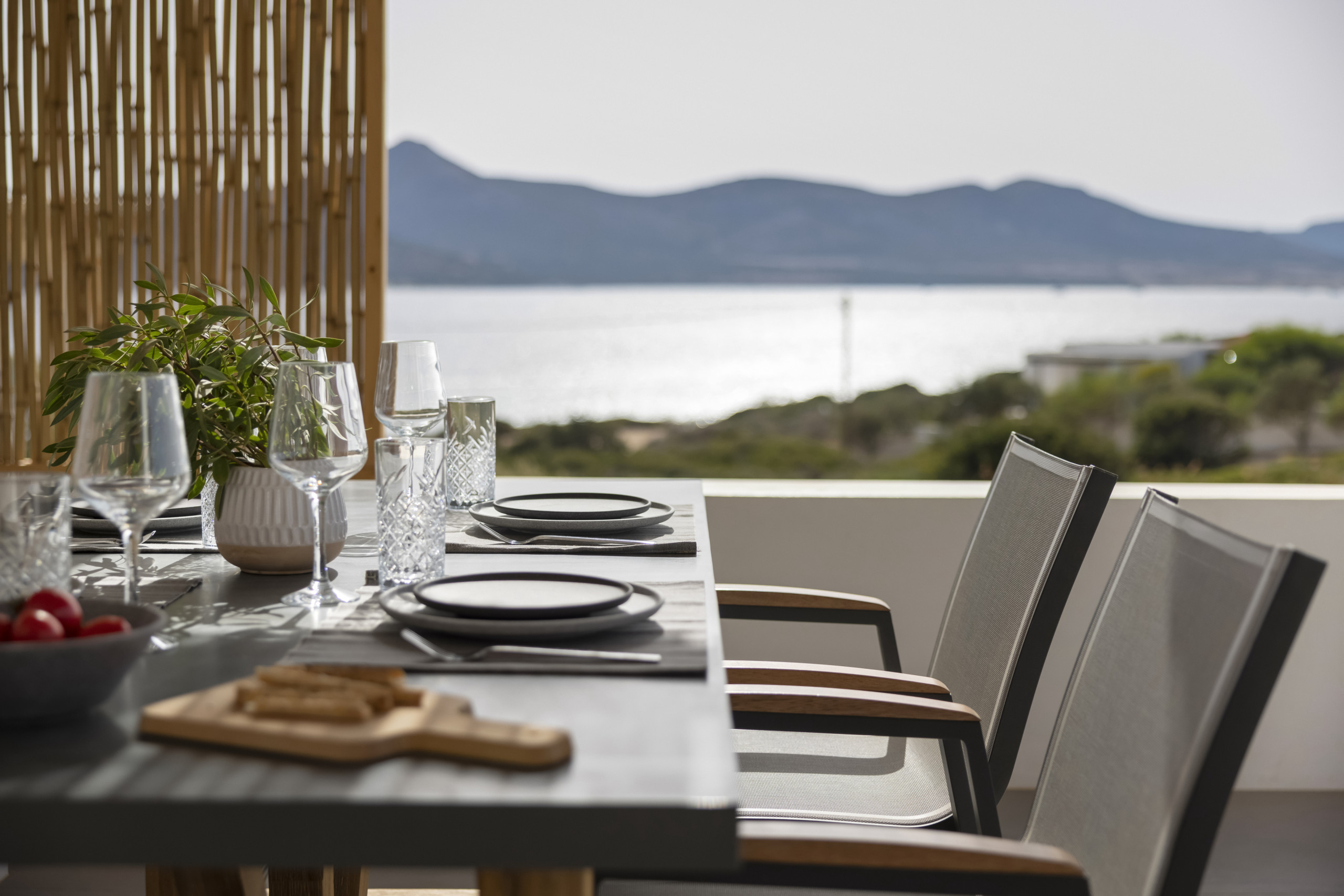 Sweet earthy tones, unpretentious elegance and modern bohemian aesthetics are harmoniously combined in the spaces of Avra residence. The refined decoration is complemented by the use of natural materials in furniture and lighting, such as wood and mat, as well as characteristic samples of Cycladic art, highlighted by the aesthetic lighting, which is evident in most rooms. In Avra you can enjoy plenty of spaces to rest, sleep and dine, relax in the hammock of the small private garden overlooking the ancient findings at Despotiko or take a dip in the pool while enjoying the fragrances of the local aromatic plants that dominate the area.