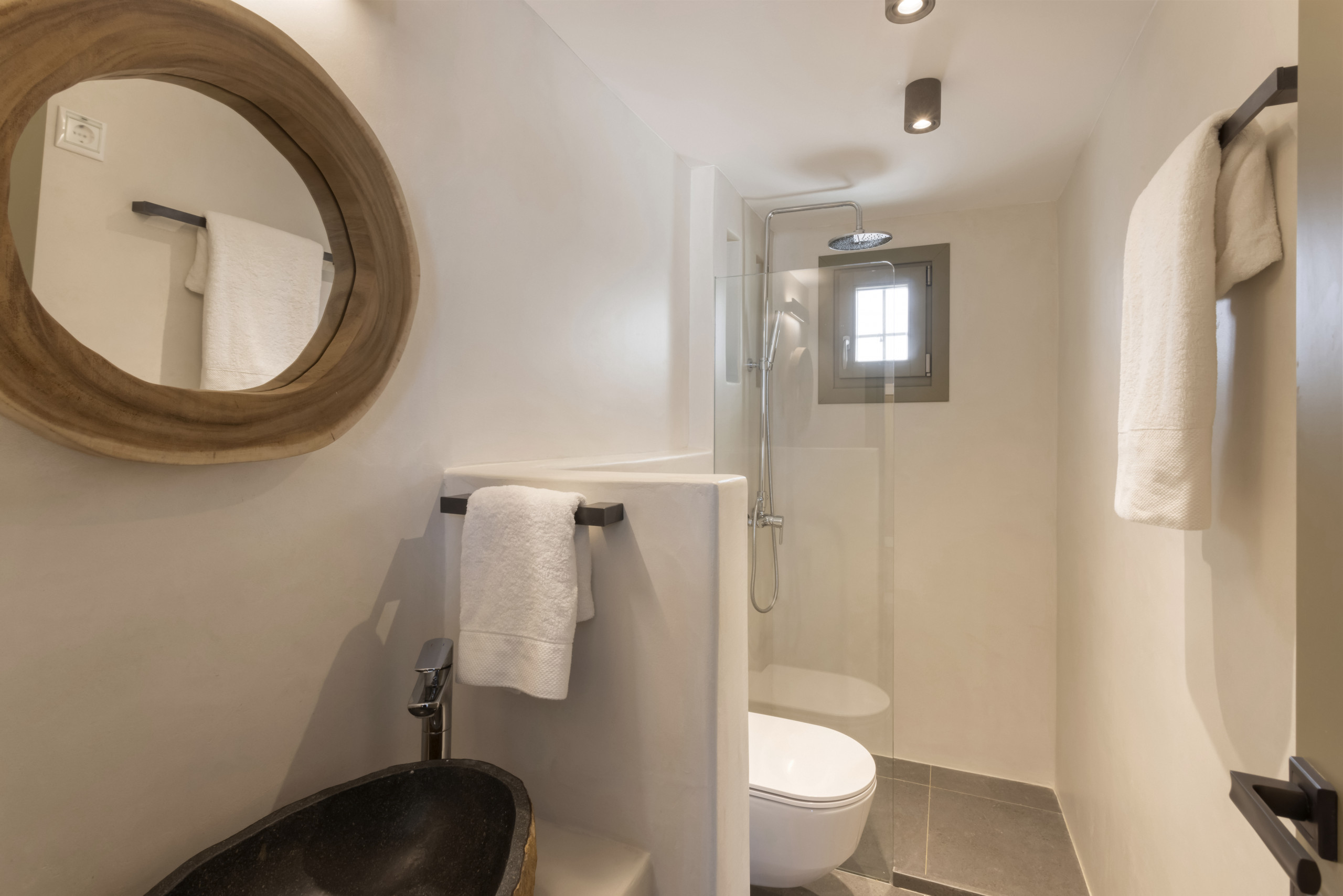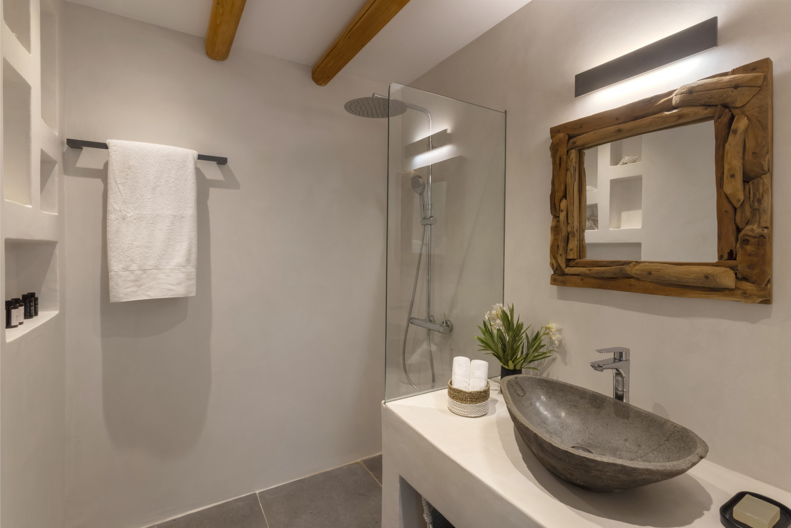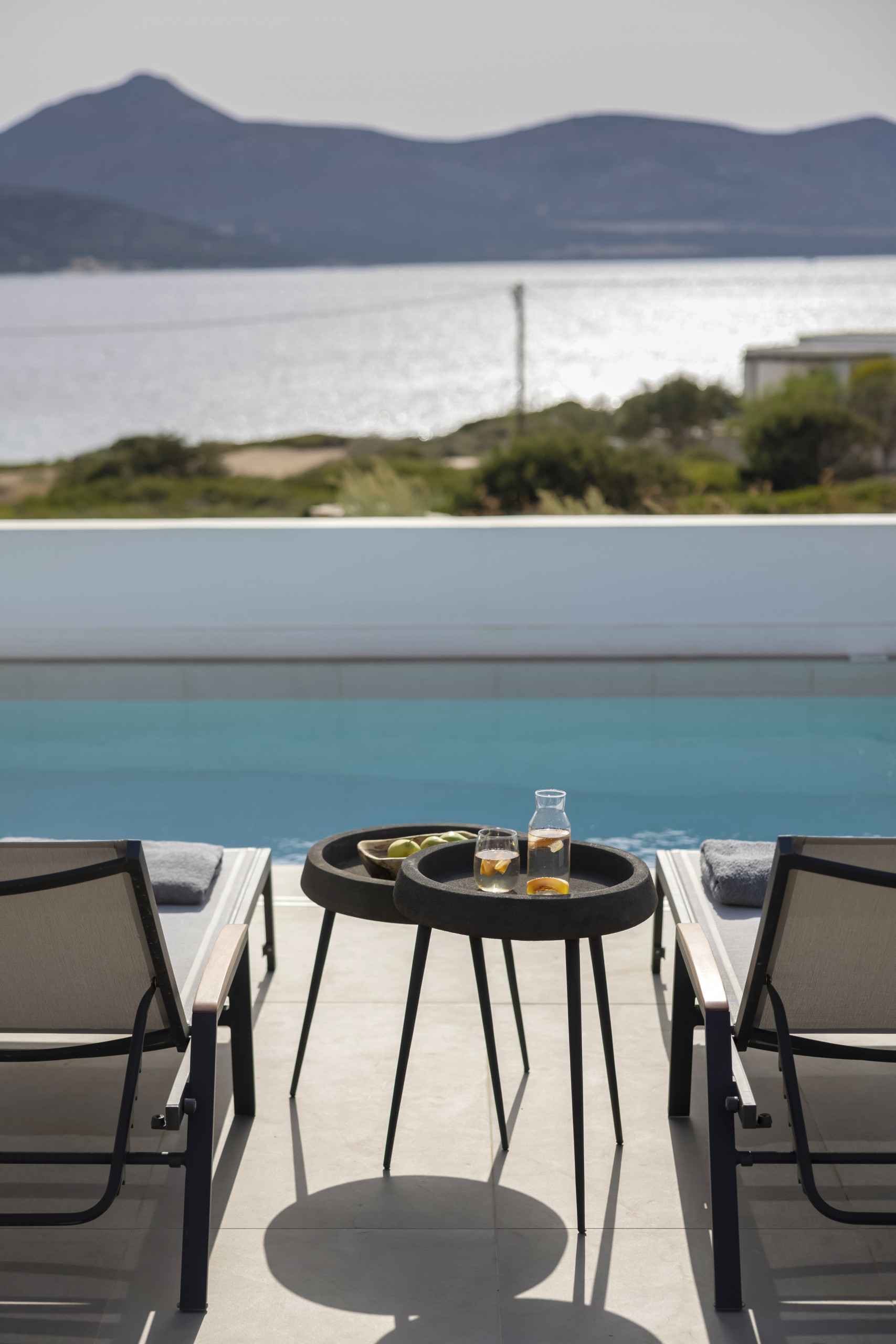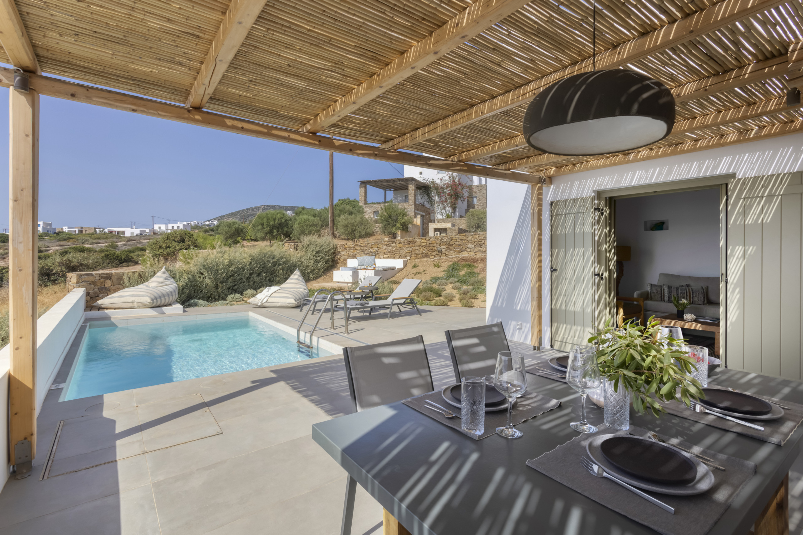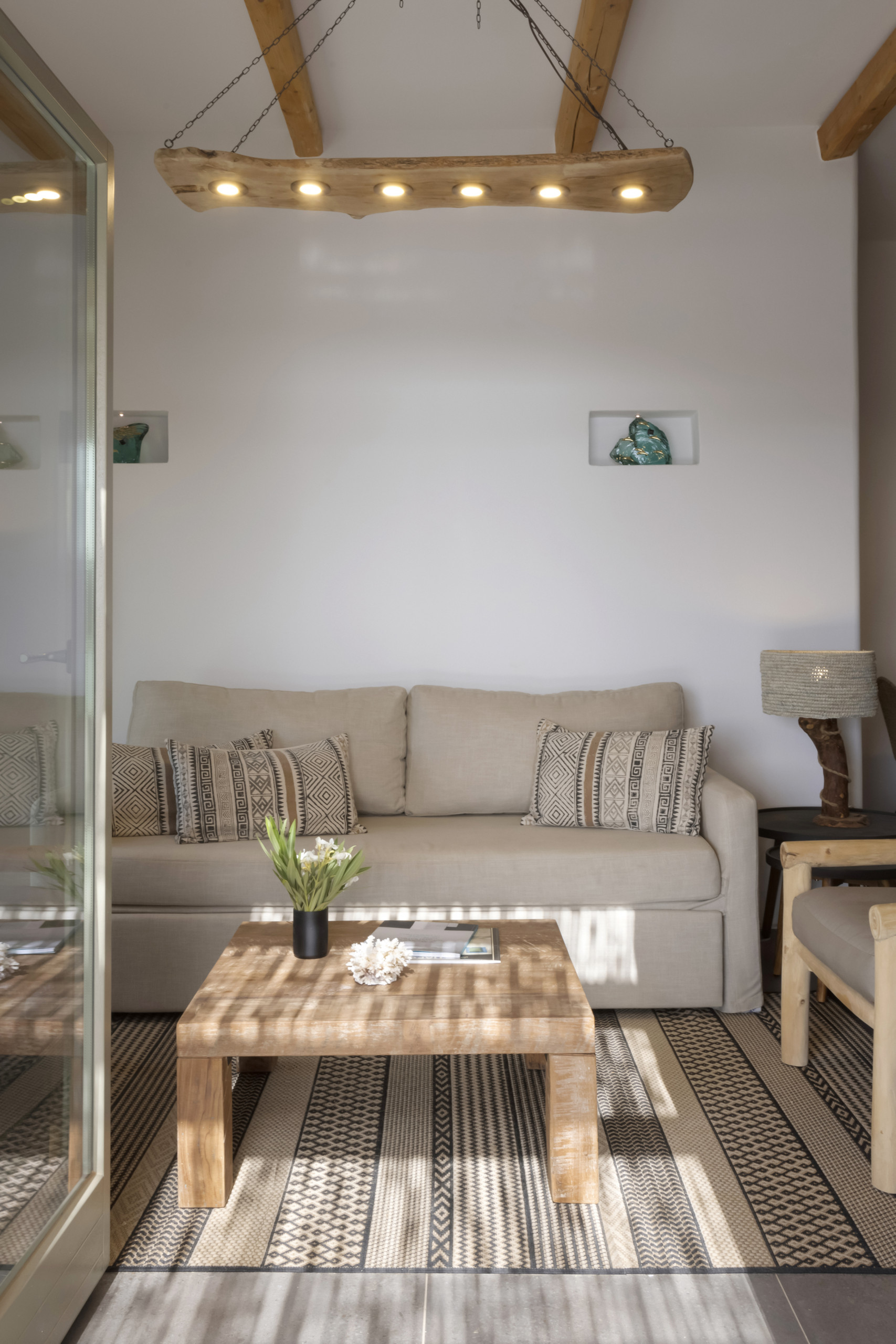 Sweet earthy tones, unpretentious elegance and modern bohemian aesthetics are harmoniously combined in the spaces of Avra residence. The refined decoration is complemented by the use of natural materials in furniture and lighting, such as wood and mat, as well as characteristic samples of Cycladic art, highlighted by the aesthetic lighting, which is evident in most rooms. In Avra you can enjoy plenty of spaces to rest, sleep and dine, relax in the hammock of the small private garden overlooking the ancient findings at Despotiko or take a dip in the pool while enjoying the fragrances of the local aromatic plants that dominate the area.