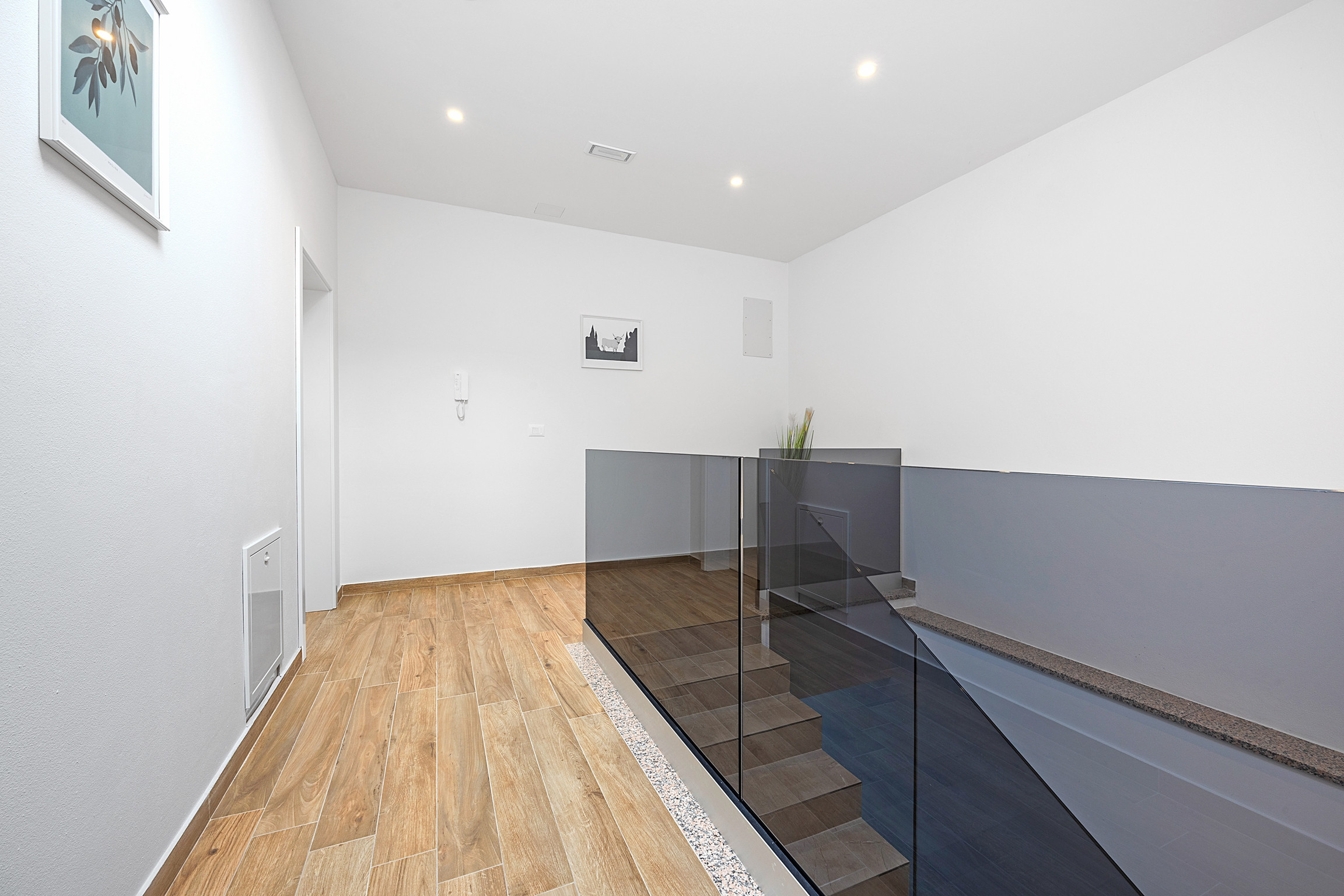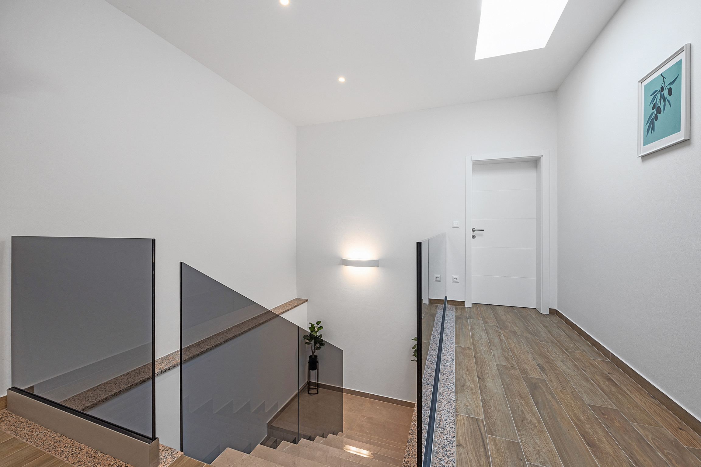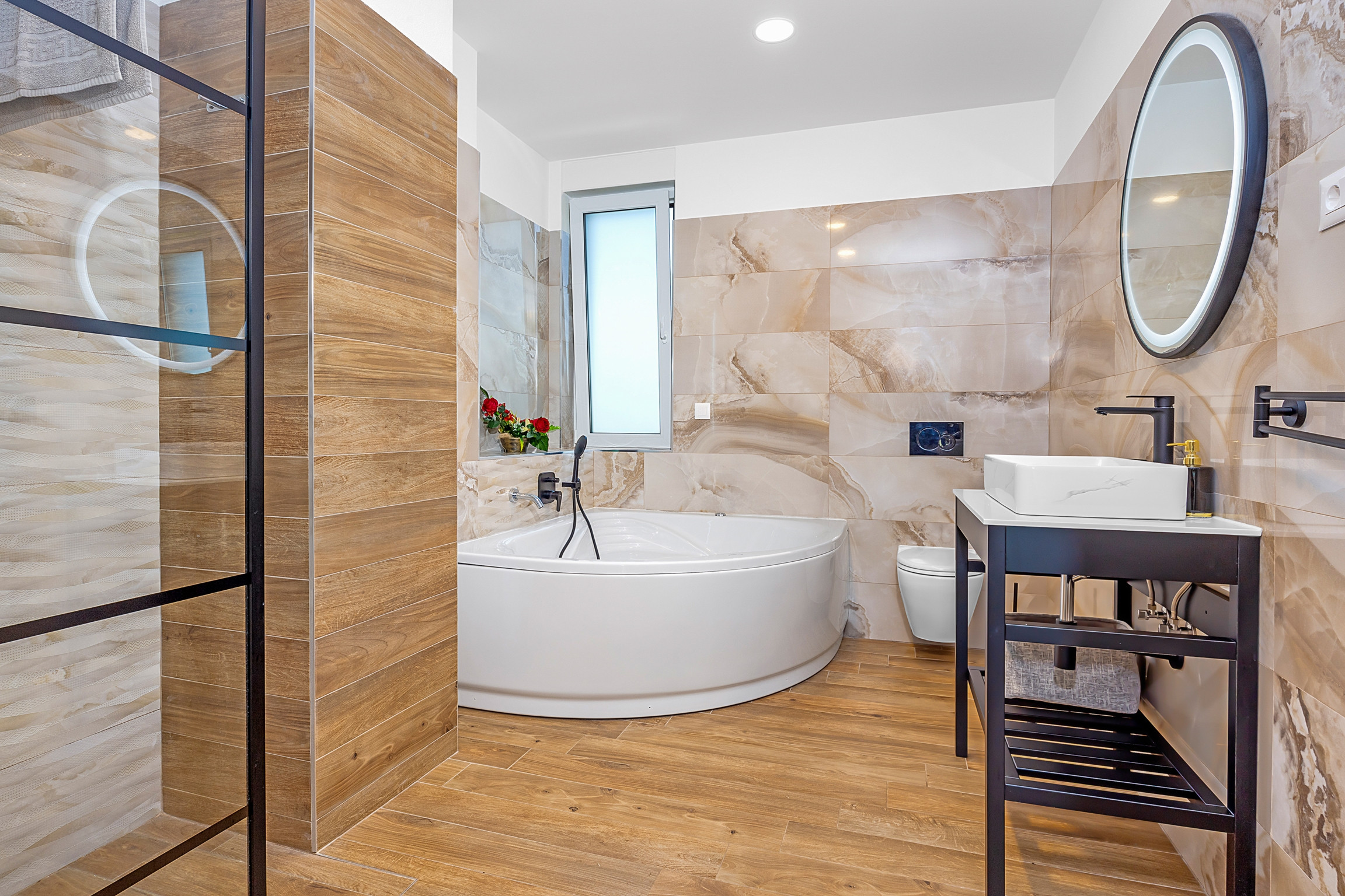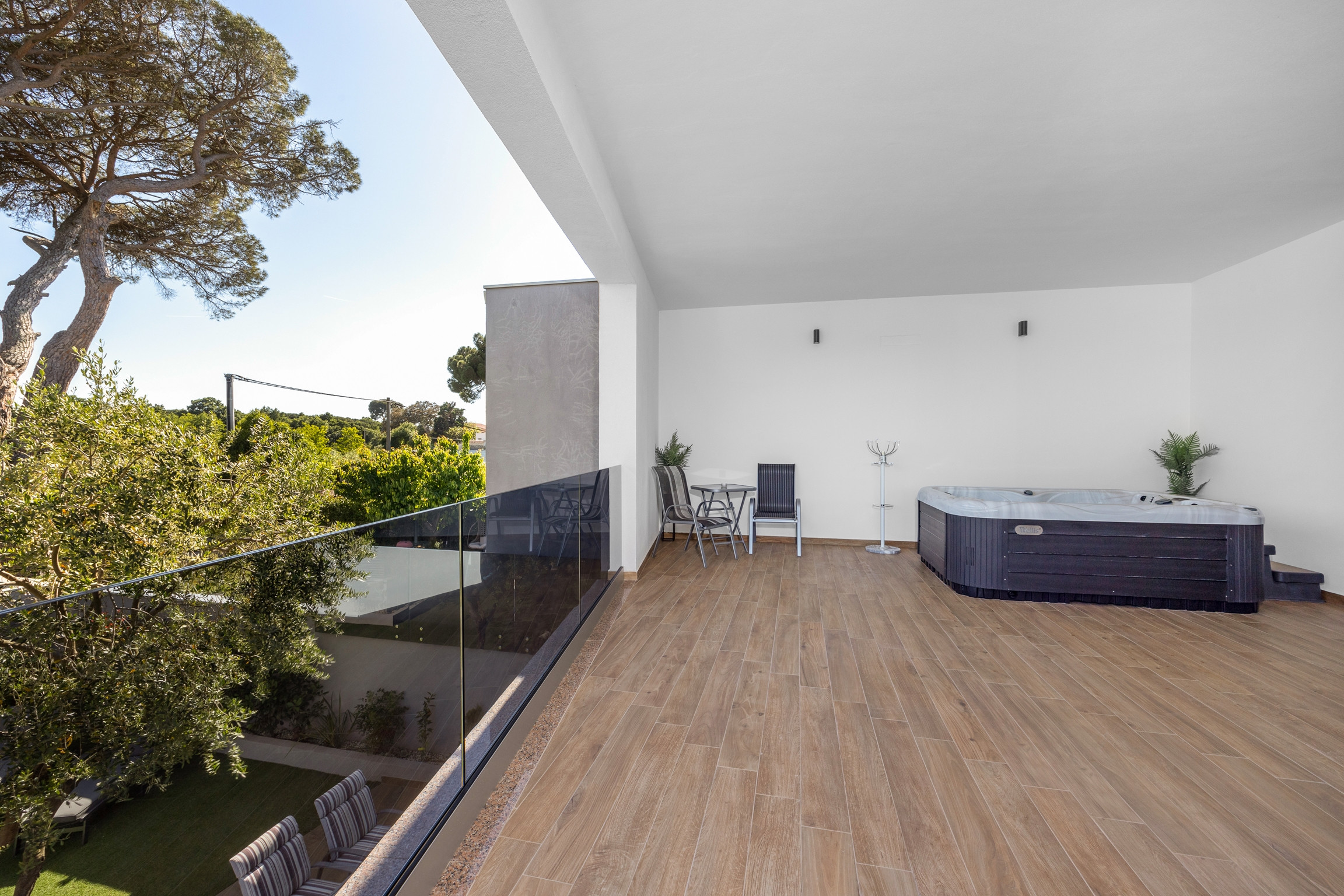 Jacuzzi and sunbeds are located on the balcony on the upper floor of the house. You can access the balcony from the hallway, but also from one bedroom with its own jacuzzi tub in the bathroom. Another bedroom is located upstairs, with its own bathroom and TV.
