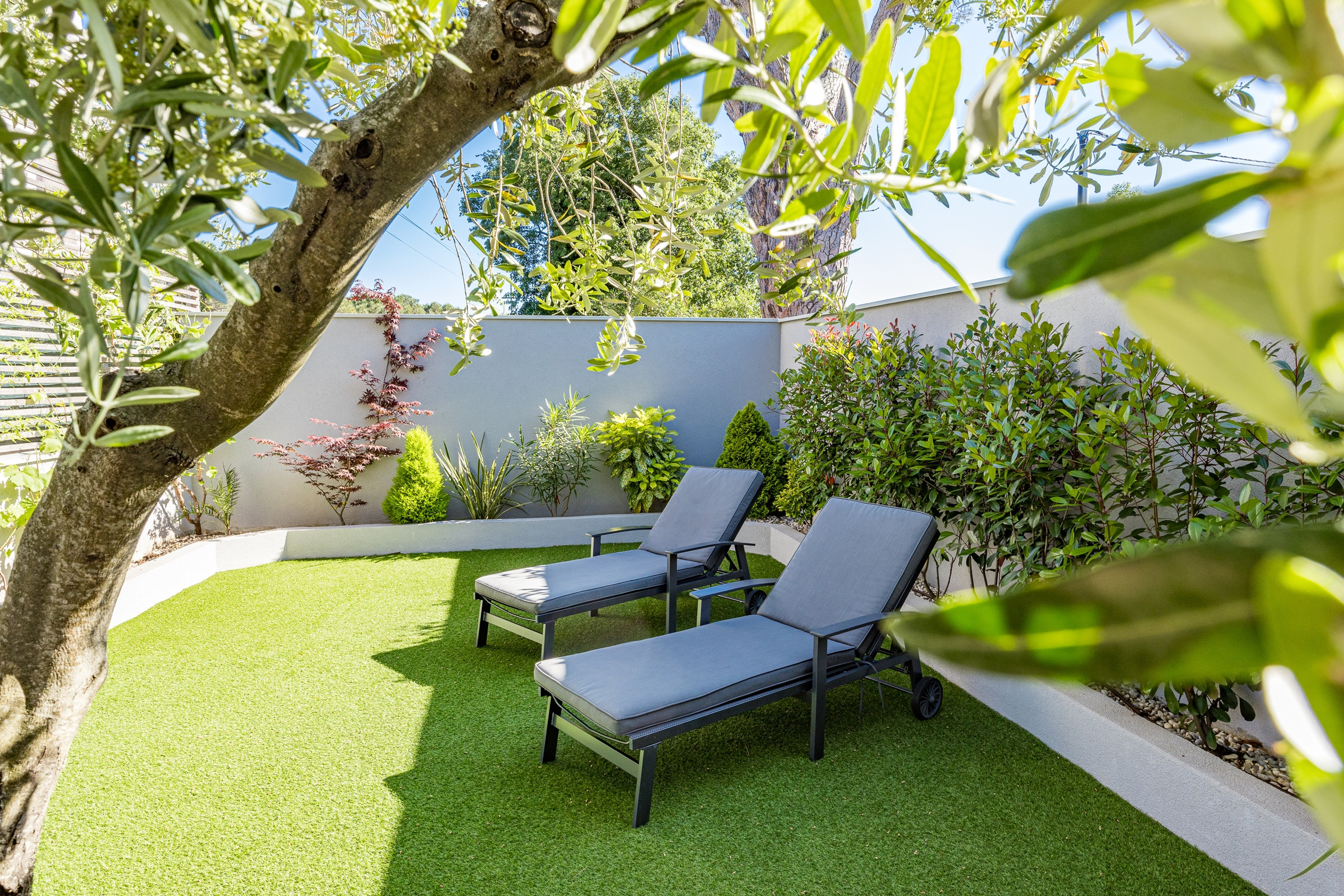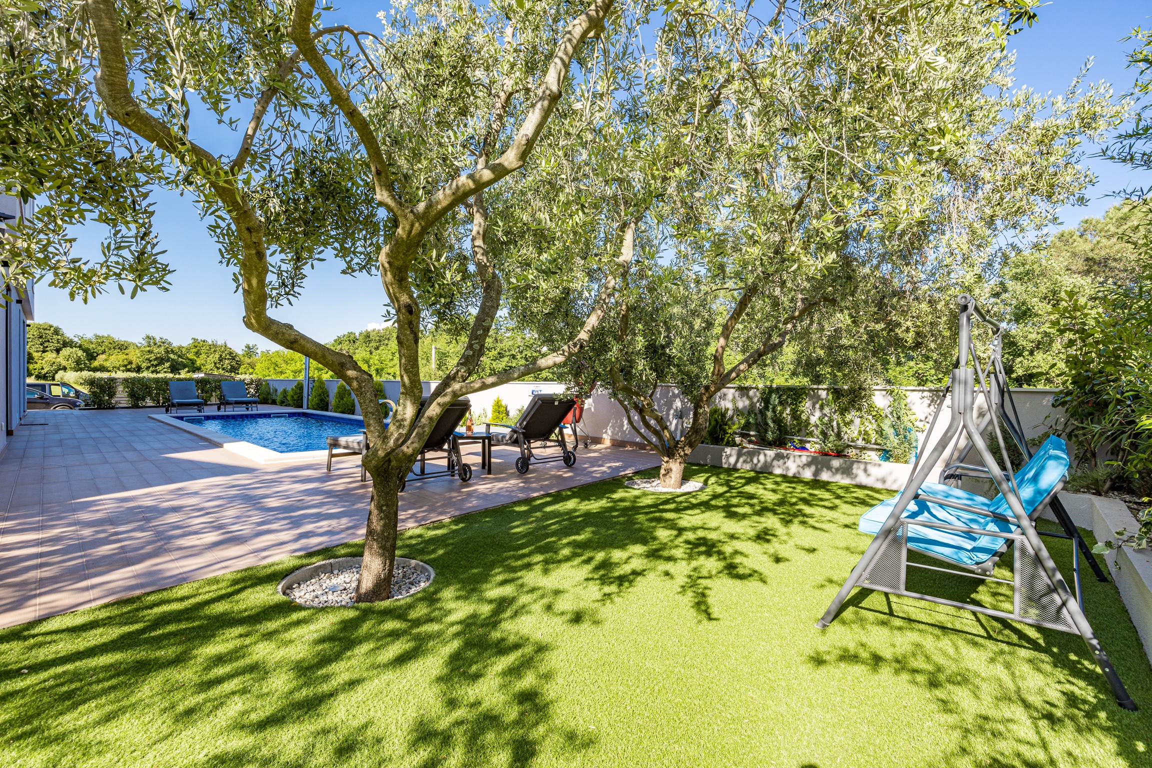 The beautifully landscaped surroundings of this villa invite you to enjoy in the pool or sunbeds in the natural shade of the trees.