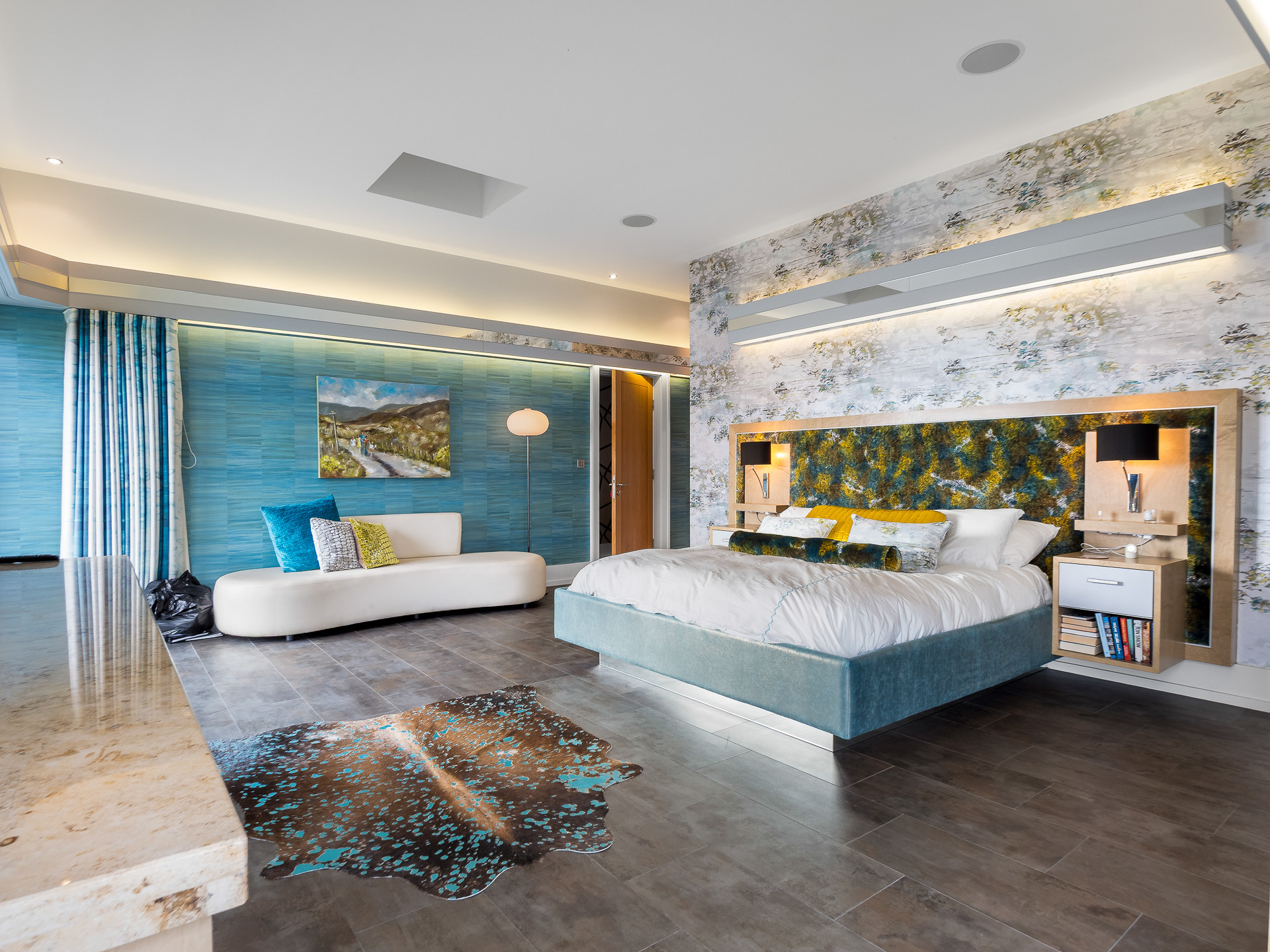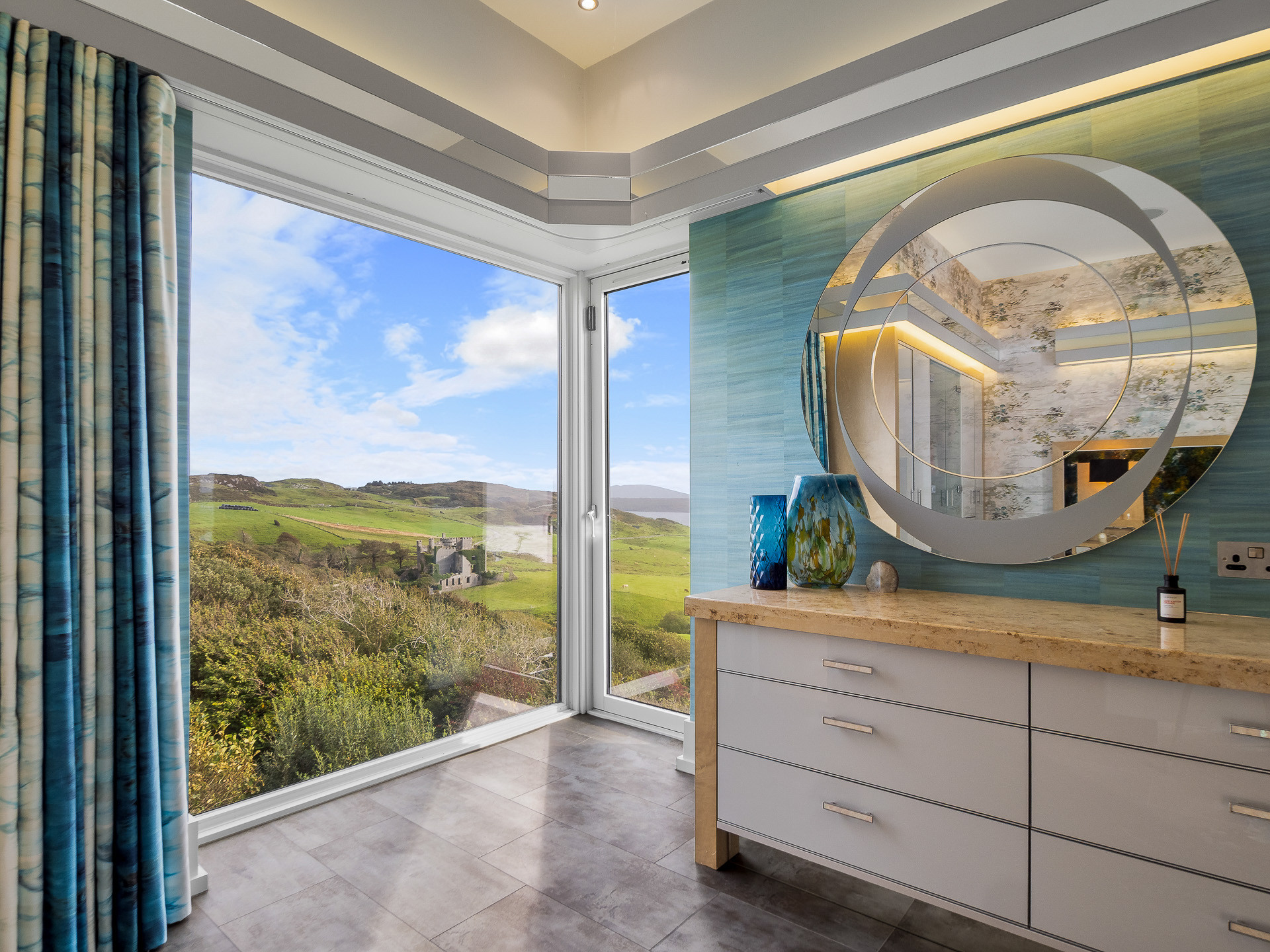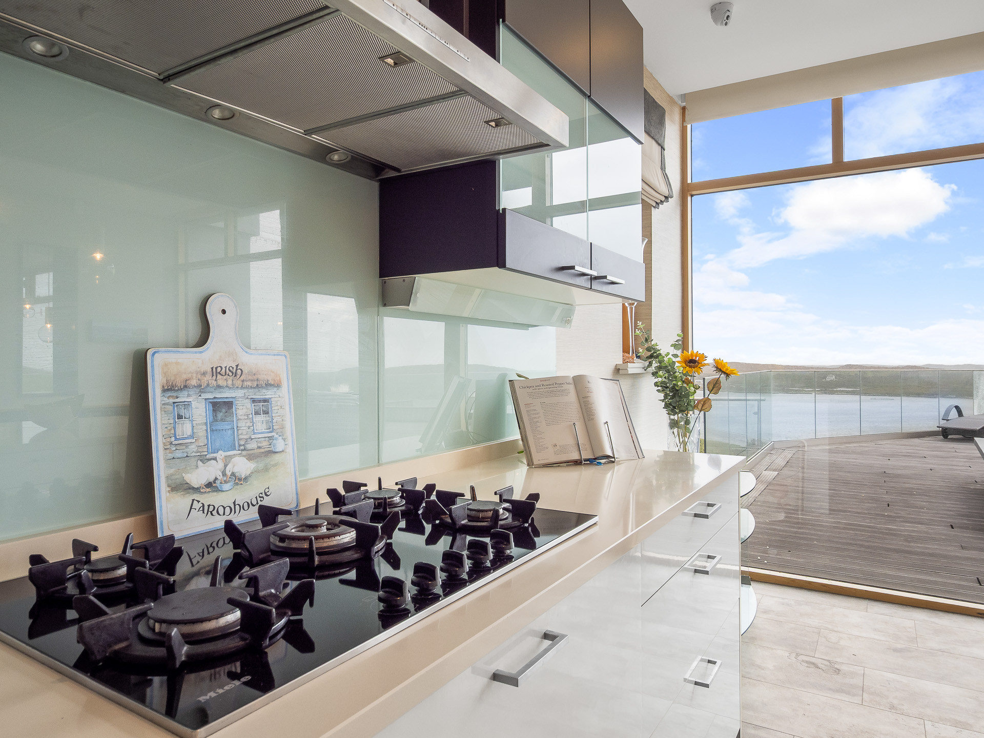 On the middle level, the kitchen, dining room and drawing room are all interconnecting. A double-sided wood burner forms a warm and inviting focal point, linking elegant living spaces perfect for both quiet relaxation and sophisticated entertaining. The fully equipped Poggenpohl kitchen is a culinary dream, stocked with everything you could possibly need, and opens onto a large dining table where unforgettable meals are shared against a backdrop of endless blue and green. Walls of glass turn every moment into a moving painting, from dawn’s soft golds to the fiery spectacle of Atlantic sunsets. Here, meals are more than sustenance; they’re centrestage events, set against some of the most cinematic views in Ireland.