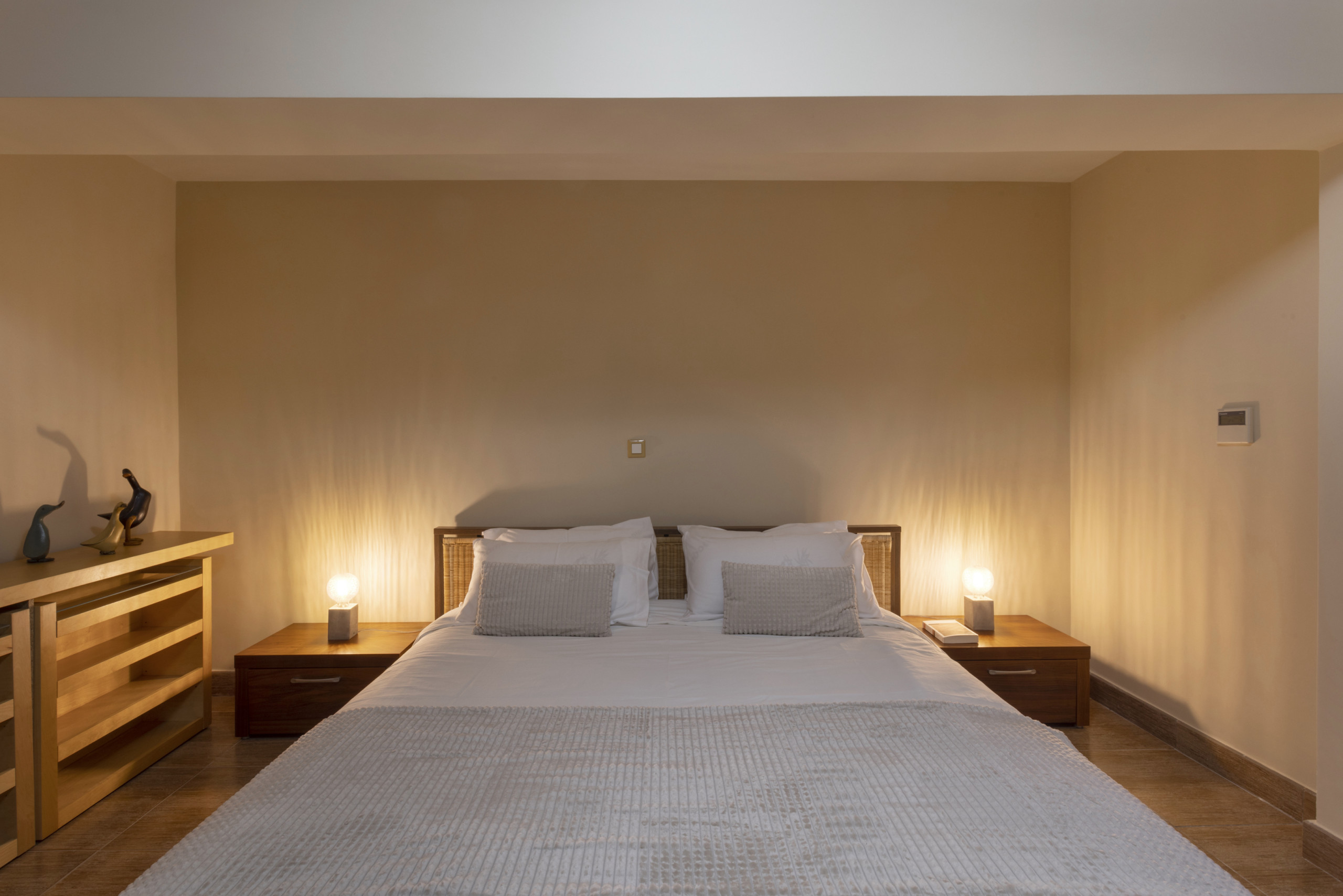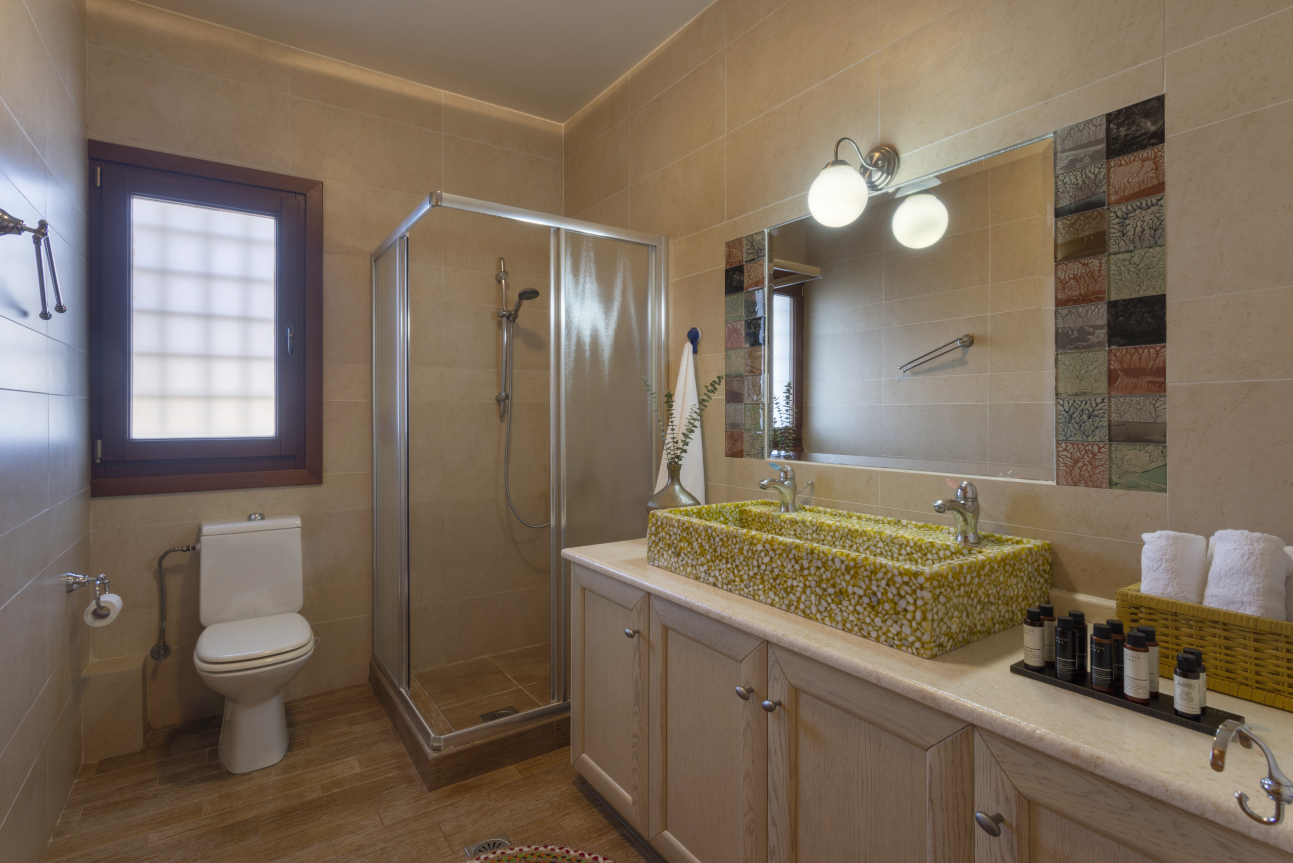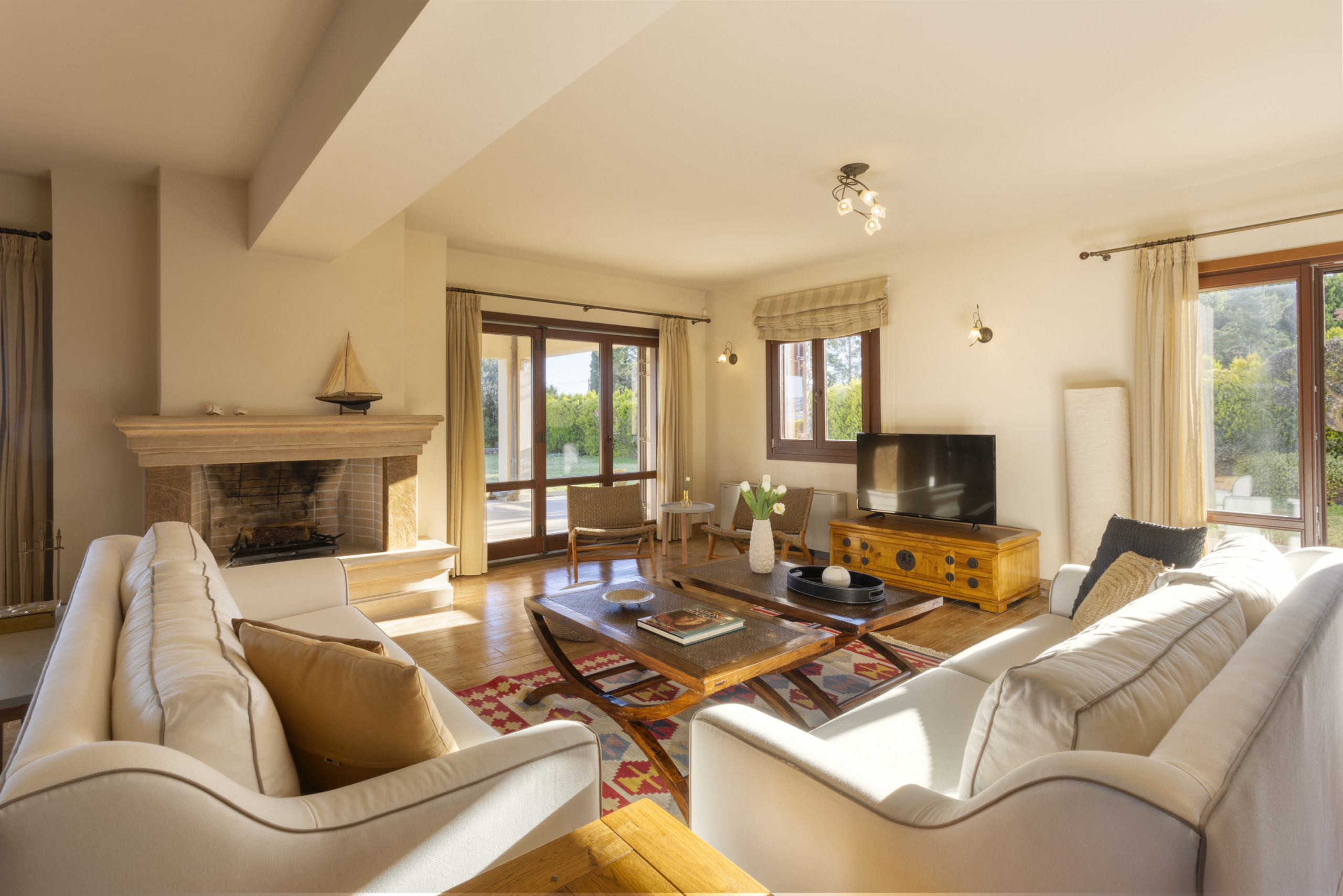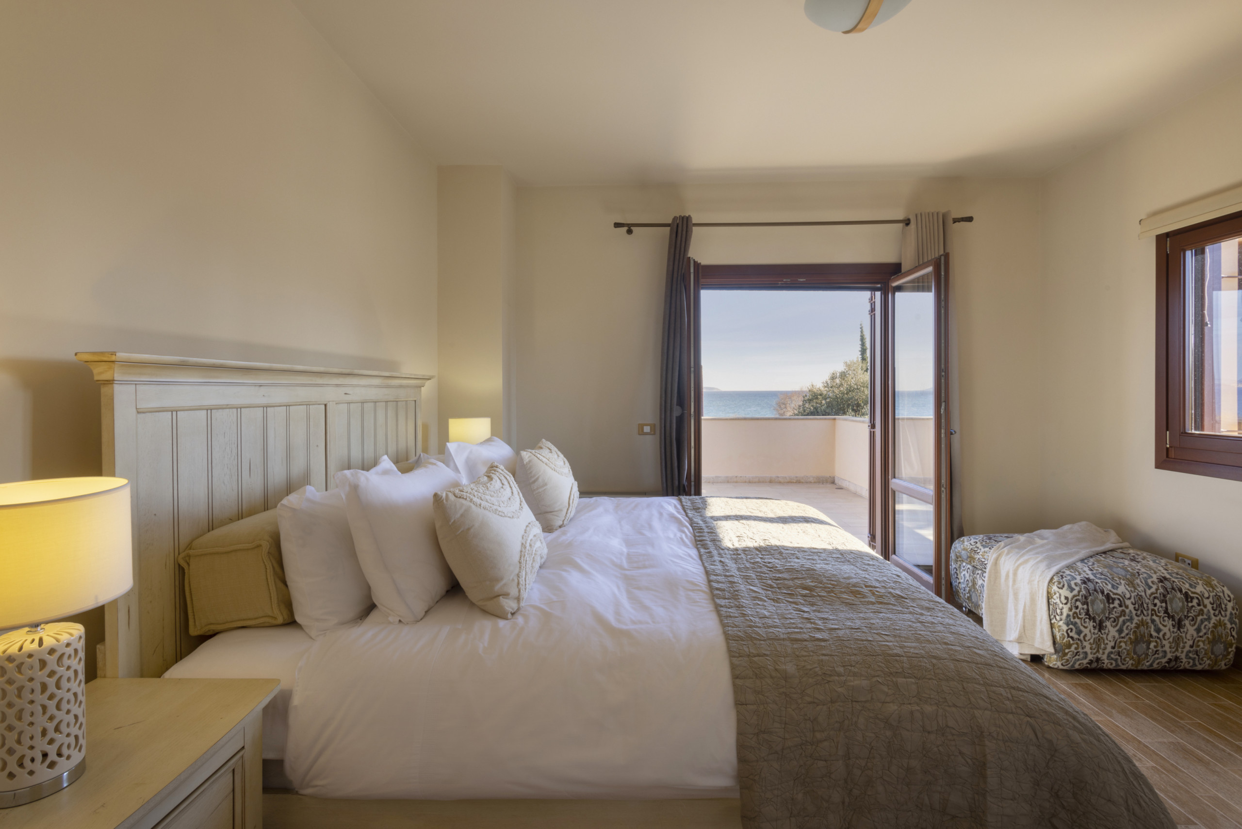 Spread across two levels, this private villa boasts an array of exceptional amenities. The upper level features a spacious living and dining room with a cozy fireplace and panoramic sea views. The fully equipped kitchen is perfect for preparing delicious meals, and a discreet guest bathroom adds convenience. The master bedroom on this level includes an en suite bathroom with a bathtub and a generous 50 sq.m private veranda, where you can savour your morning coffee while taking in the serene emerald waters.