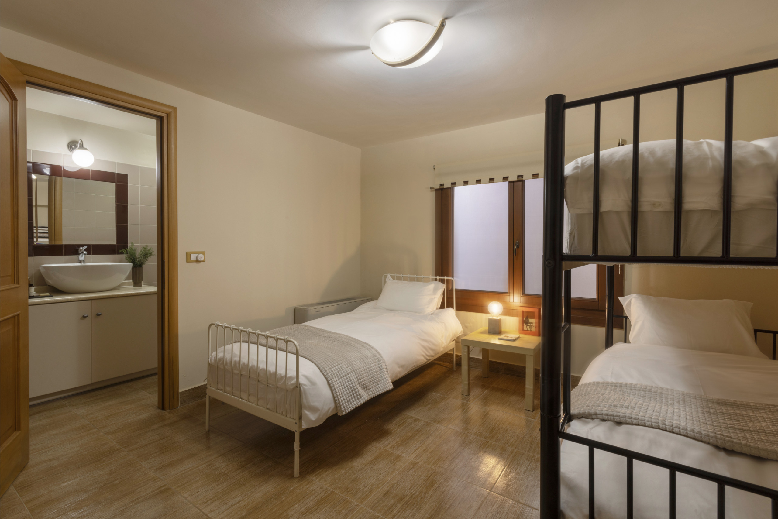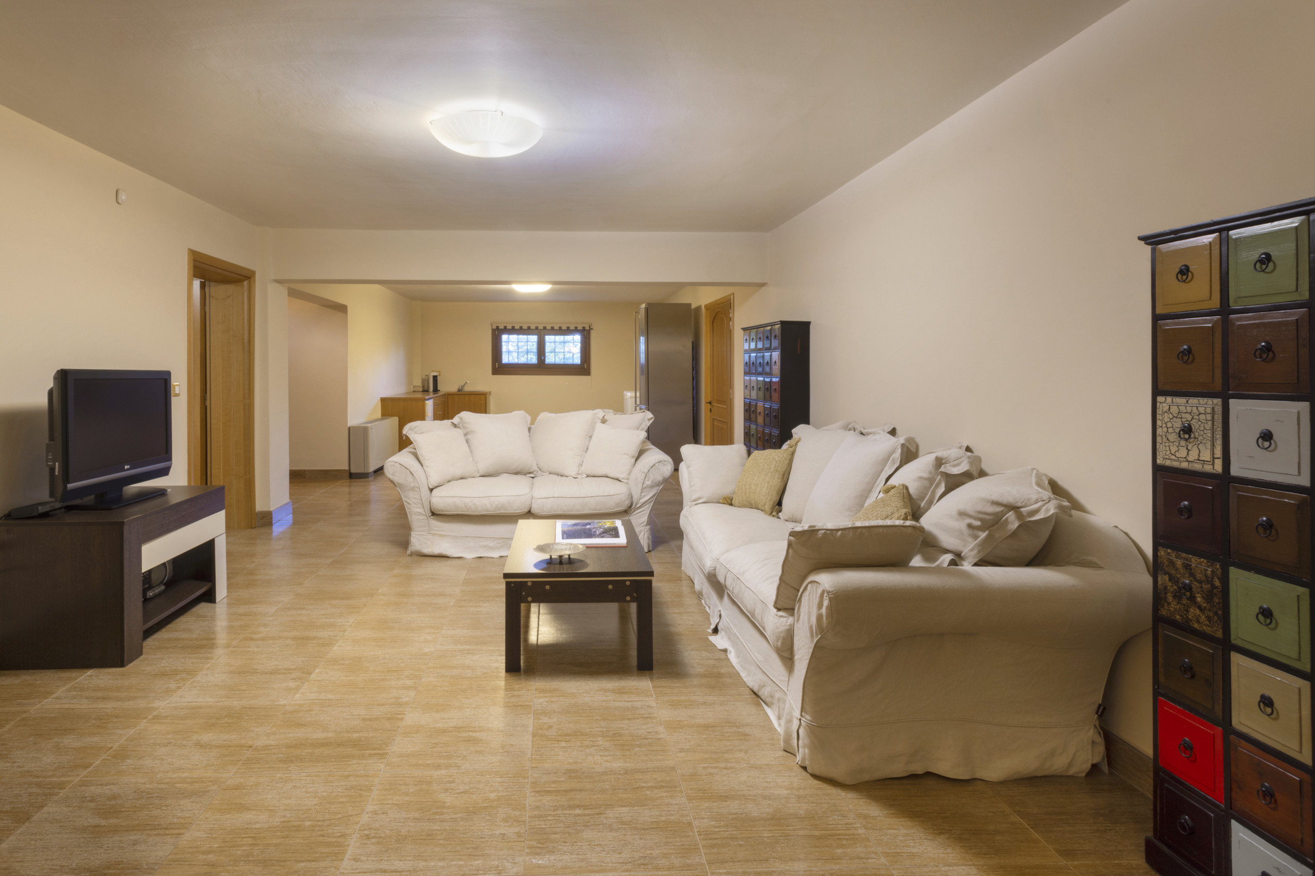 The lower level offers two double bedrooms with en suite bathrooms and direct access to the garden. Additionally, there is a playroom, a discreet guest bathroom, a laundry room, and a twin bedroom. For added privacy, an independent guest house features a double bedroom with an en suite bathroom and a fully equipped kitchen.