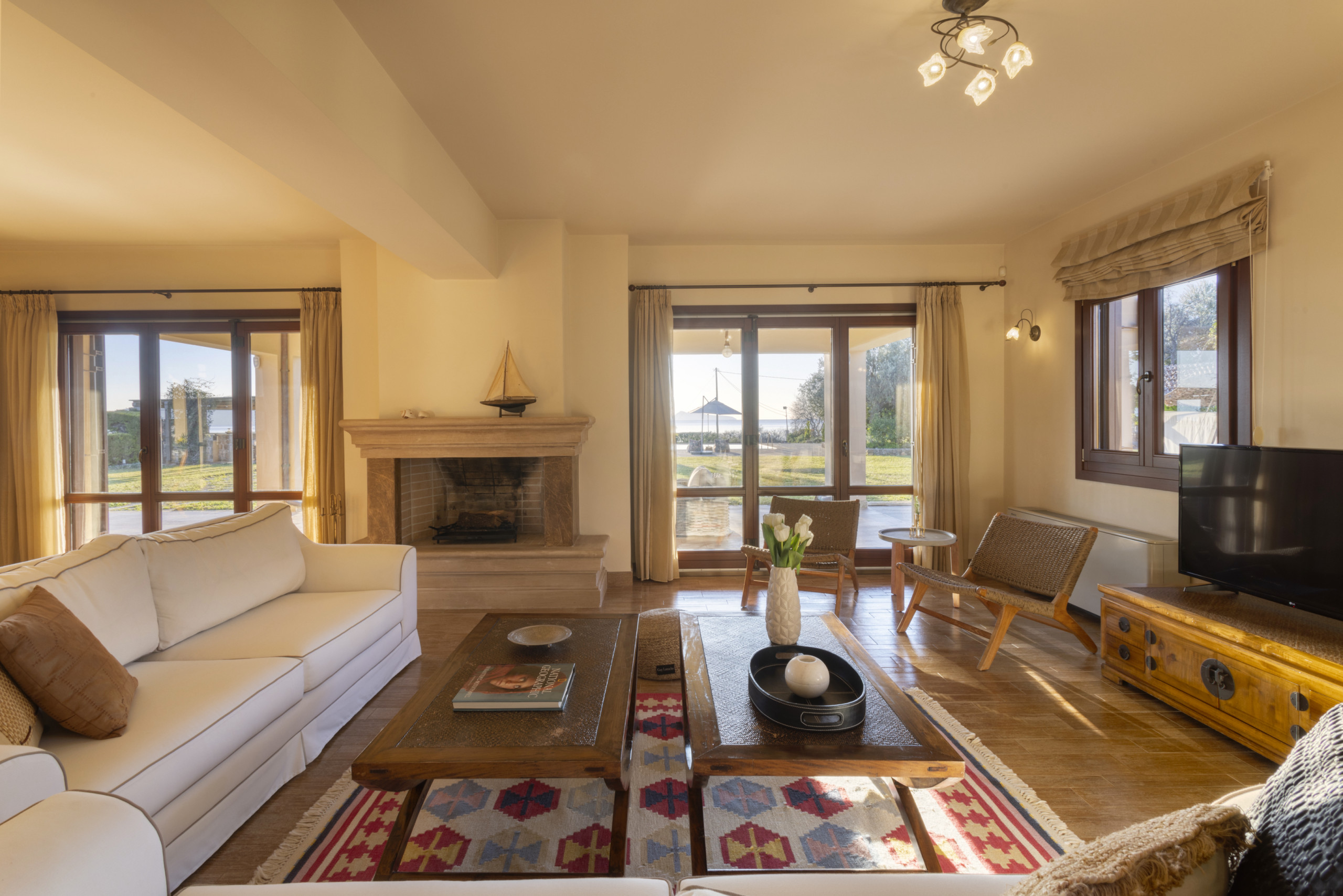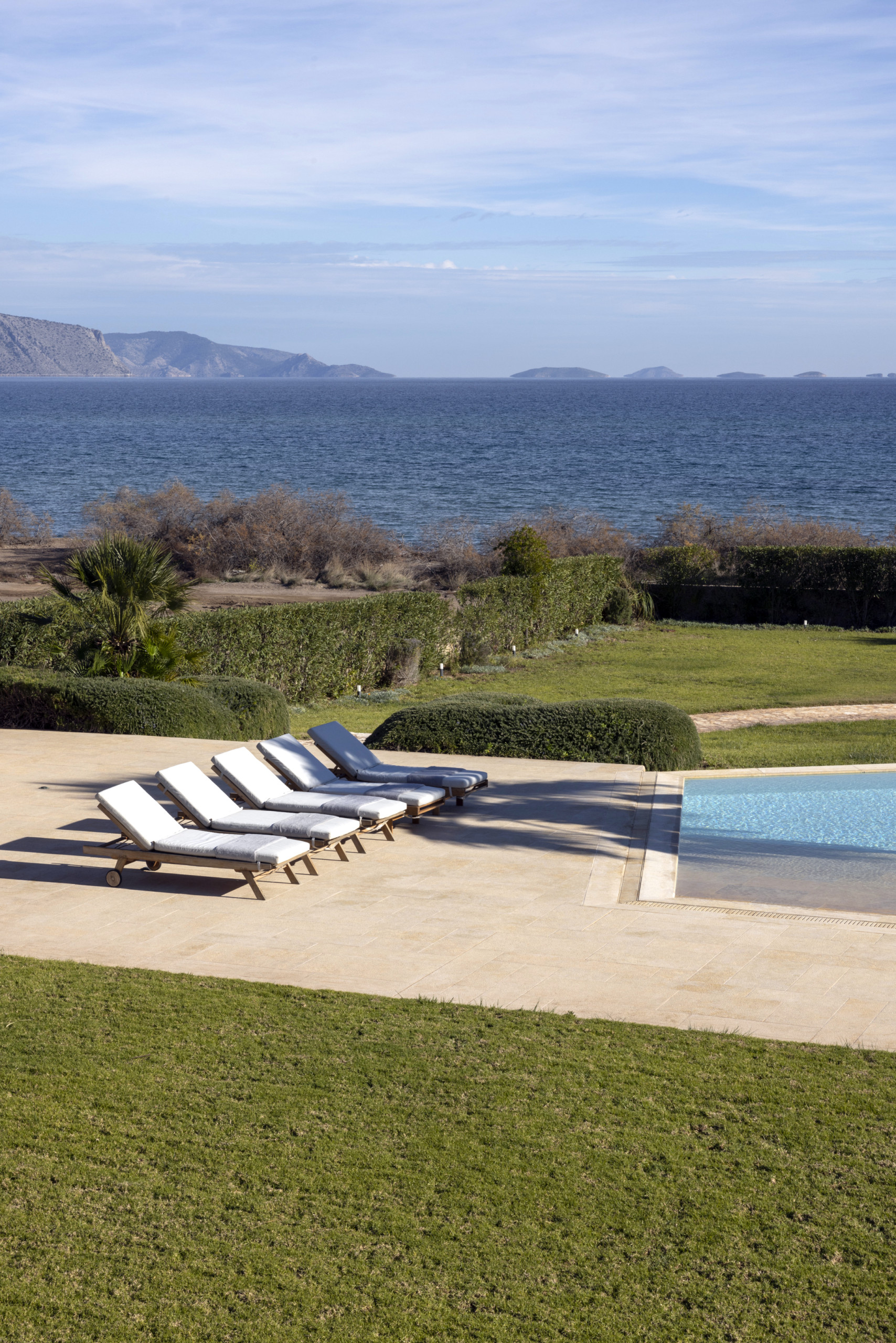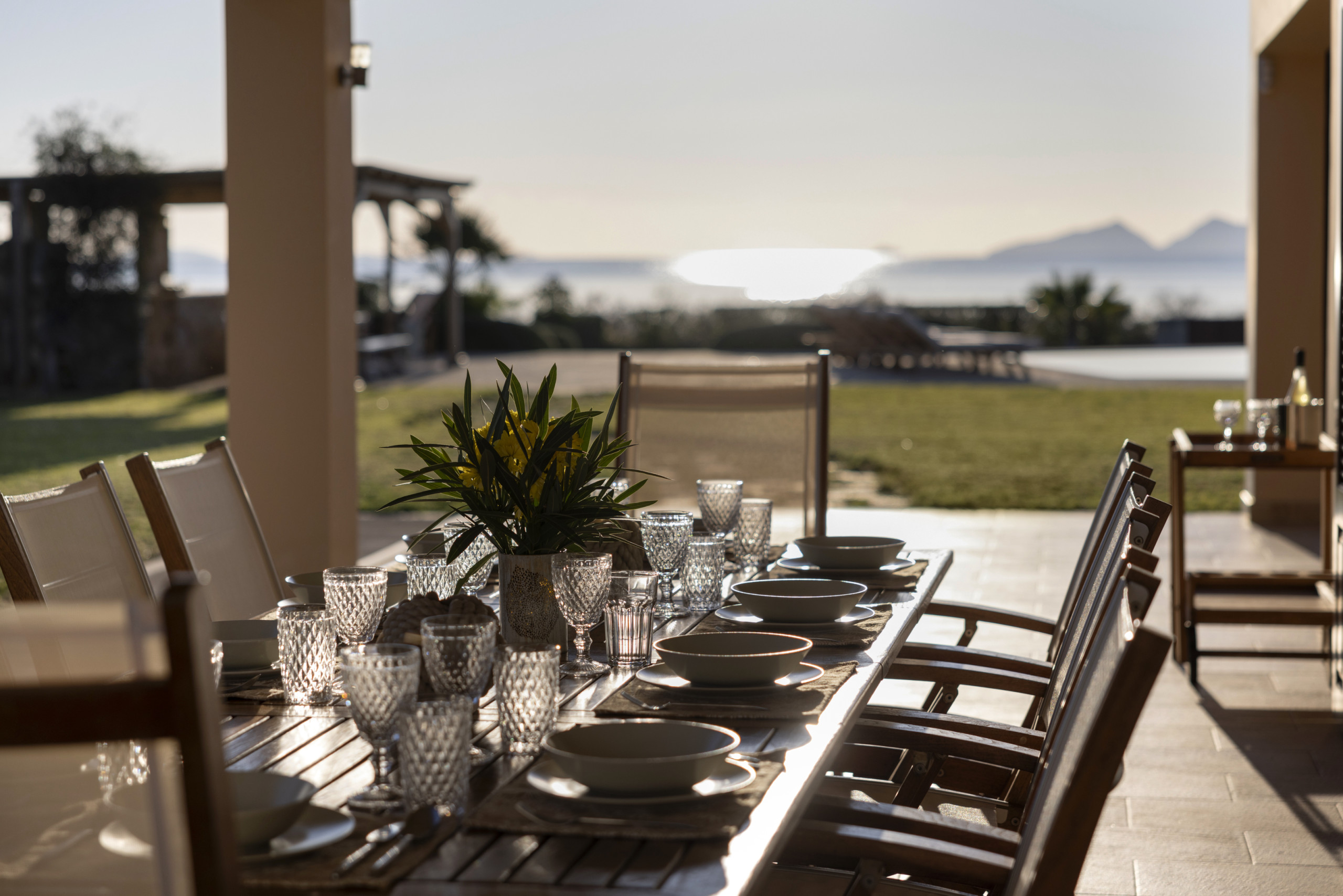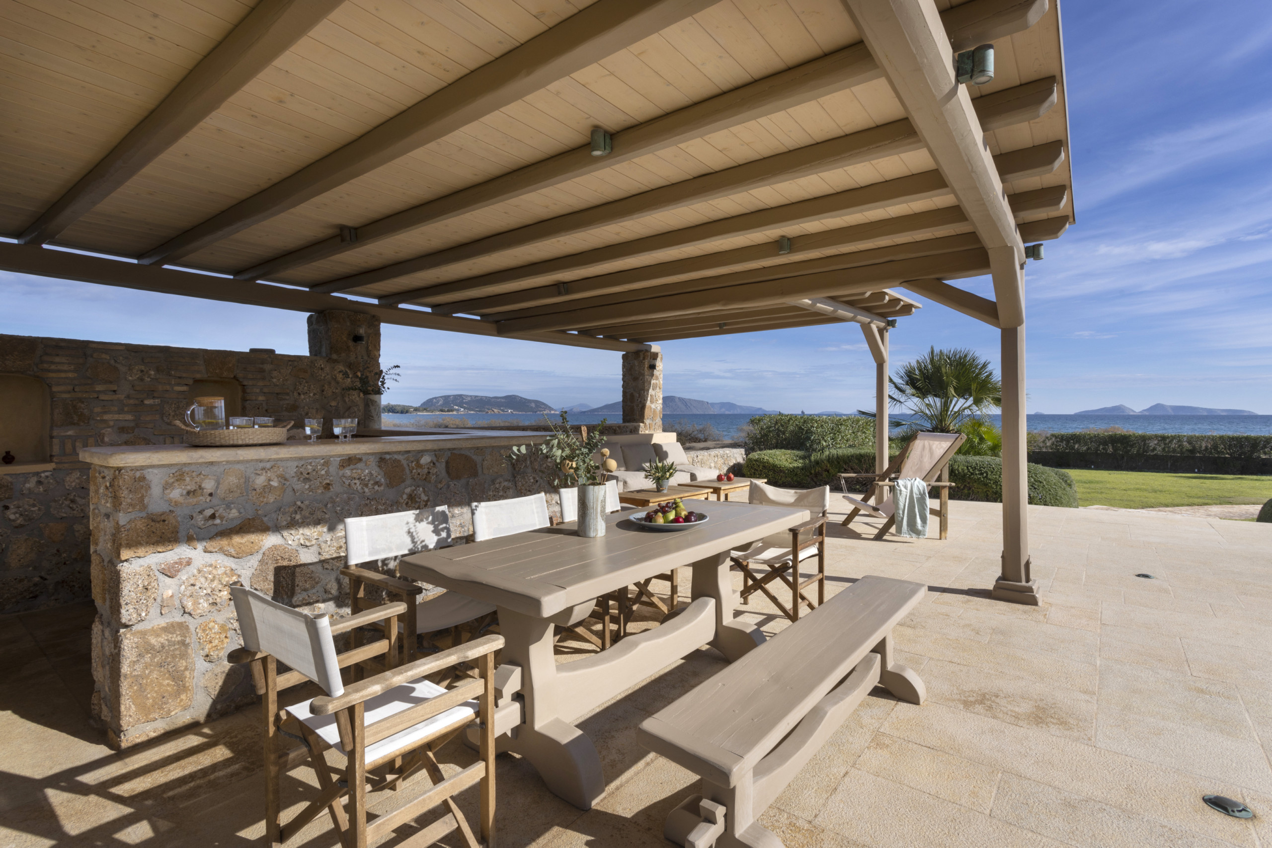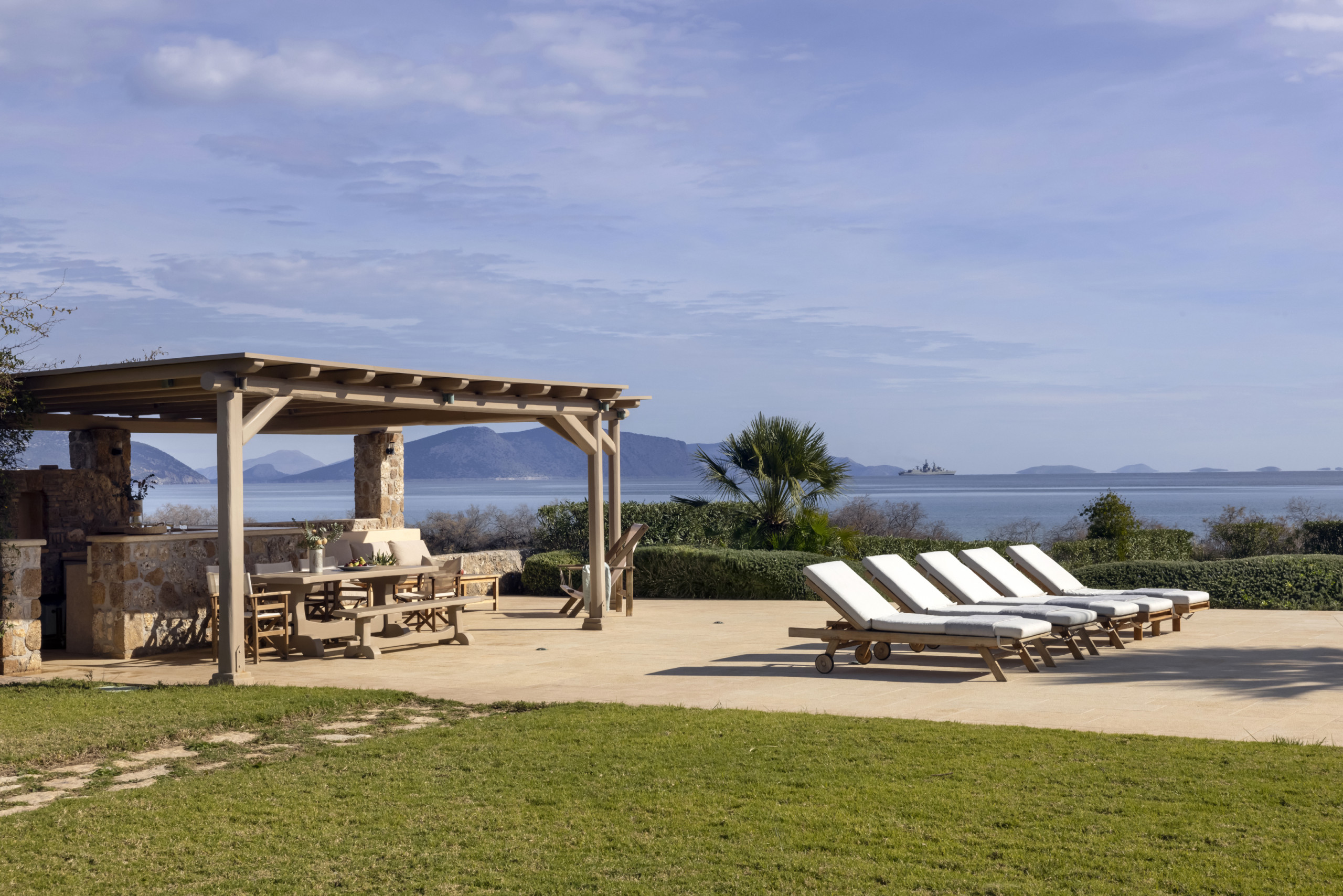 Outside, the villa boasts a generous outdoor space for you to enjoy. Immerse yourself in the 55 sq.m infinity pool, complete with sunbeds and umbrellas, while admiring the mesmerizing sea vistas. A shaded chill-out area with comfortable sofas is the ideal spot to witness the enchanting sunset. Indulge in relaxation at the pergola-covered lounge area with a bar, where you can savour a refreshing cocktail at any time of the day. The large sheltered BBQ area, adjacent to the outdoor dining and sitting area, features a long dining table that can accommodate numerous guests for unforgettable traditional Greek wood-fire BBQ dinners. Private parking and a beautifully landscaped garden complete the outdoor oasis.