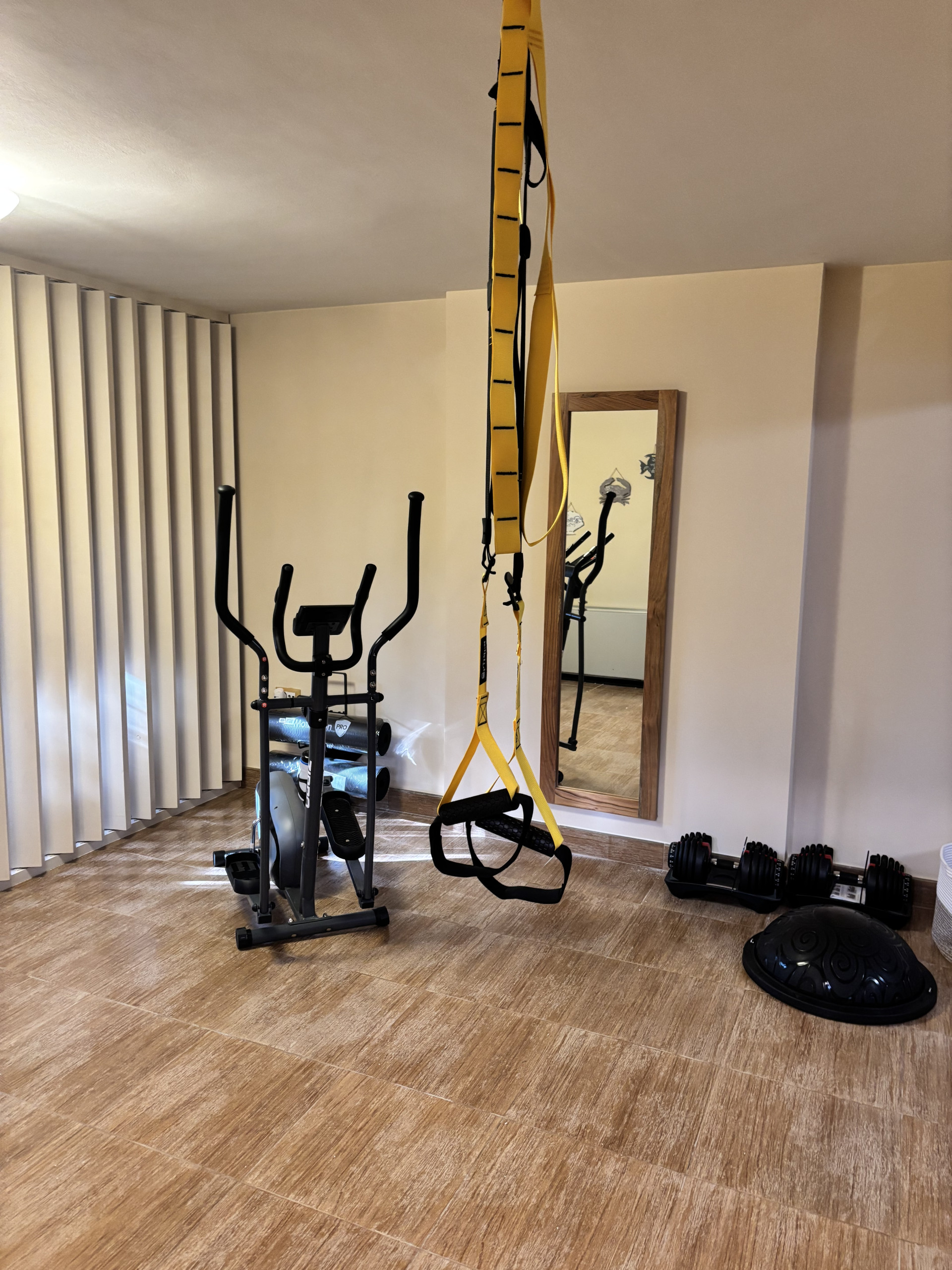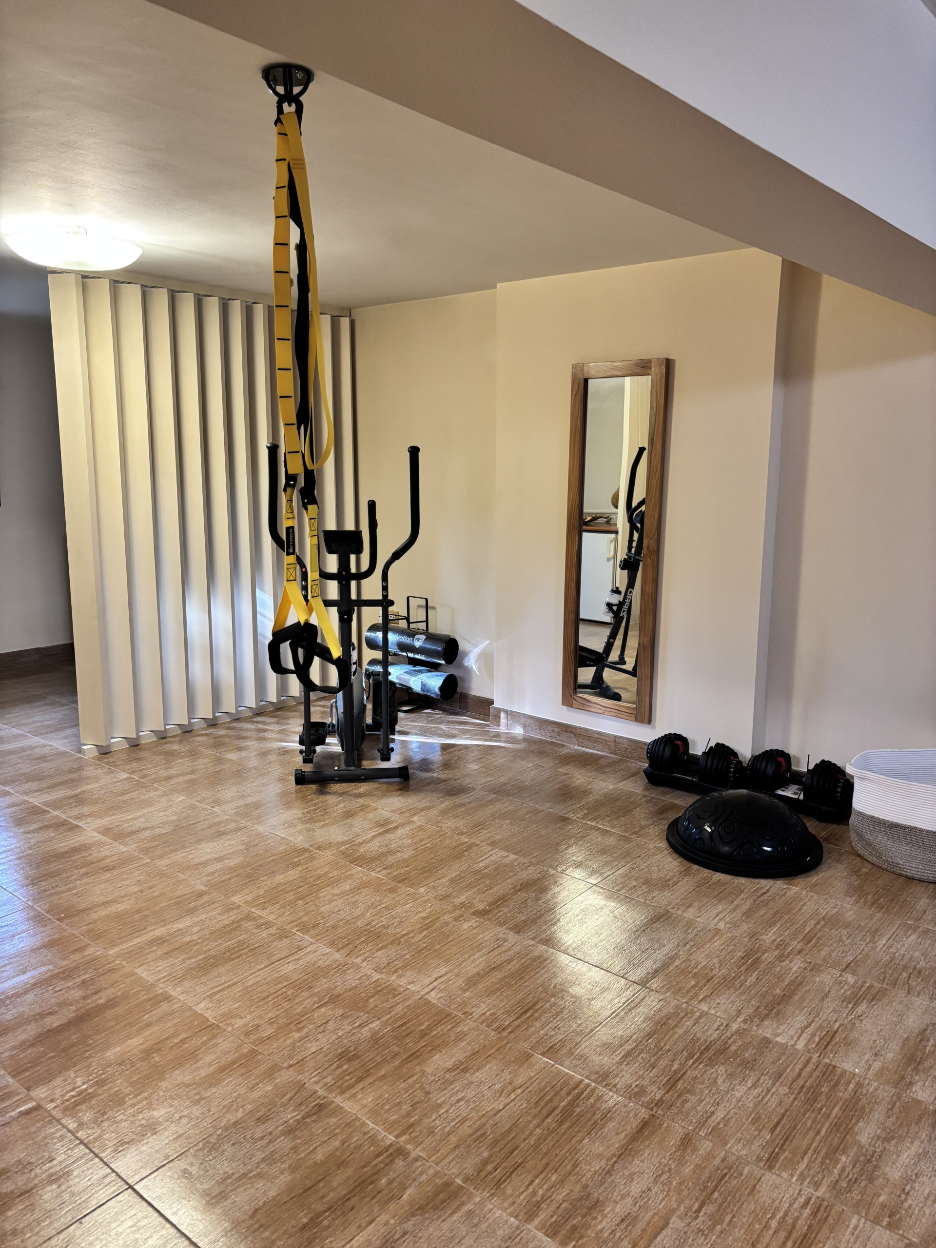 Enjoy the convenience of a new basement mini gym with weights, TRX, and a cross trainer, along with a 65" home cinema setup for relaxing movie nights.
