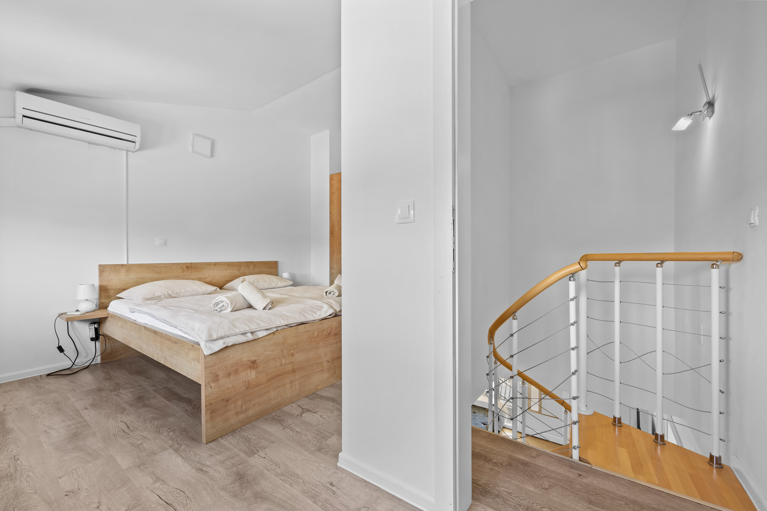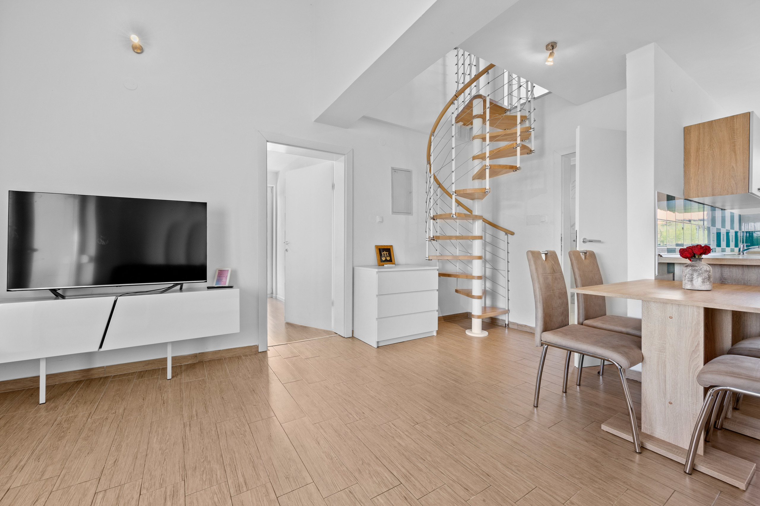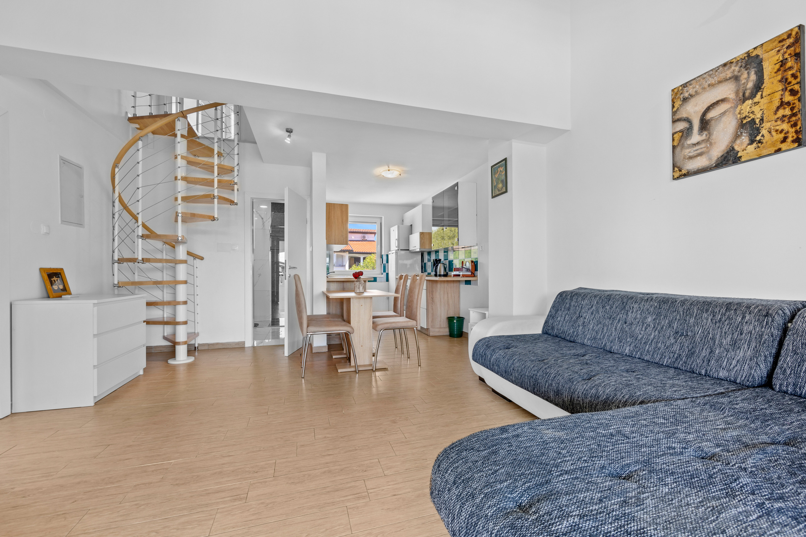 The first floor also has a kitchen and living room, as well as two bedrooms and two bathrooms. Via a staircase, you can access another bedroom in the attic, which is a perfect sleeping spot for children.
