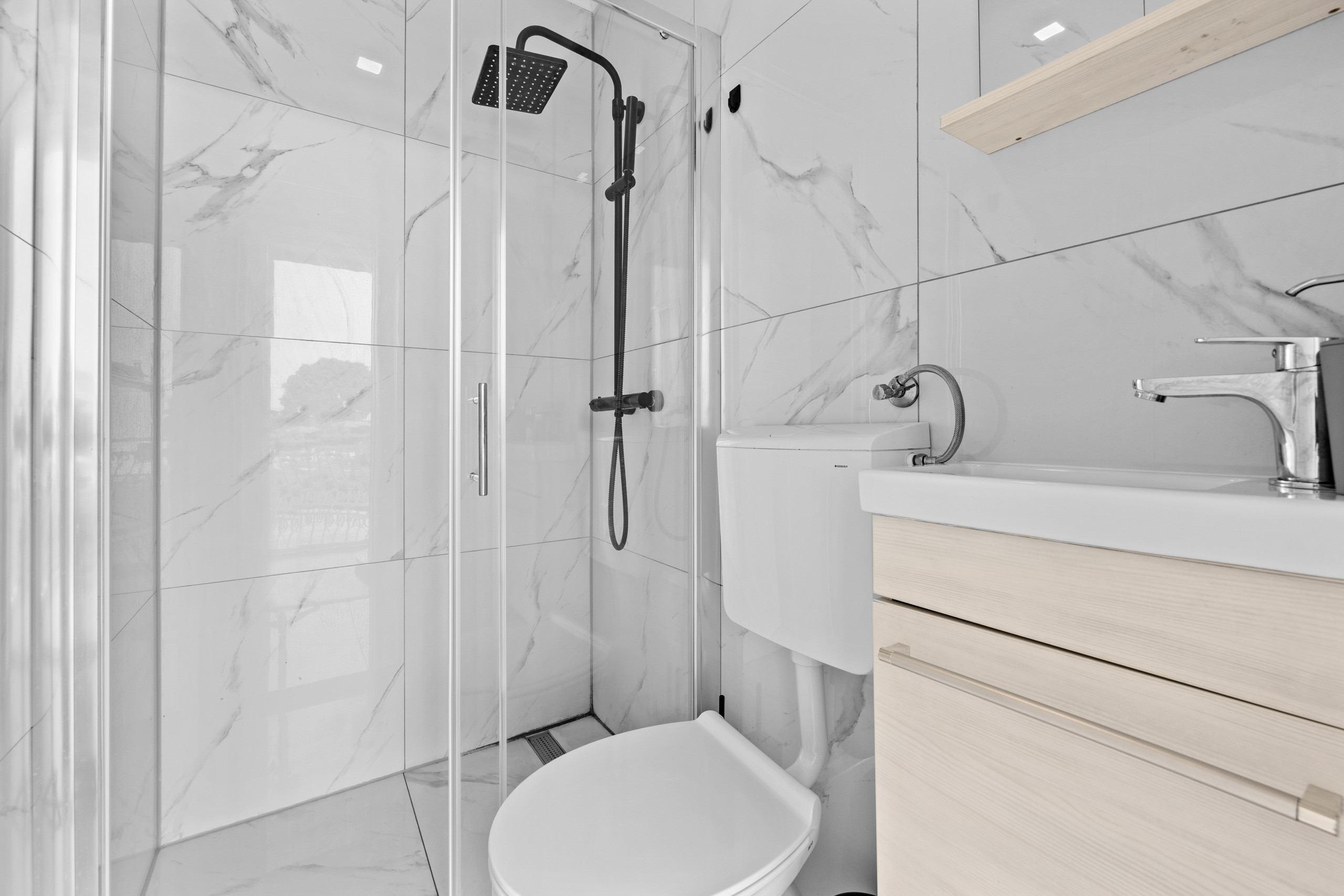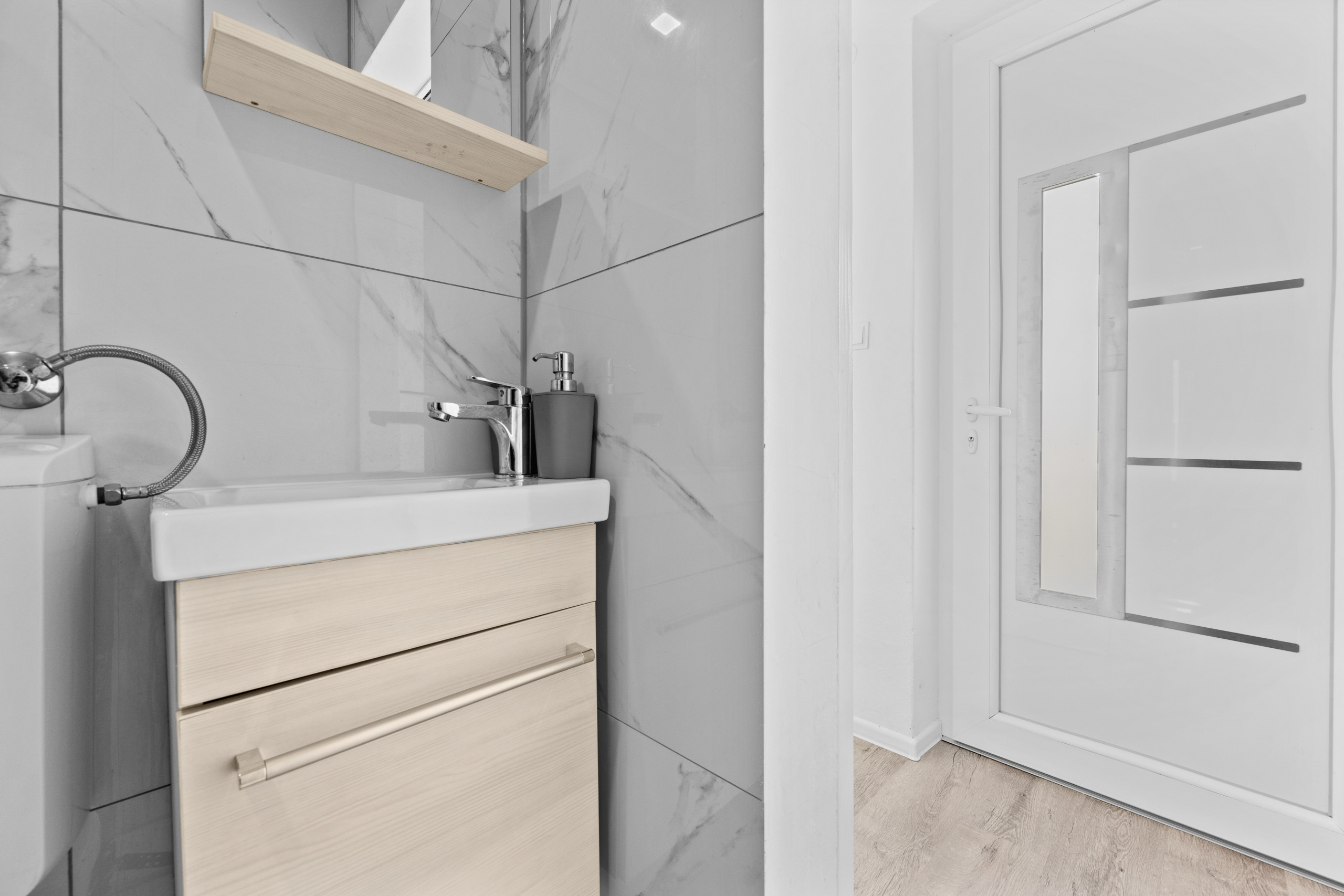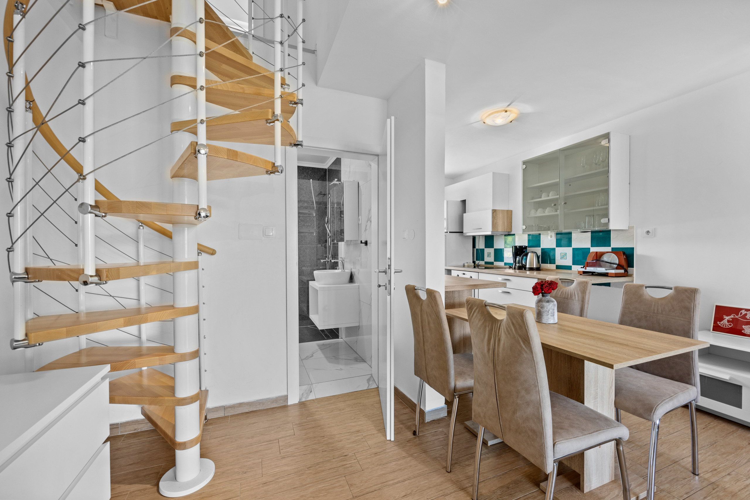 The first floor also has a kitchen and living room, as well as two bedrooms and two bathrooms. Via a staircase, you can access another bedroom in the attic, which is a perfect sleeping spot for children.