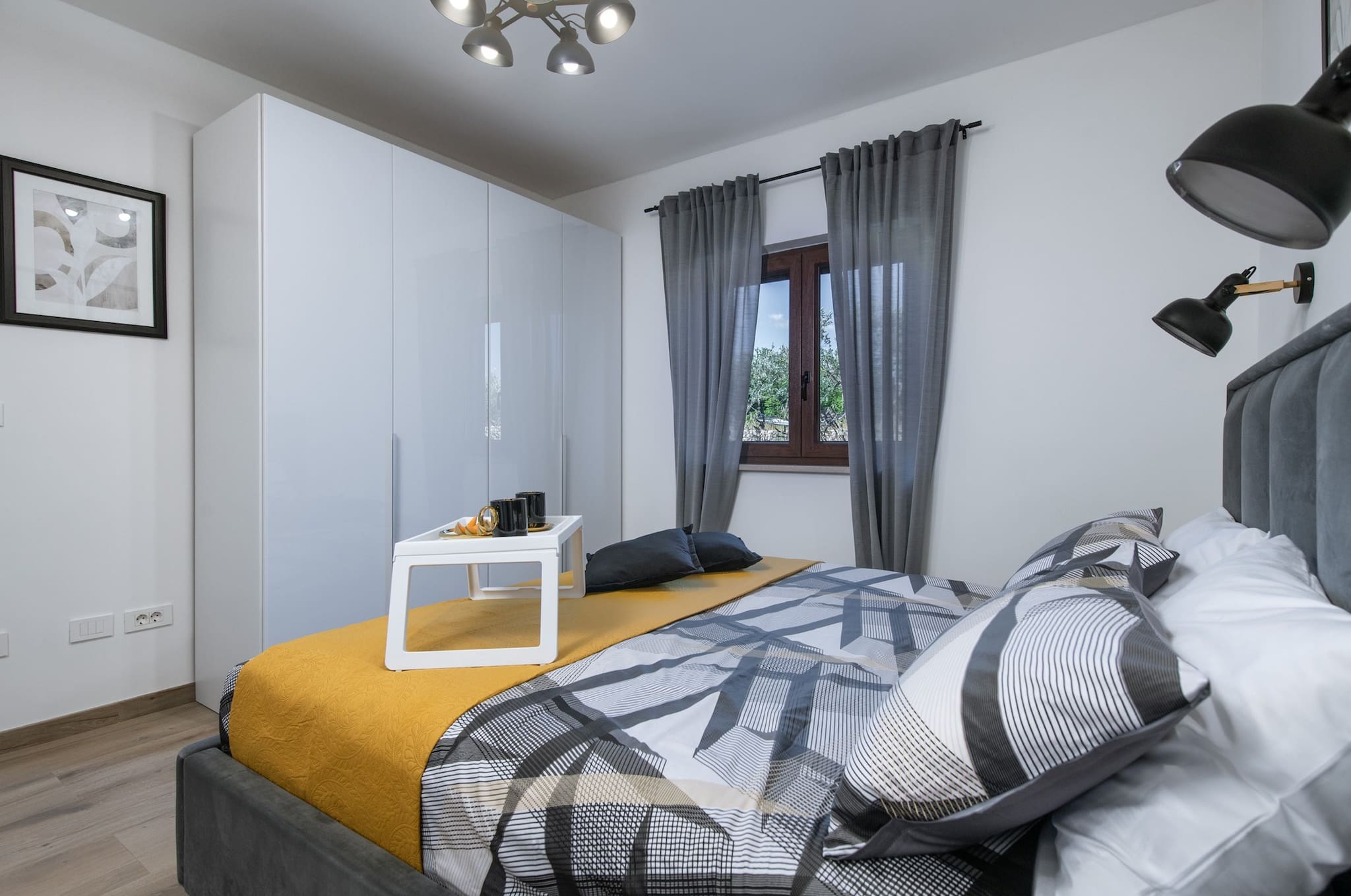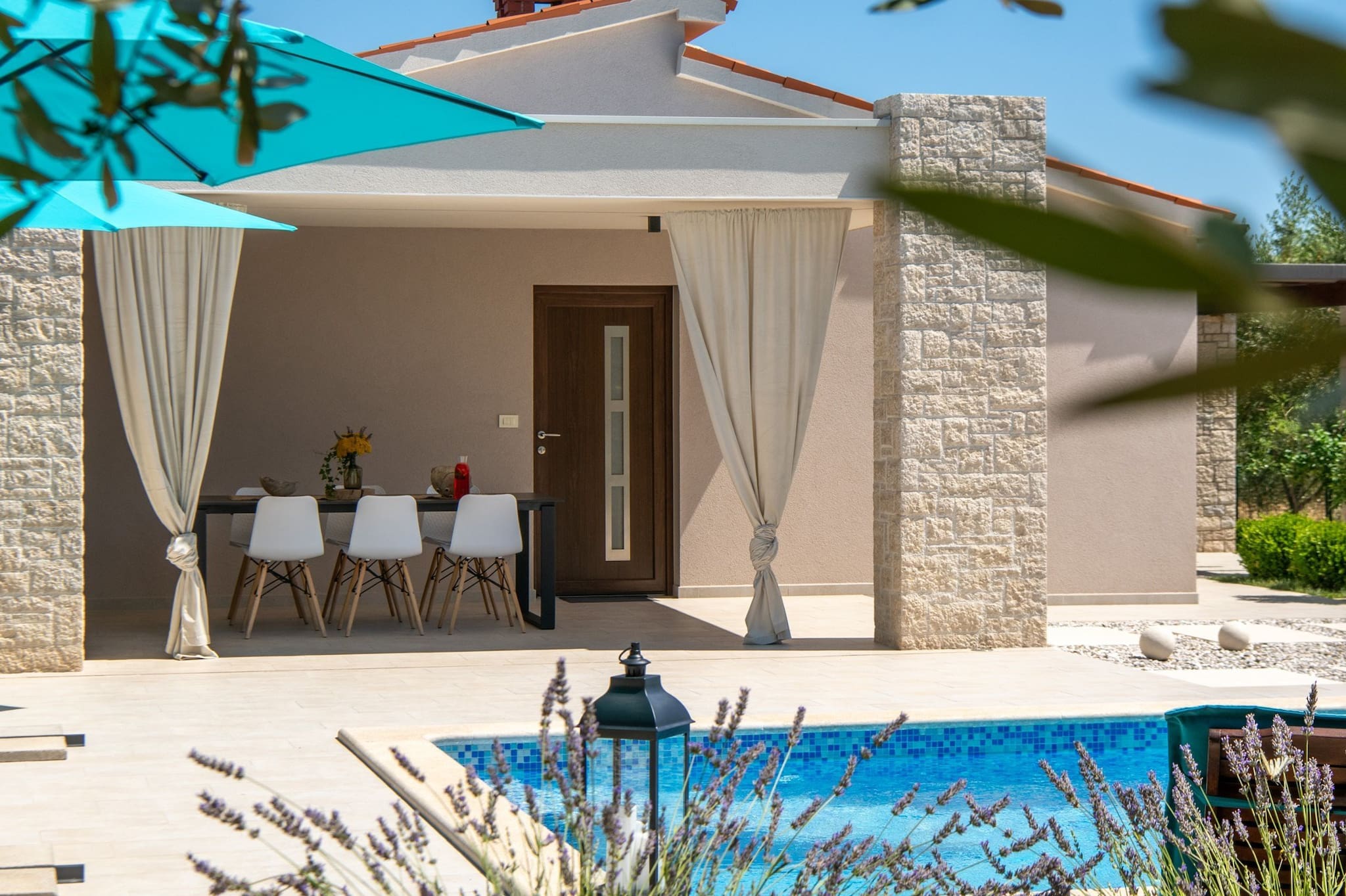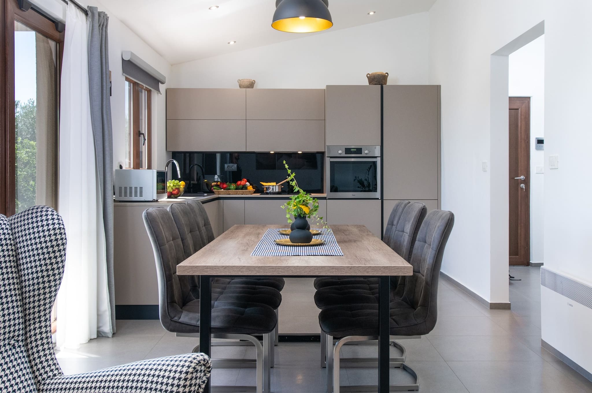The villa is entirely located on ground floor. Living room and kitchen are tastefully decorated in neutral tones.